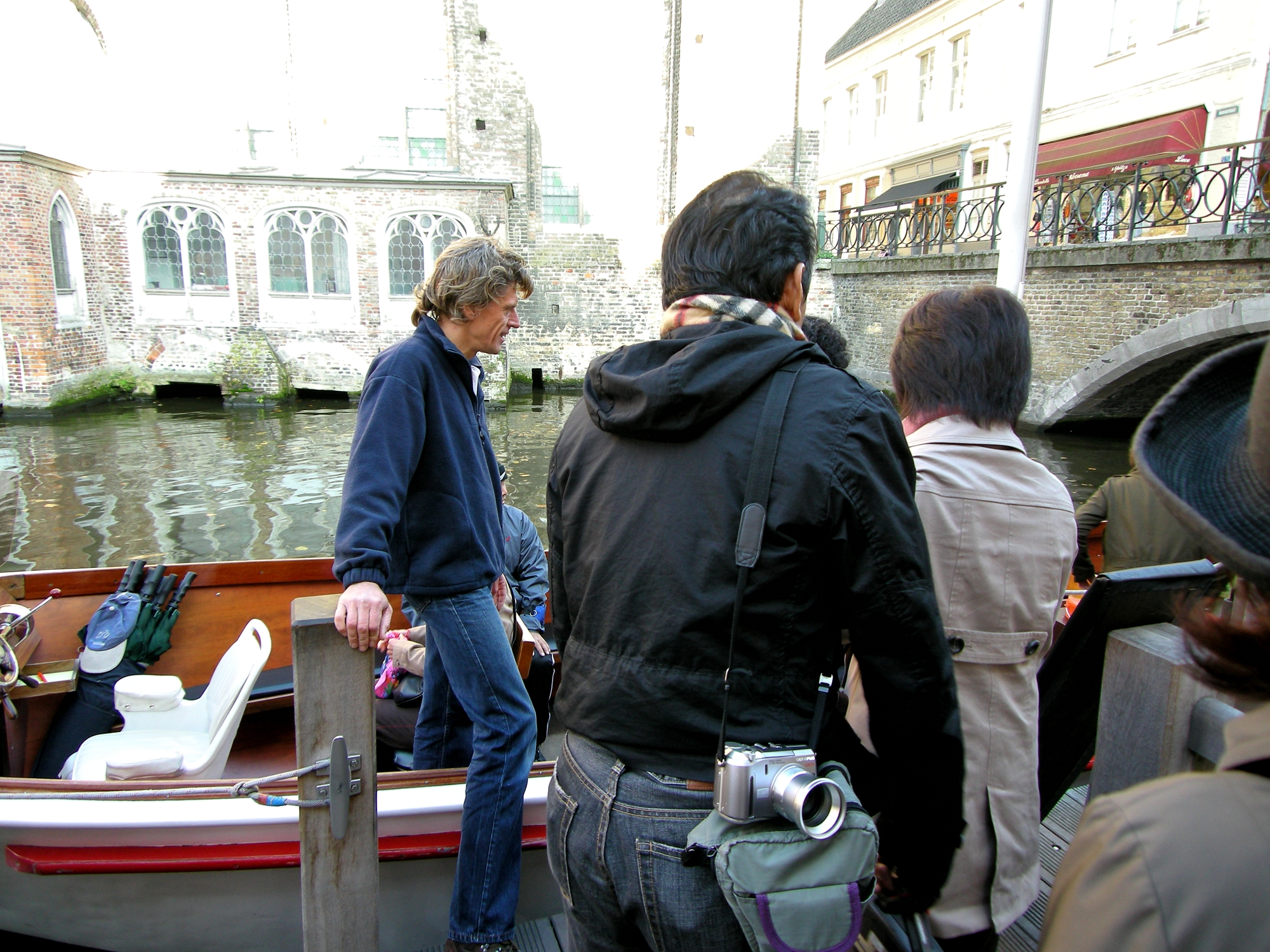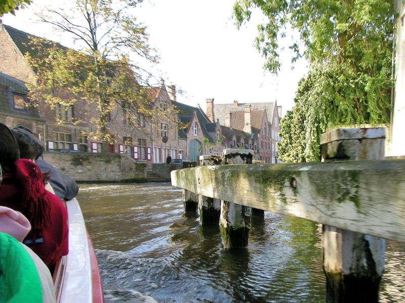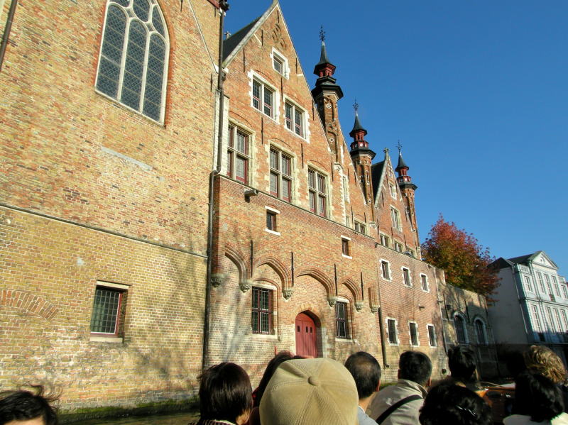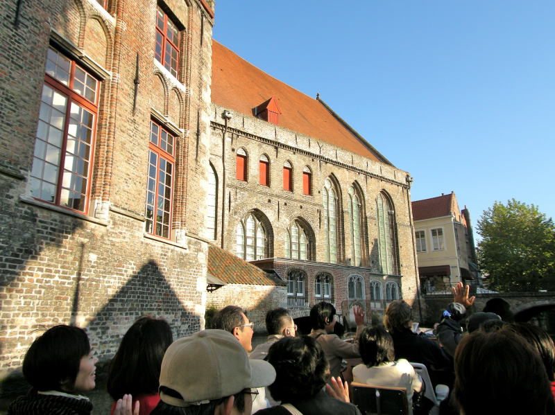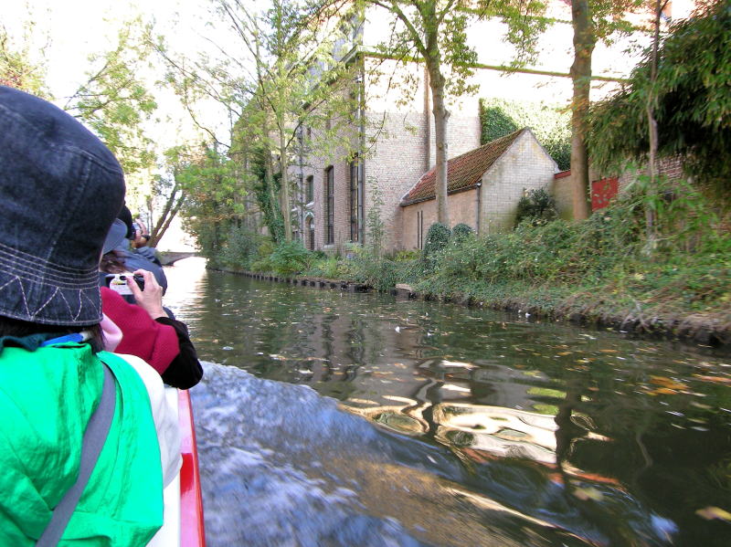 | 運河 "Bakkersrei" をクルーズ(10:43) 手前に見える建物は "セントジョンズ病院" [Sint-Janshospitaal] 、その向こうに見える塔は "聖母教会" [Onze Lieve Vrouwekerk] 。 「北東」MAP Lay.1f |