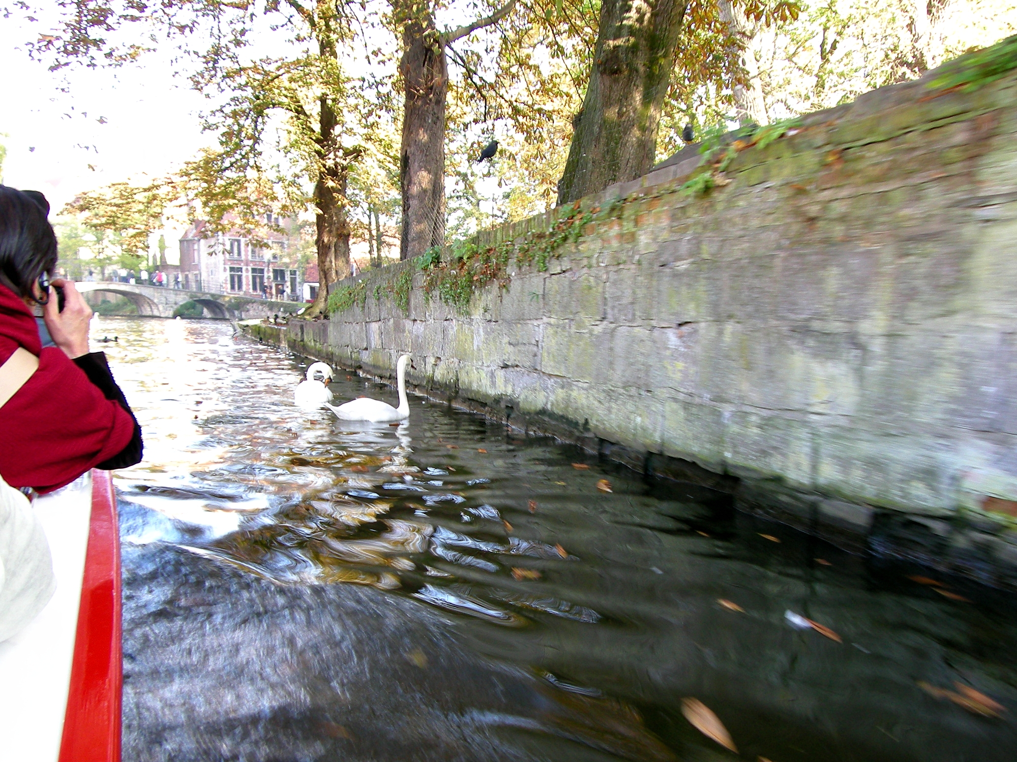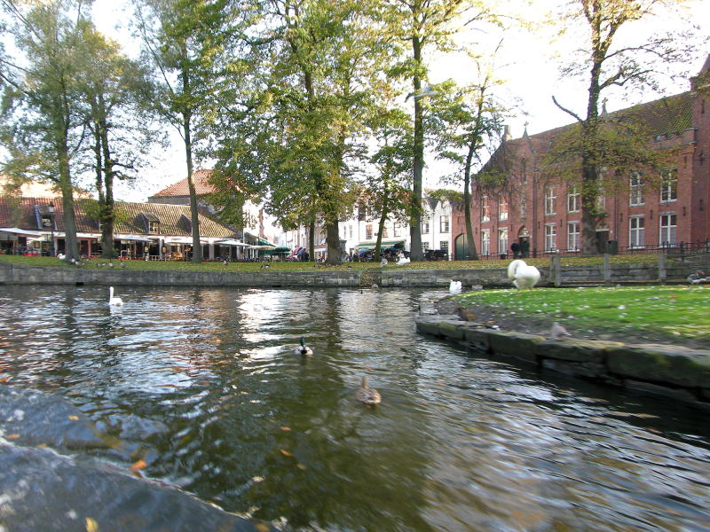 | 運河 "Bakkersrei" をクルーズ(10:47) 白鳥が遊ぶ "愛の湖公園" [Minnewaterpark] 。 「北東」MAP Lay.1j |
