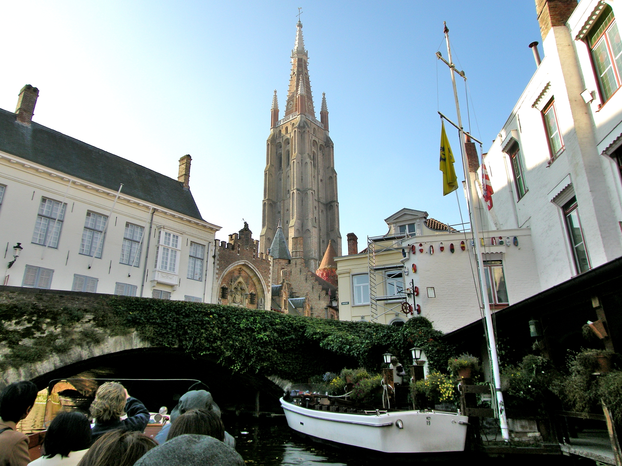 | 運河 "Bakkersrei" をクルーズ(10:45) 遊覧船から見る、聖母教会 [Onze Lieve Vrouwekerk] 。 13~16世紀に建てられた教会で、何度も改修が加えられたため、多くの建築様式が混在している。 教会内部にある白大理石でできたミケランジェロ作 "聖母子像" [Madonna met Kind] が有名。 「西」MAP Lay.1q |