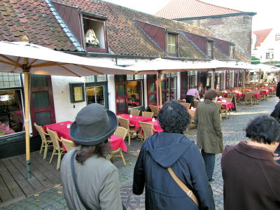 | マルクト広場に面して立ち並ぶレストラン(09:30) 切妻屋根をもつ建物は、かつてギルドハウスだった。 「西」MAP Lay.1H |