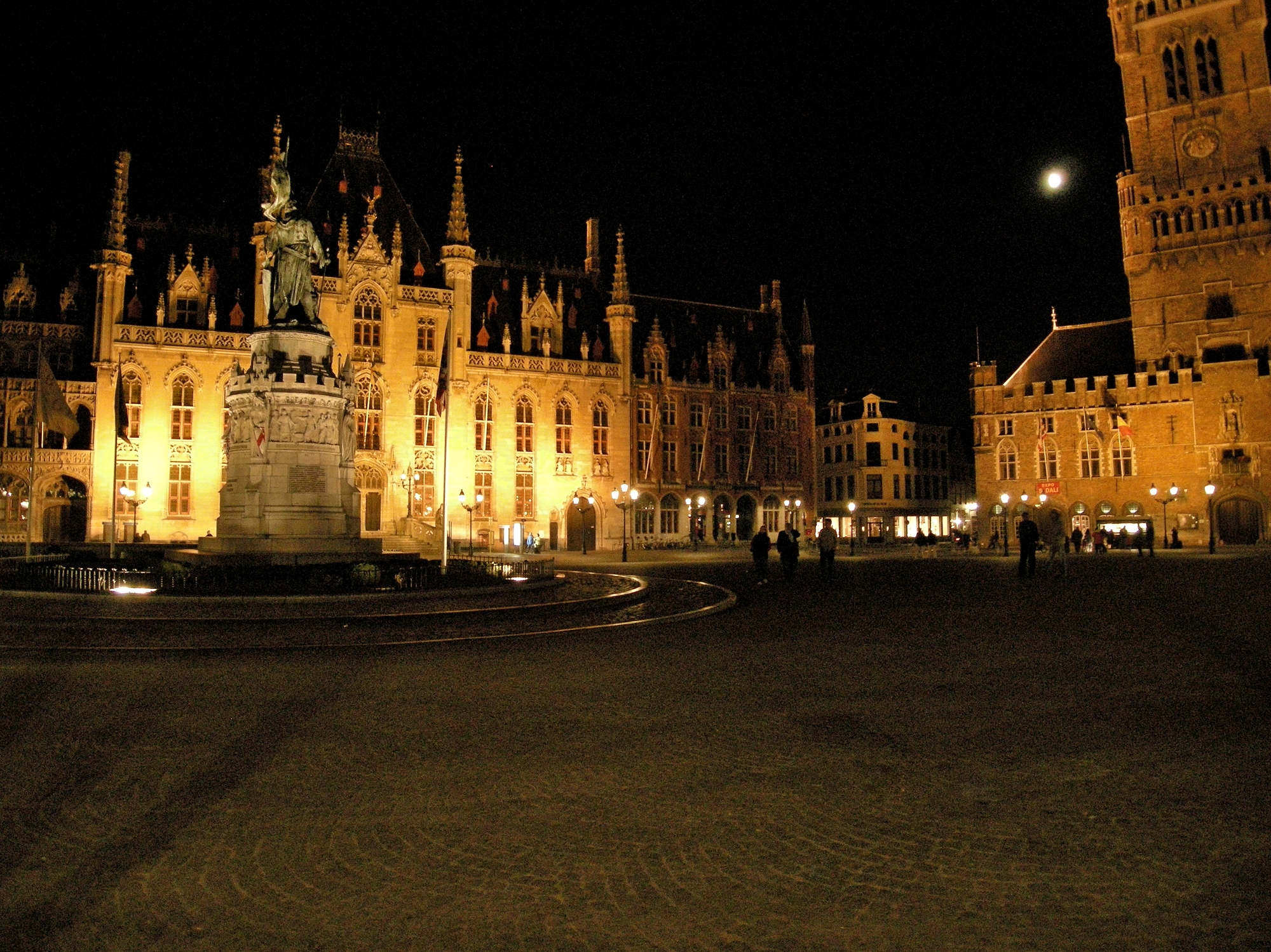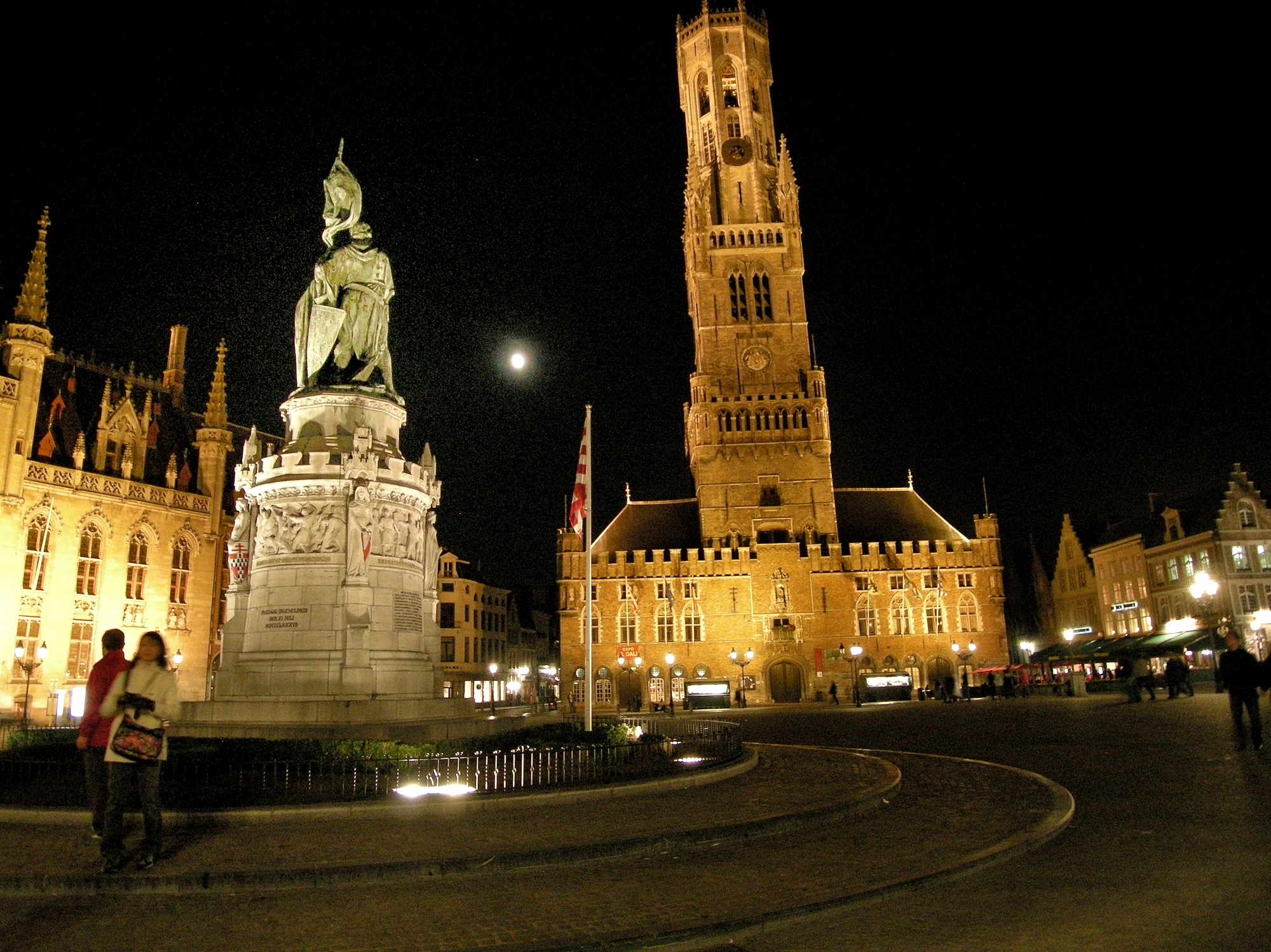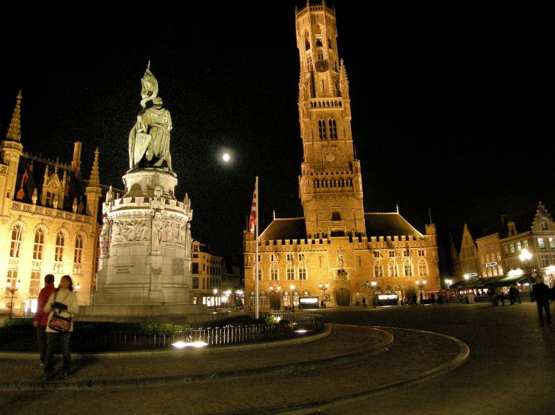 | マルクト広場 [Markt](19:39) 左に見える像は、14世紀初頭のフランスの圧政に抵抗した市民の英雄、"ヤン・ブレイデル" と "ピーター・ド・コニング" [Jan Breydel en Pieter de Koning] の銅像。 「南東」MAP Lay.3S |