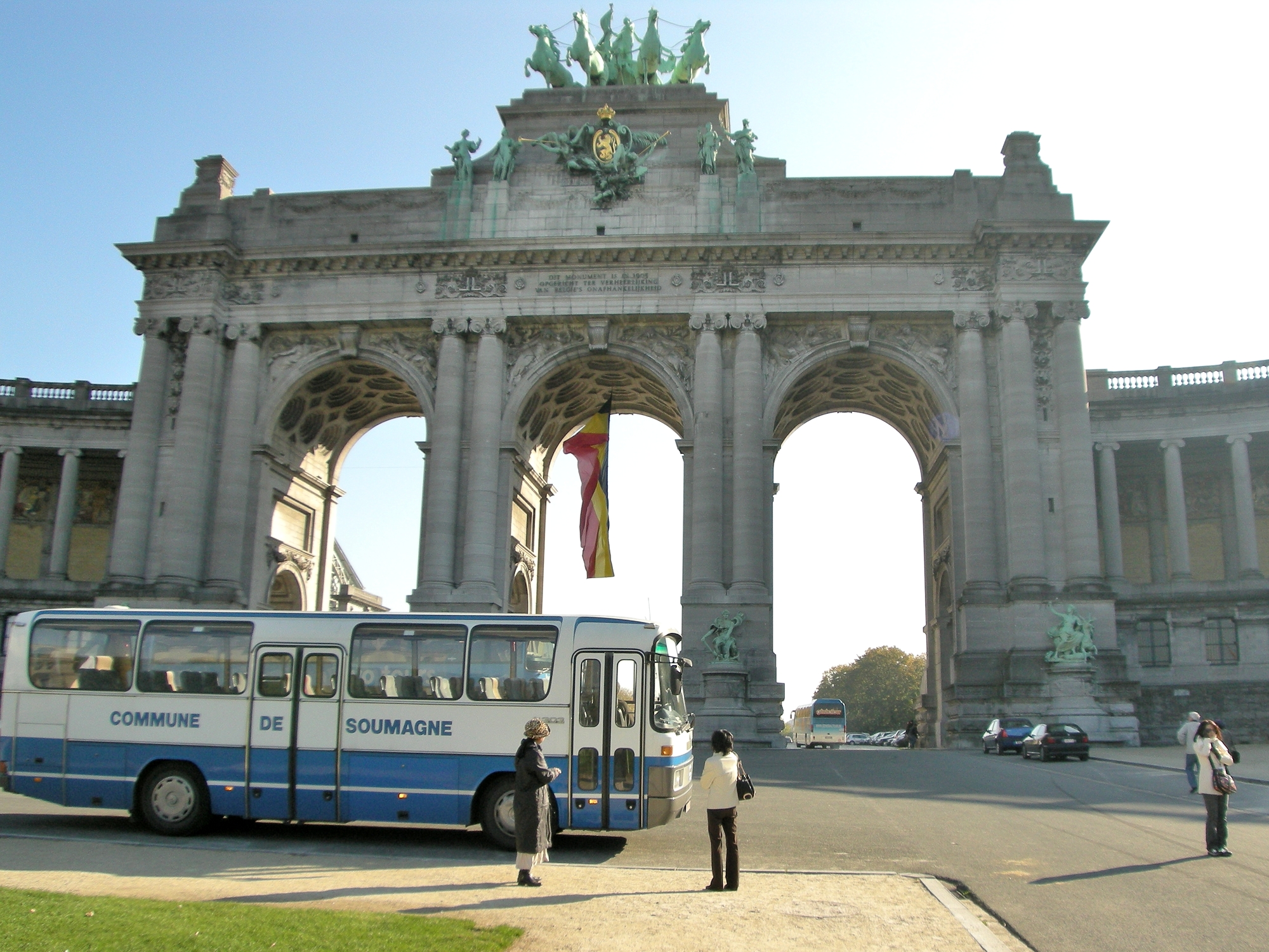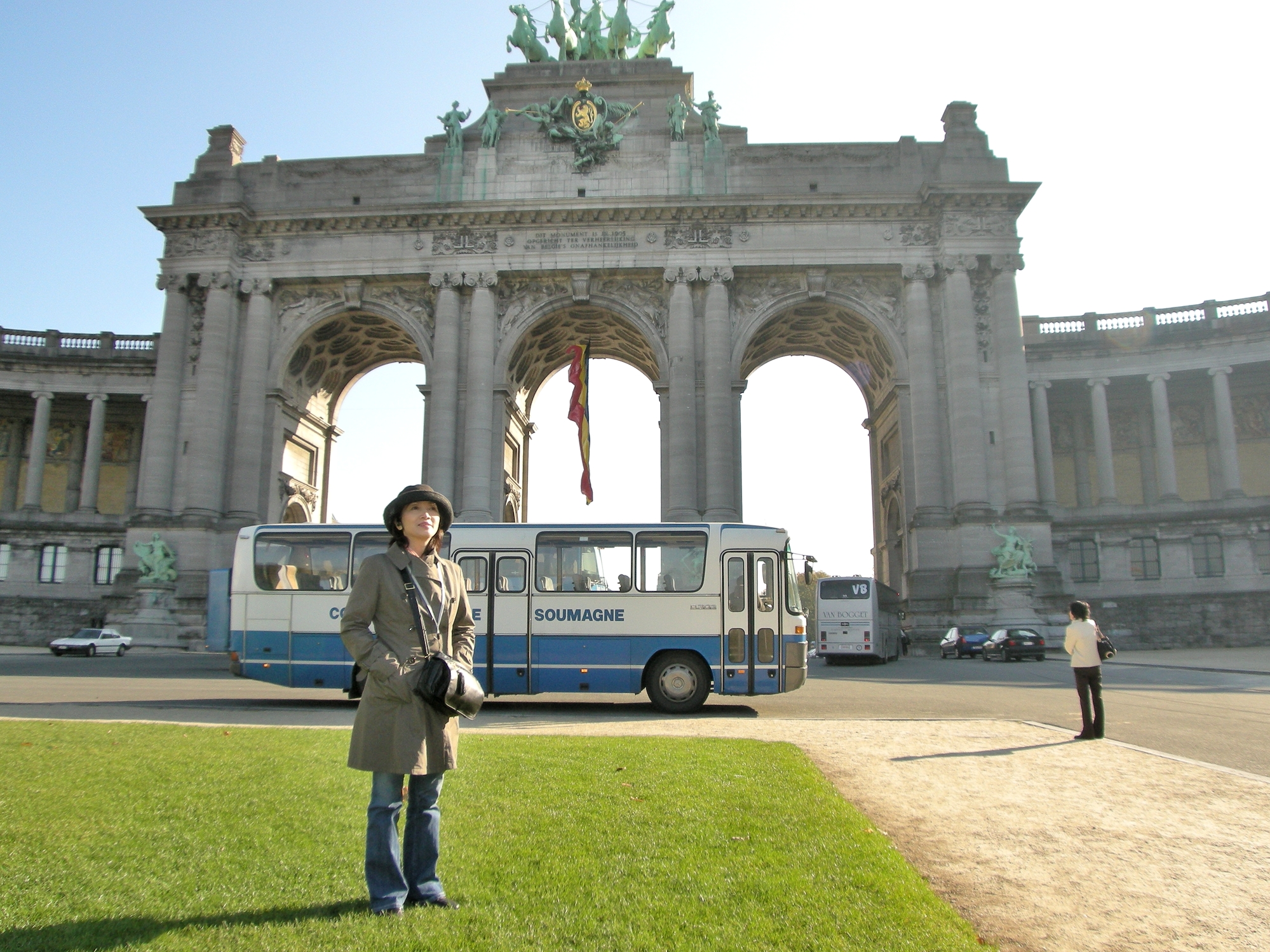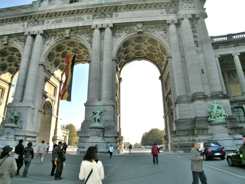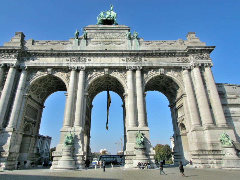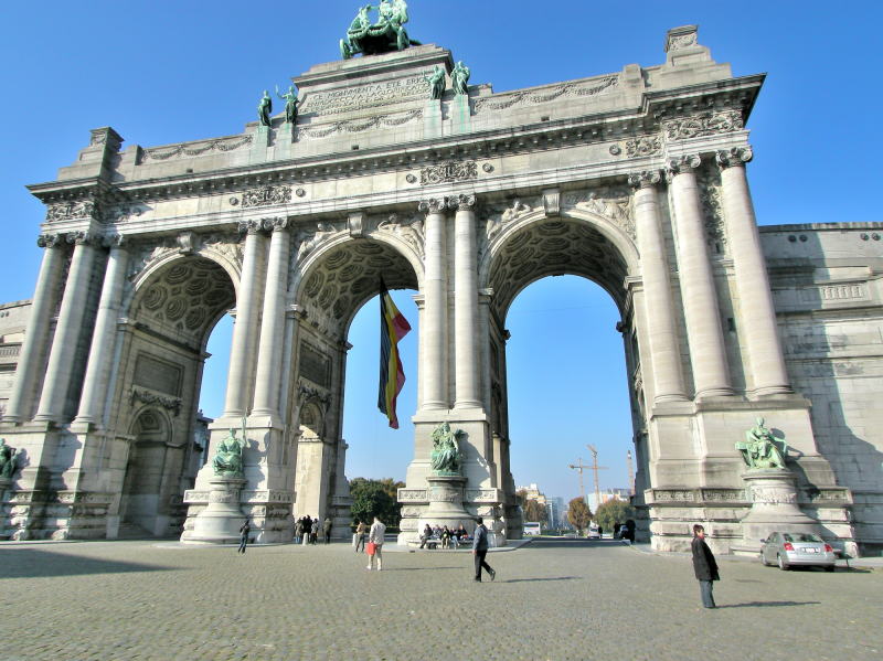 | サンカントネール門 [Arcades du Cinquantenaire](12:14) ベルギーは1830年にオランダ連合王国から独立し、1880年のベルギー独立50周年を記念して、建築家シャルル・ジローが1904年から1905年に建設した建物。 3つのアーケードを擁し、上部には青銅の巨大な像、凱旋の像がある。 記念門を挟むように、南側には歴史美術博物館とクラッシックカーのコレクションで知られる自動車博物館(オートワールド)があり、北側には軍事博物館がある。 この一帯は通称 "サンカントネール公園" [Parc du Cinquantenaire] と呼ばれている。 「西」MAPLay.3A |