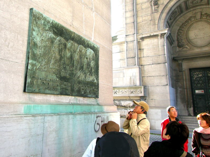 | サンカントネール門 [Arcades du Cinquantenaire](12:15) 門柱の内側に掲げられたレリーフは、ベルギー最初の5人の王 (レオポルドI世、レオポルドII世、アルバートI世、レオポルドIII世、ボードワンI世) のレリーフ。 嘗て、コンゴはベルギー領コンゴ(1908~1960)であったため、記念碑には 『感謝を込めて、ベルギー王朝とコンゴに敬意を表する。(1931)』 と記されている。 HOMMAGE A LA DYNASTIE LA BELGIQUE ET LE CONGO RECONNAISSANTS MDCCCXXXI 「南」MAPLay.3C |