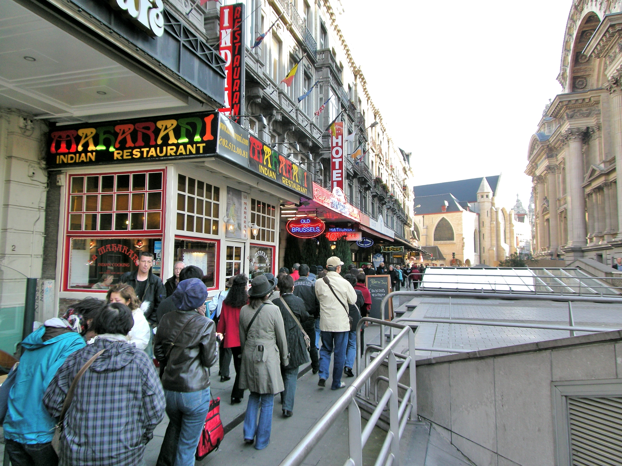 ブルス通り(13:55) ブルス通り [Rue de la Bourse/Beursstraat] を通ってグランプラス [Grand-Place] へ向かう。 「南東」MAPLay.3K |