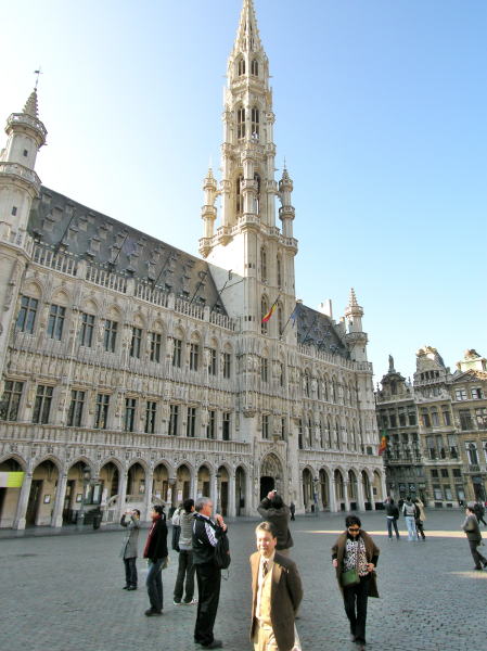 | ブリュッセル市庁舎 [Hôtel de Ville de Bruxelles](14:00) グランプラス/フローテ・マルクト [Grand-Place/Grote Markt] に面して建つ、ブリュッセル市庁舎。 市庁舎は1402年から1455年の間にフランボワイヤン・ゴシック様式で建築された美しい建物。 尖塔の高さは96mで、頂きには守護天使ミカエルの像が輝いている。 大同盟戦争中の1695年8月13日に、当時木造だった広場の家屋はヴィルロワ元帥に率いられたフランス軍の砲撃によって大半が破壊されたが、石で出来た市庁舎の壁は砲撃による破壊に耐えた。 このため市庁舎の建物は中世におけるグランプラスの建築様式を伝える唯一の証人となっている。 「南西」MAPLay.3L |
