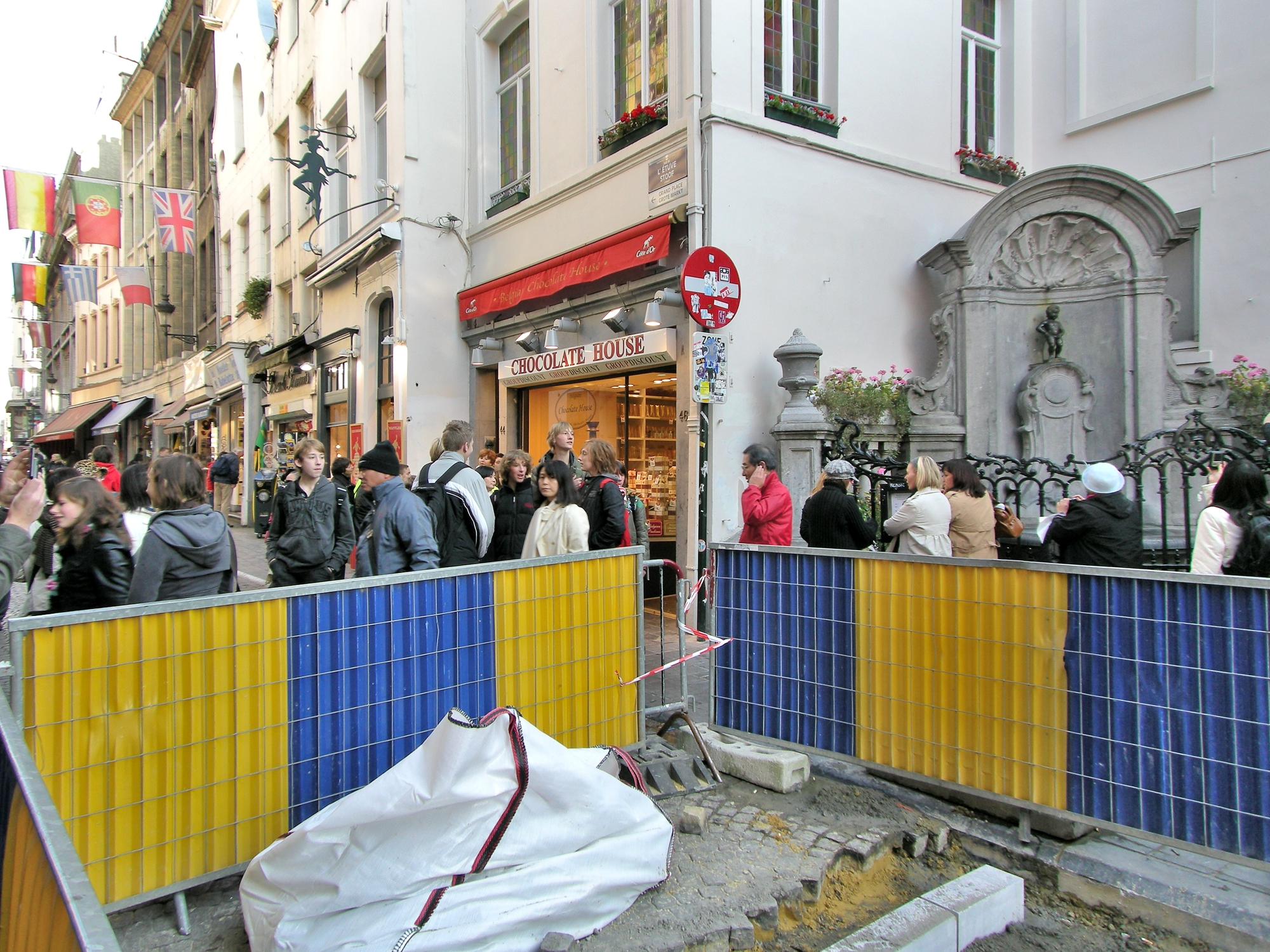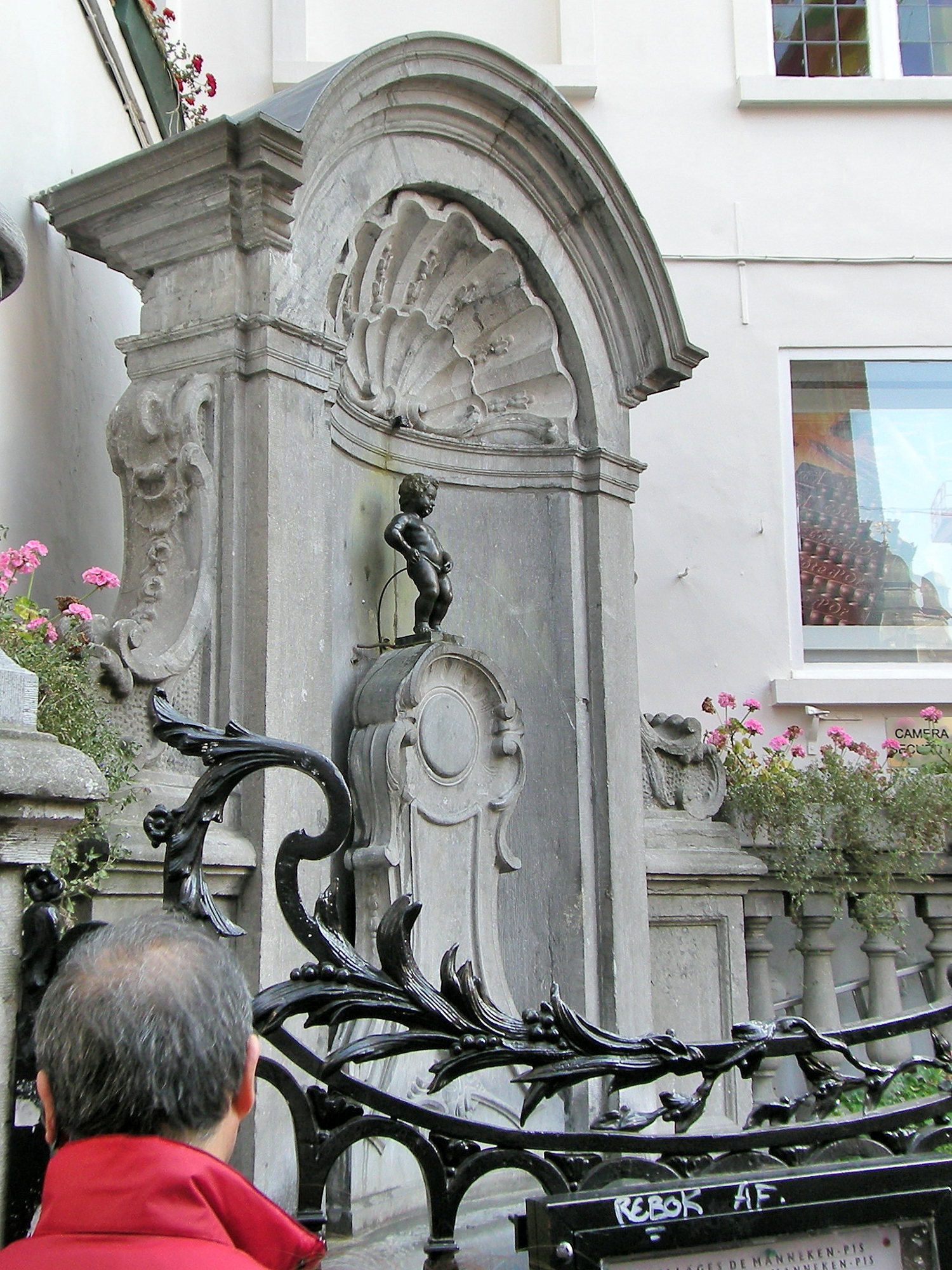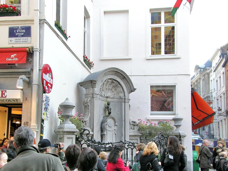 | 小便小僧 [Manneken Pis](14:26) 1619年にフラマン人彫刻家ジェローム・デュケノワ [Jérôme Duquesnoy] によって製作さて以降、多くの人に愛されてきた人気者の像。 18世紀にフランスのルイ15世の兵士が像を盗んだことで、王がその謝罪として豪華な服を贈った。 それ以来、世界中から衣装が贈られるようになり、現在、その数は670着を超える。 「最も歳をとったブリュッセル市民」 ともよばれ、その衣装のコレクションはブリュッセル市立博物館に展示されている。 因みに、現在設置されている像はレプリカで、オリジナルの像は1960年代に紛失している。 「南東」MAPLay.3R |
