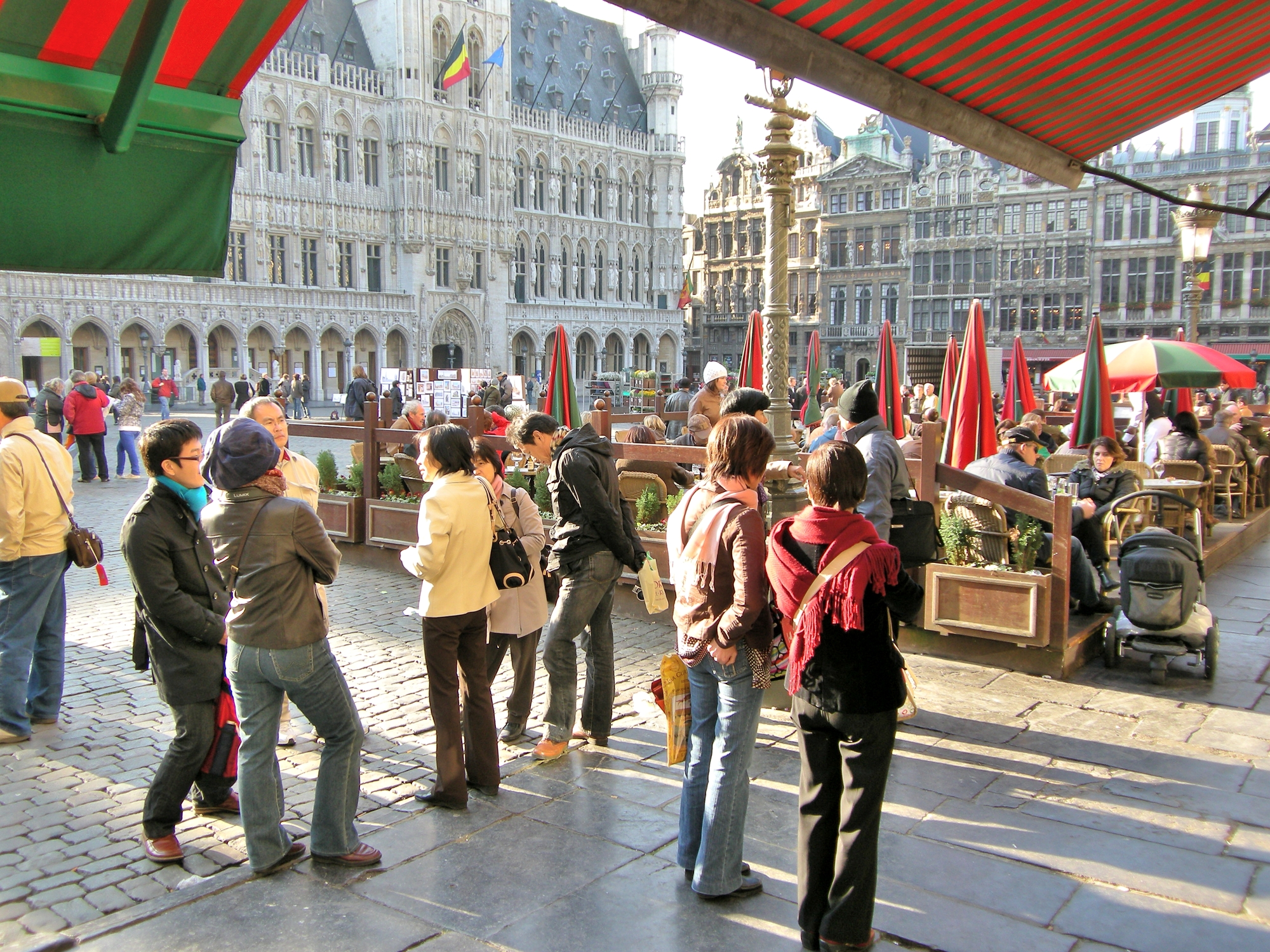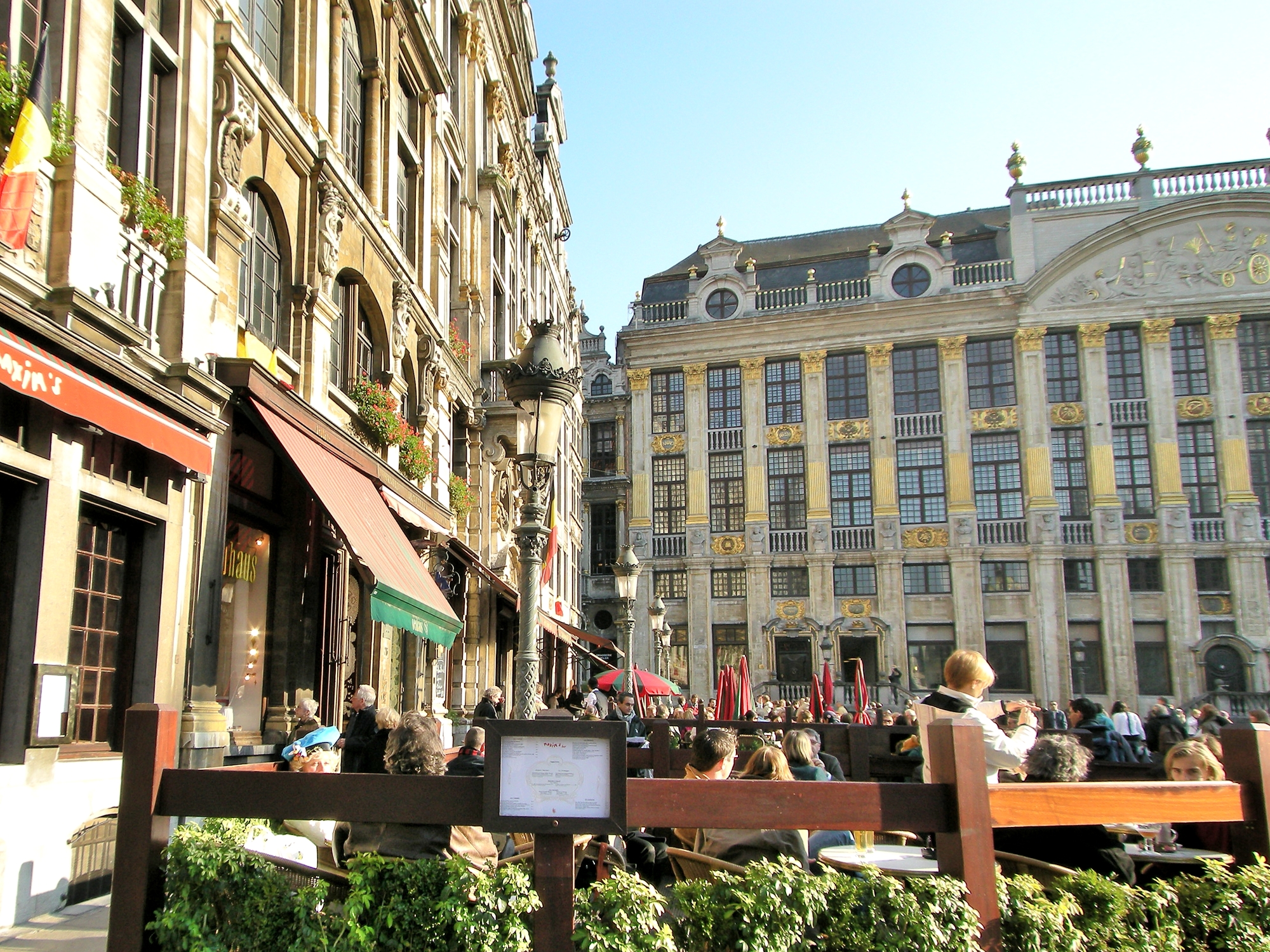 | グランプラス/フローテ・マルクト [Grand-Place/Grote Markt](15:51) グランプラスに面したカフェは広場にせり出すようにテーブルを並べている。 「南東」MAPLay.3e |