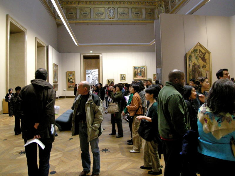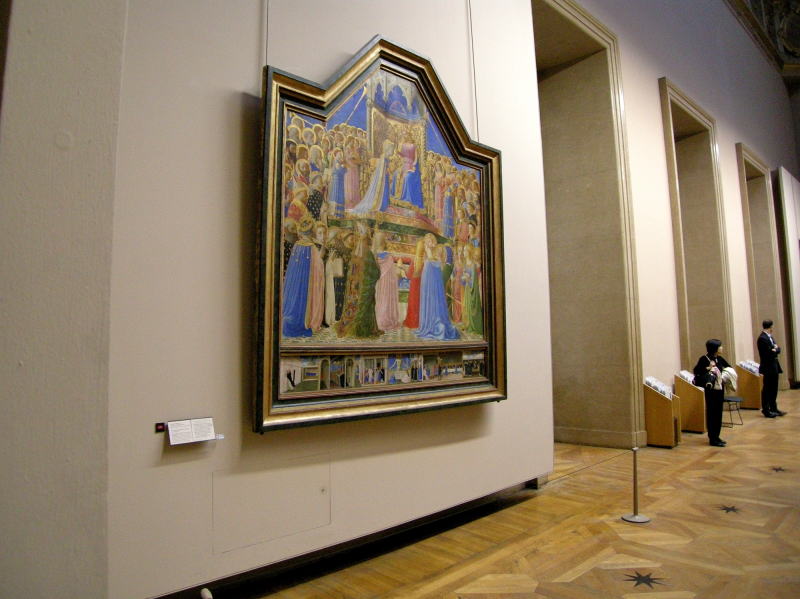 | 聖母戴冠 [Le Couronnement de la Vierge](10:09) フラ・アンジェリコ作 (1430/35頃) 。 おそらくはガッディ家の発意により、フィレンツェ付近のフィエーゾレにあるサン・ドメニコ修道院の中央祭壇のひとつのために制作された祭壇画であり、フラ・アンジェリコは後にこの修道院の院長となっている。 人物像に見られる彫塑的な堅固さと、遠近法のきわめて入念な研究が、若きフラ・アンジェリコに及ぼしたマザッチオの影響力を物語っている。 (館内見取り図) MAPLay.1G |