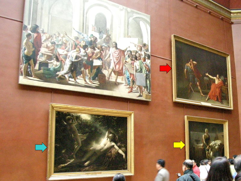| デノン 2階ダル ルーム75 [Denon 1er étage Daru Salle 75] (10:46) アンヌ = ルイ・ジロデ・ド・ルーシー = トリオゾン作 (1793) 《 エンデュミオンの眠り [Le Sommeil d'Endymion] 》1818年取得 (青→) 。 ジャン = ジェルマン・ドルーエ作 (1786) 《 ミントゥルナエの囚人、マリウス [Marius prisonnier à Minturnes] 》 1816年取得 (赤→) 。 ピエール = ナルシス・ゲラン作 (1799) 《 マルクス・セクストゥスの帰還 [Le Retour de Marcus Sextus] 》 1830年取得 (黄→) 。 (館内見取り図) 注:フランス語の 1er étage は日本では2階に相当する。 ヨーロッパ諸国では日本で言う1階はグラウンドやロビーなどと呼び、2階から1階、2階、3階・・・・・・・と数えて呼んでいる。 MAPLay.1K |