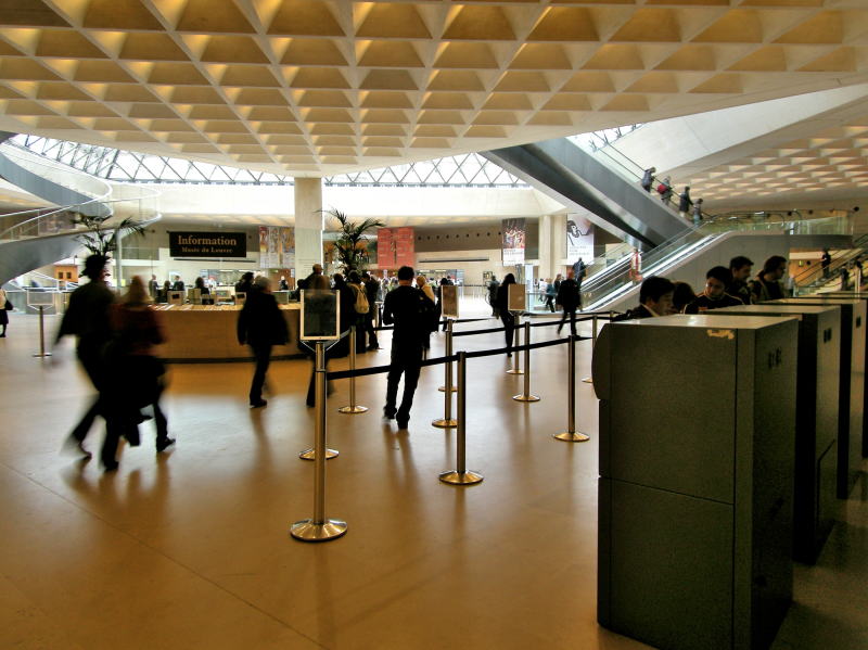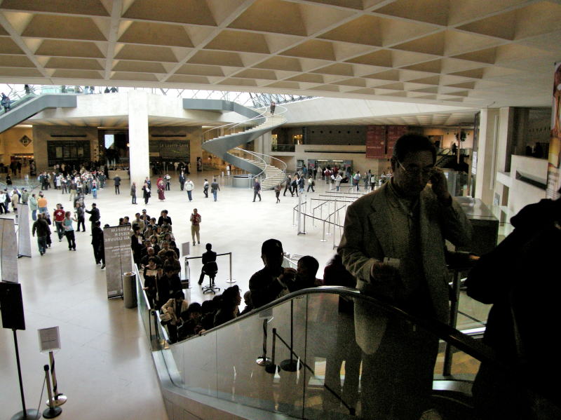 | ナポレオン広場 [Cour Napoléon] の地下エントランス (09:27) この上にはナポレオン広場があり、天井の明るくなっている部分が、ガラスと金属で制作されたルーヴル・ピラミッドの下部にあたる。 因みに、このピラミッドに使用されているガラスは、伝統を重んじ、ヴェルサイユ宮殿の鏡の間に使用されている鏡と同じ製造所のガラスが使用されている。 (館内見取り図) MAPLay.1A |