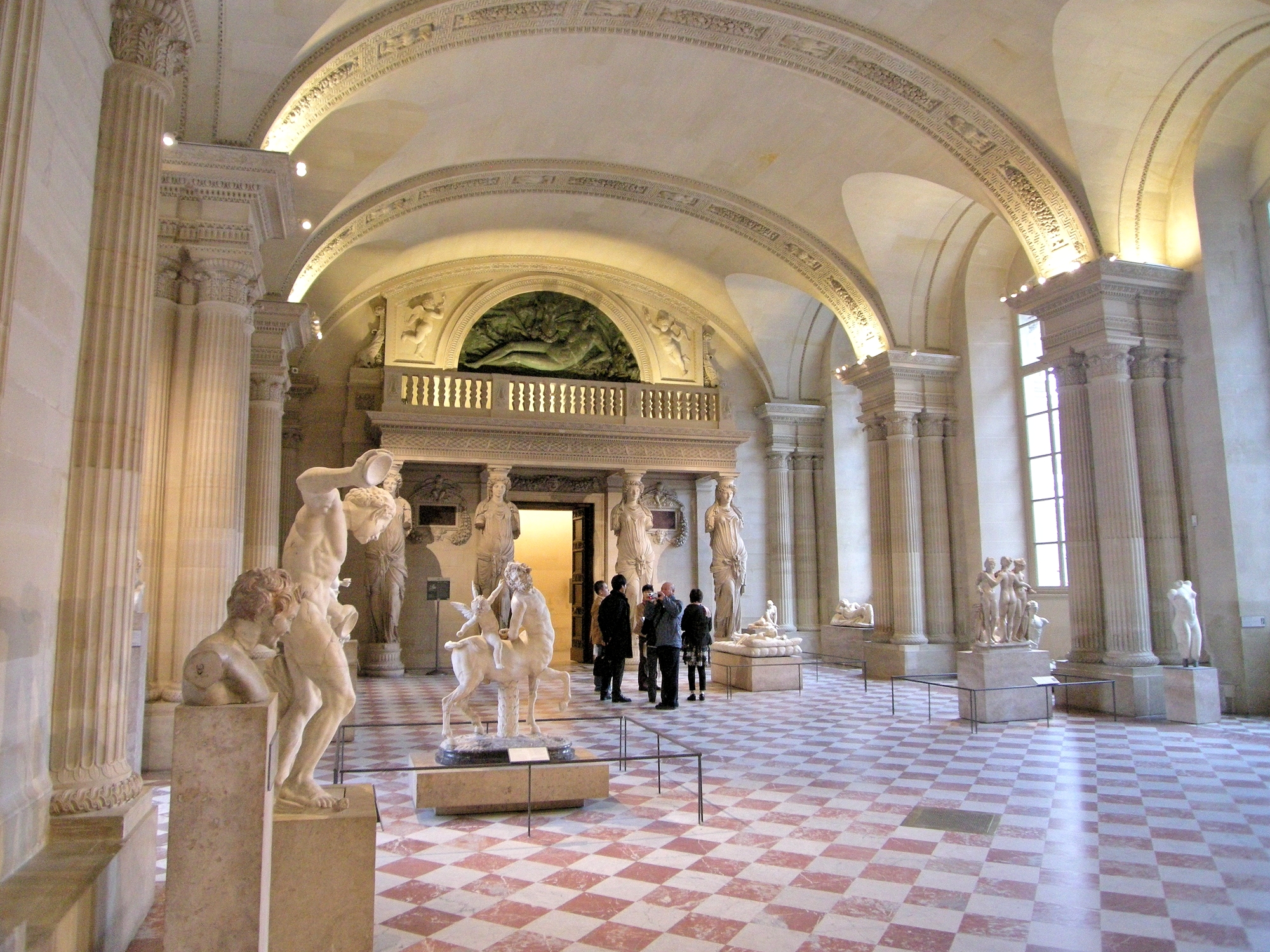 | カリアティード [Cariatide] の広間 (09:36) ルーヴルで一番古い部屋 (日本では室町時代にあたる) 。 入口の上にはバルコニーがあり、その上に横たわっている女性像はアンリ2世の愛妾、ディアーヌ・ド・ポワチエ [Diane de Poitiers] だと言われている。 この間はダンスバーティーの間とも呼ばれ、バルコニーはダンスパーティー用の音楽隊席として使用されていた。 バルコニーを支える4本の柱には ジャン・グージョン [Jean Goujon] 作の女像彫刻が施されており、カリアティード (女像柱) はこの柱に因んだ名称である。 因みに、この彫刻は国宝に指定されている。 (館内見取り図) MAPLay.1B |