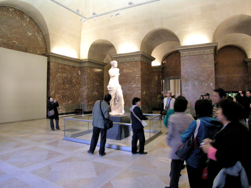 | アフロディテ像 通称 「ミロのヴィーナス」[Vénus de Milo] (09:42) 当時トルコ領だった、キュクラデス諸島のミロ島でギリシア人農夫によって発見された。 フランス大使のリビエール侯爵は即刻、トルコ政府に対し購入交渉する一方、細心の発掘を平行。 1821年にルイ18世へ寄贈された。 ギリシア彫刻の黄金時代である紀元前5~4世紀頃への憧憬を込めて製作されたヘレニズム時代の傑作で、紀元前100年頃に制作されている。 因みに、この部屋はルイ14世の母、アンヌ・ドートリッシュ [Anne d'Autriche] の浴室であった場所。 (館内見取り図) MAPLay.1C |