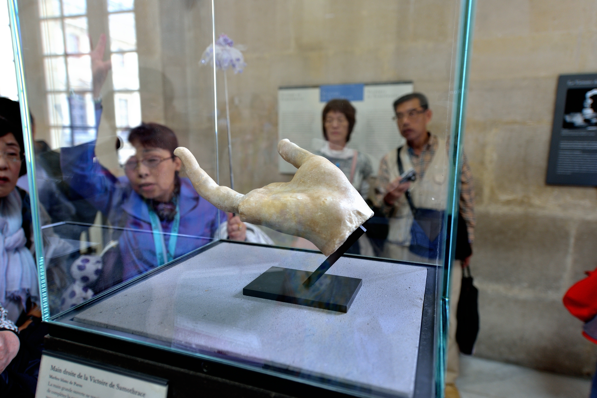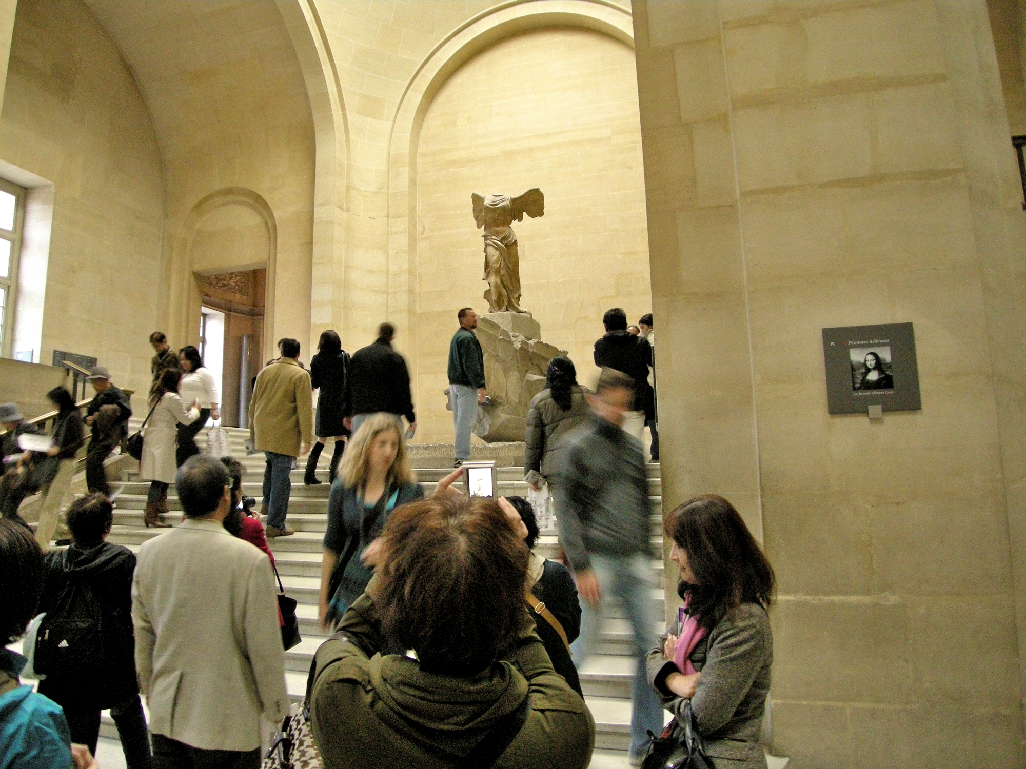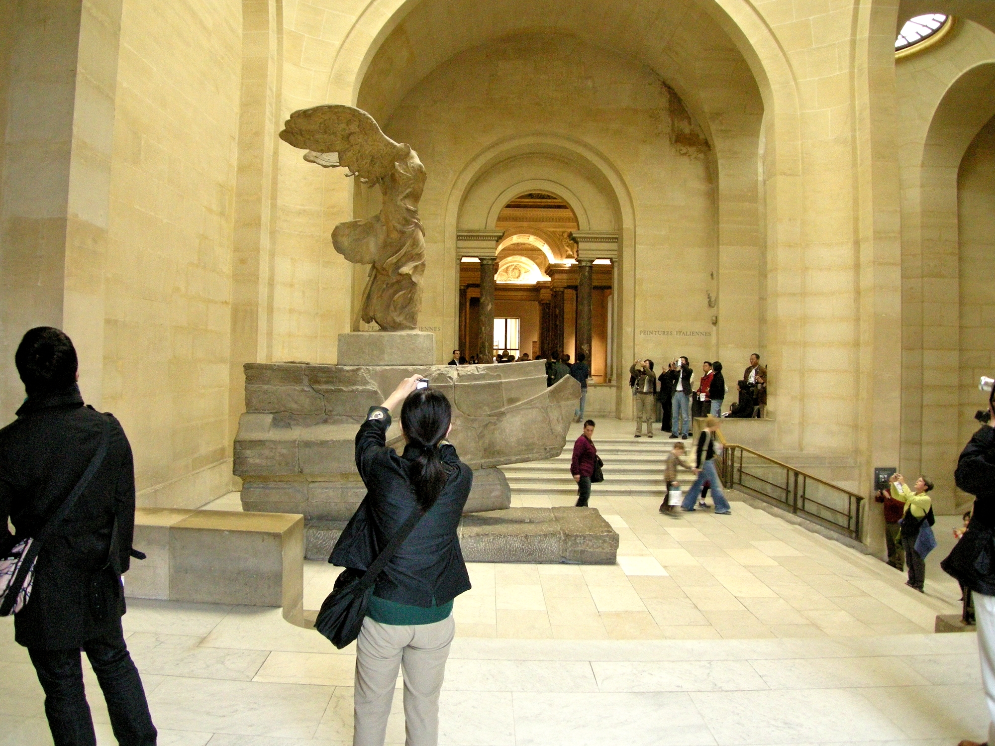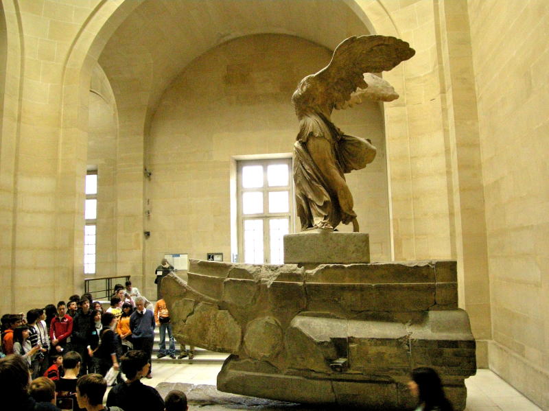 | サモトラケのニケ [ギリシア:Νίκη της Σαμοθράκης](09:59) 最初の発見は1863年で、フランス領事シャルル・シャンポワゾによって胴体部分が見つけられた。 それに続いて断片と化した片翼が見つかった。 断片は全部で118片にのぼり、その後復元された像は1884年にルーヴル美術館の『ダリュの階段踊り場』に展示されている。 右腕は1950年に発見されたが、透明ケースに入れた状態で保管展示されている。 (館内見取り図) MAPLay.1E |