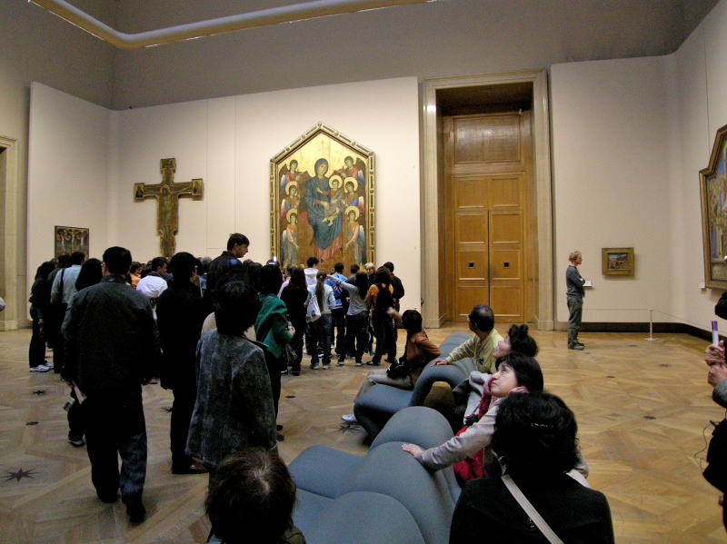 ドアの左に位置する絵画はサンタ・トリニタ聖堂(フィレンツェ、ウフィッツィ美術館所蔵)の《マエスタ》の遥か前の1280年頃に制作されたチマブーエの早期作品。 六人の天使に囲まれた荘厳の聖母は神の子と共に玉座に座し、天上の女王として讃えられる聖母の主題を、きわめて印象的な絵画として描き出している。 (館内見取り図) MAPLay.1G |