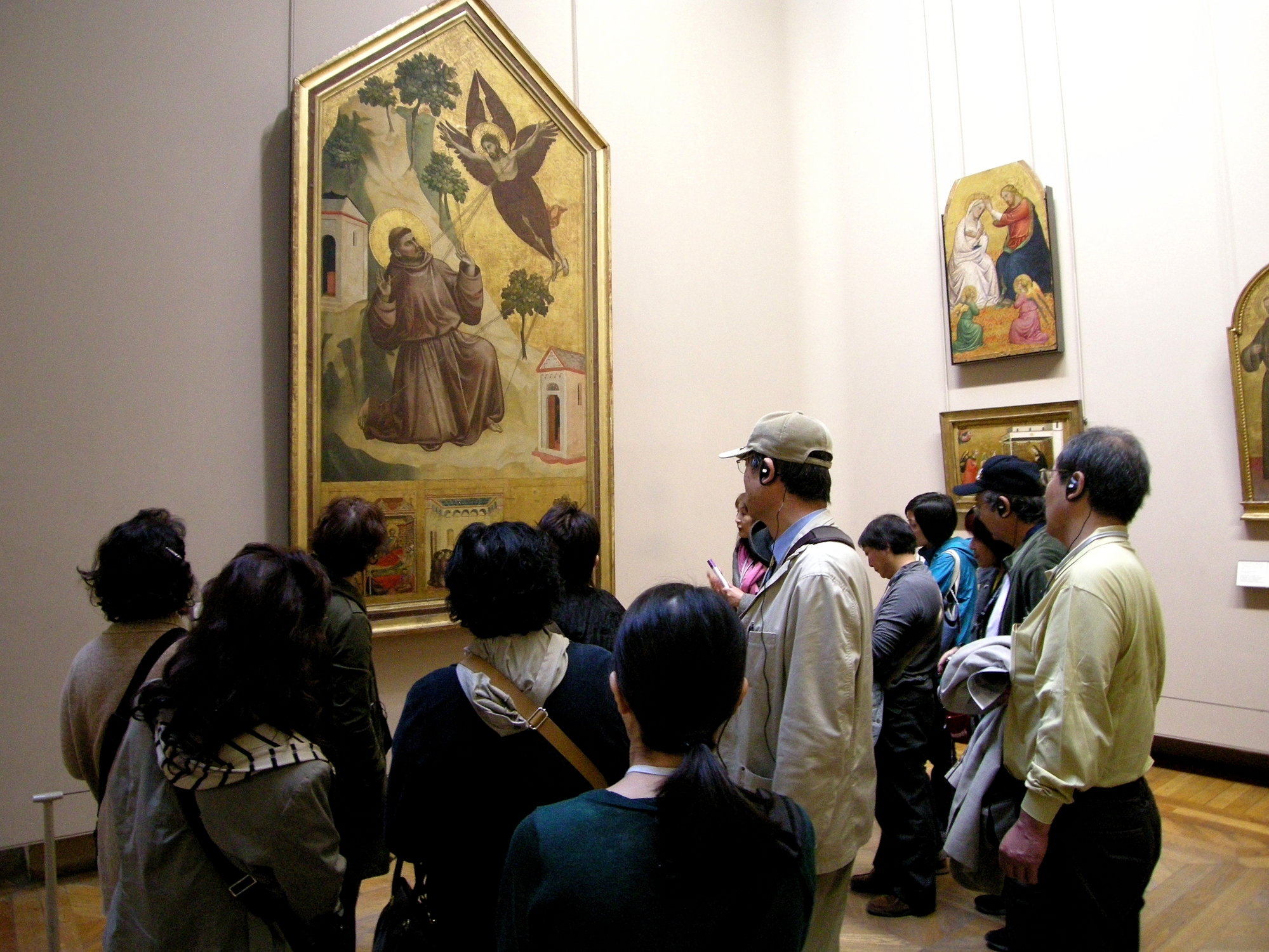 ジオット・ディ・ボンドーネ作 (1295/1300頃 ? ) 。 1550年と1568年に、ヴァザーリによるピサのサン・フランチェスコ聖堂にあったという記述がある祭壇画で、おそらく翼廊の礼拝堂からもたらされた作品と思われる。 アッシジの聖フランチェスコ(1182-1226年)の生涯を描いた四つの場面 (絵の下の部分) は、ジォットの作品と考えられているアッシジのサン・フランチェスコ聖堂の上階教会堂内部に描かれた聖者の生涯のフレスコ画と関連付けることが出来る。 (館内見取り図) MAPLay.1G |
