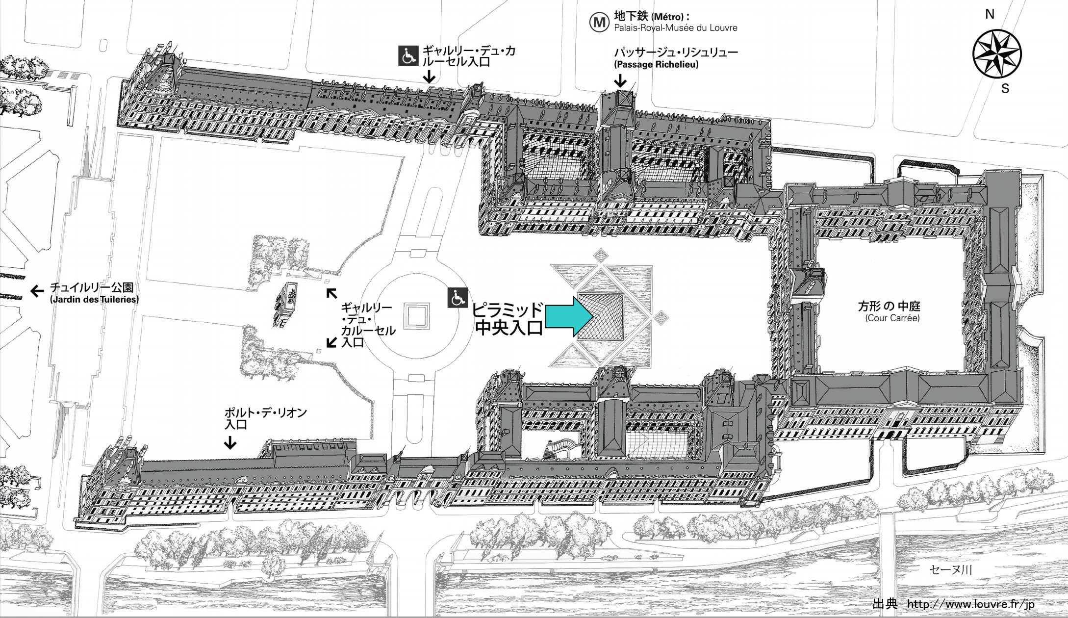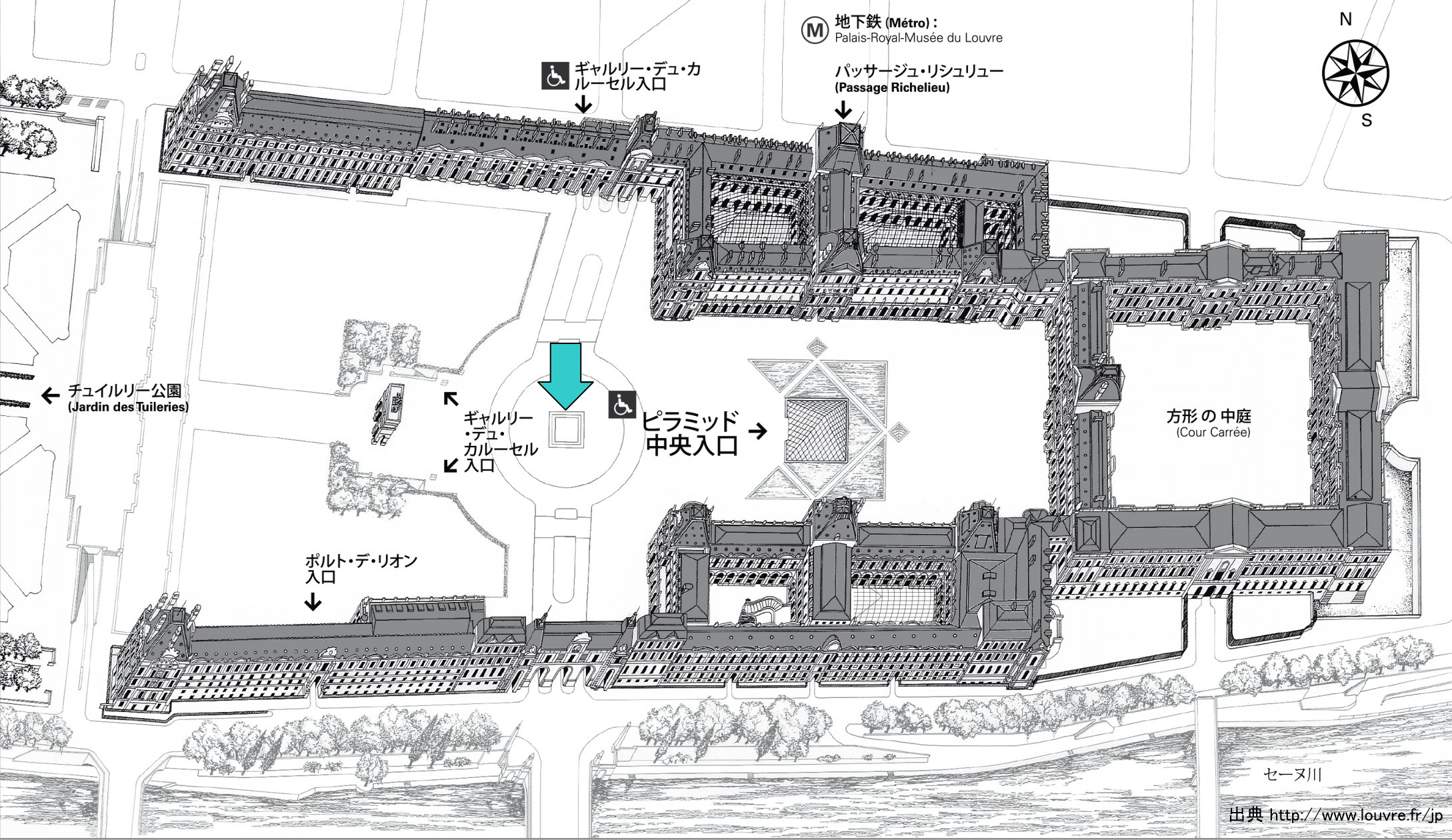 | ナポレオン広場 [Cour Napoléon] の地下エントランス (09:30) 落成したのは1988年10月15日、従来の宮殿入口には、多数の来館者をさばききれず、行列ができるという問題があったが、この広大な地下エントランスが出来てからは、その問題はなくなった。 (館内見取り図) MAPLay.1A |