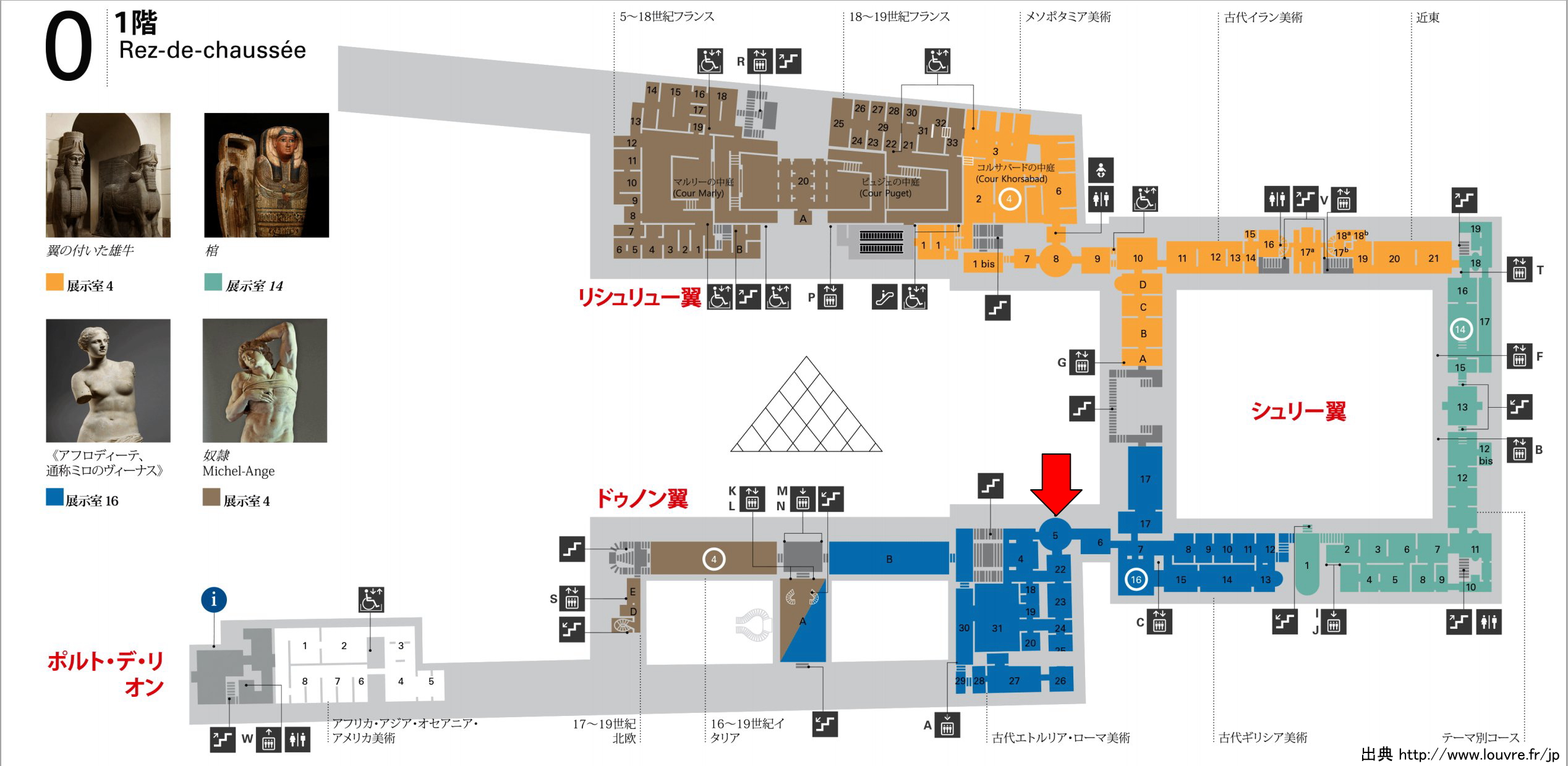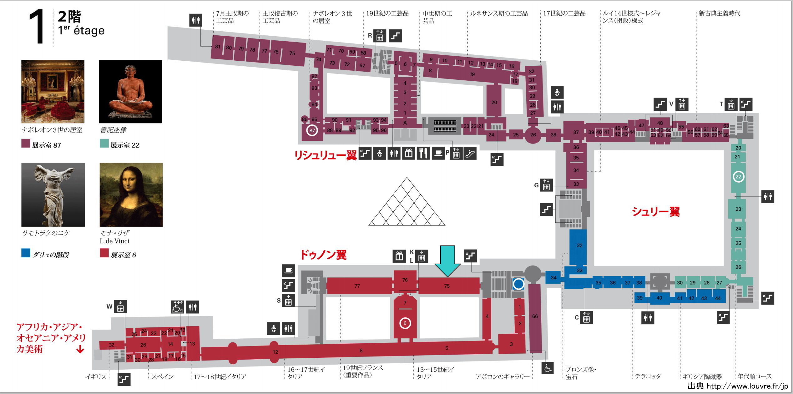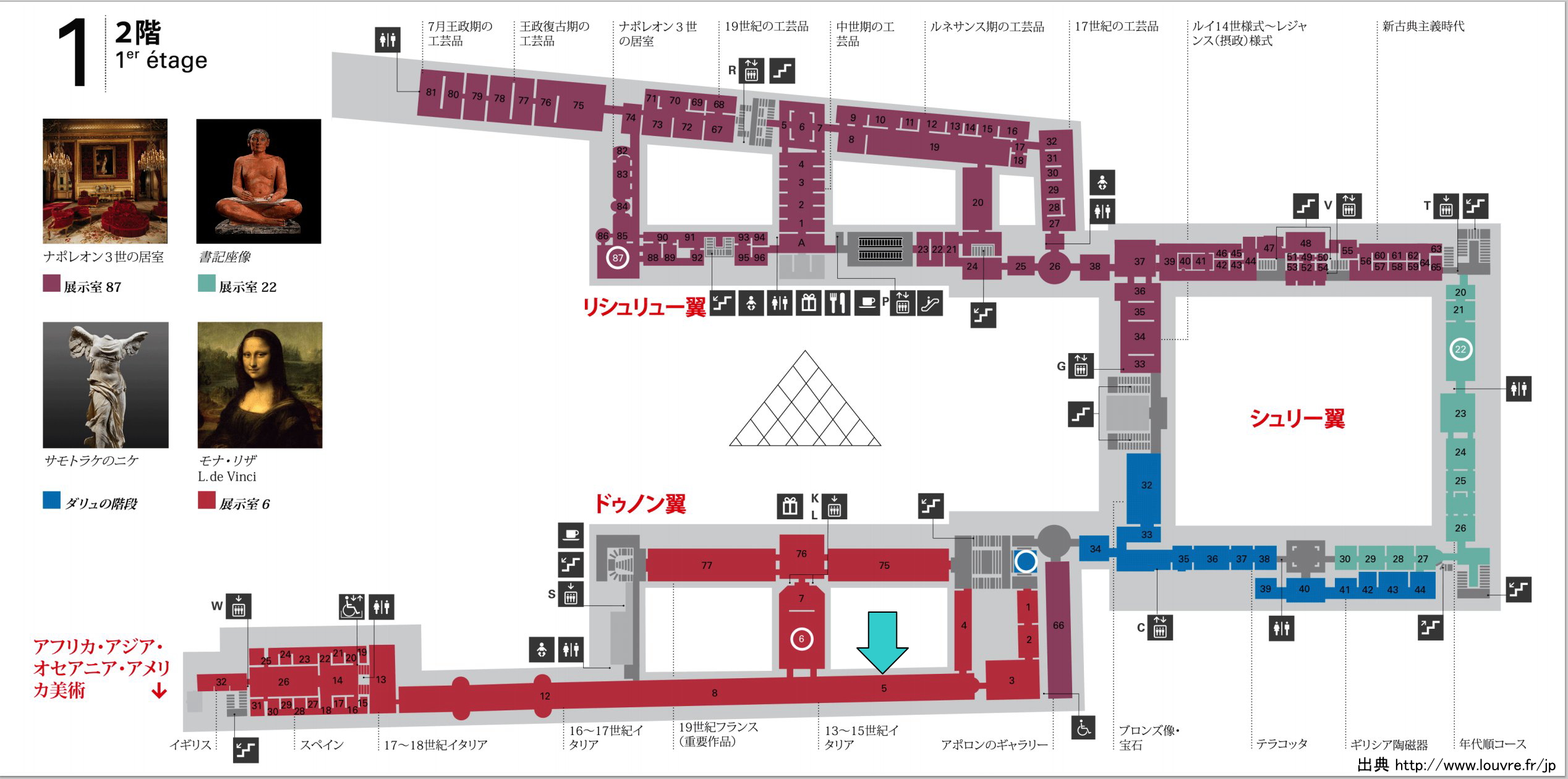 | デノン 2階大ギャラリー ルーム5 [Denon 1er étage Grande Galerie Salle 5] 注:フランス語の 1er étage は日本では2階に相当する。 ヨーロッパ諸国では日本で言う1階はグラウンドやロビーなどと呼び、2階から1階、2階、3階・・・・・・・と数えて呼んでいる。 (館内見取り図) |
