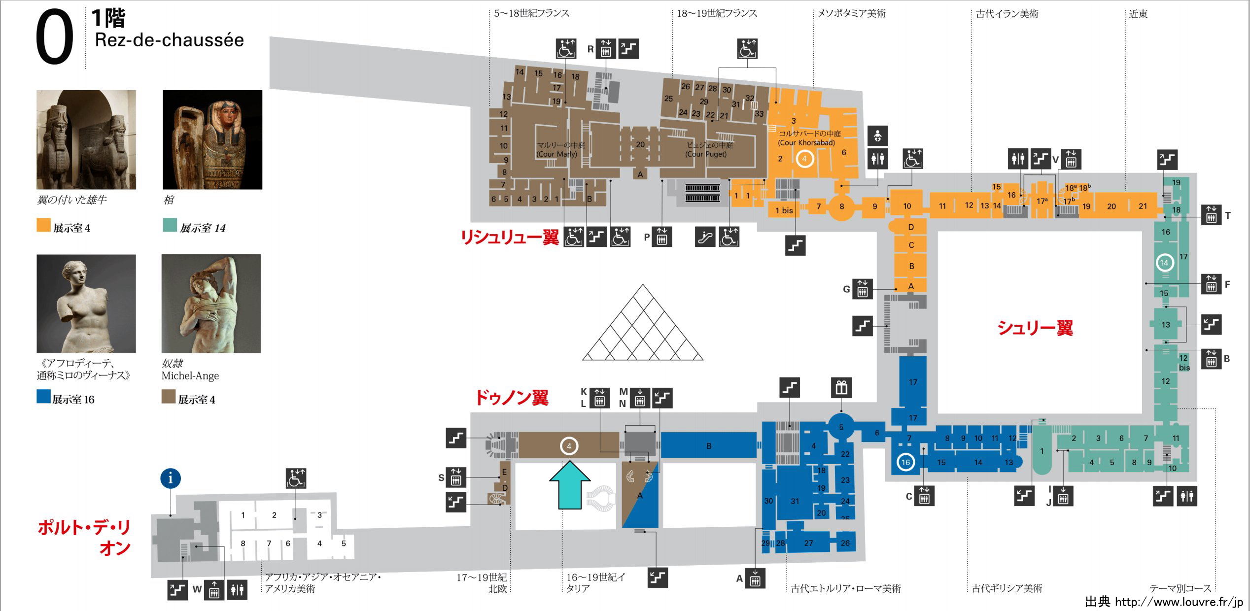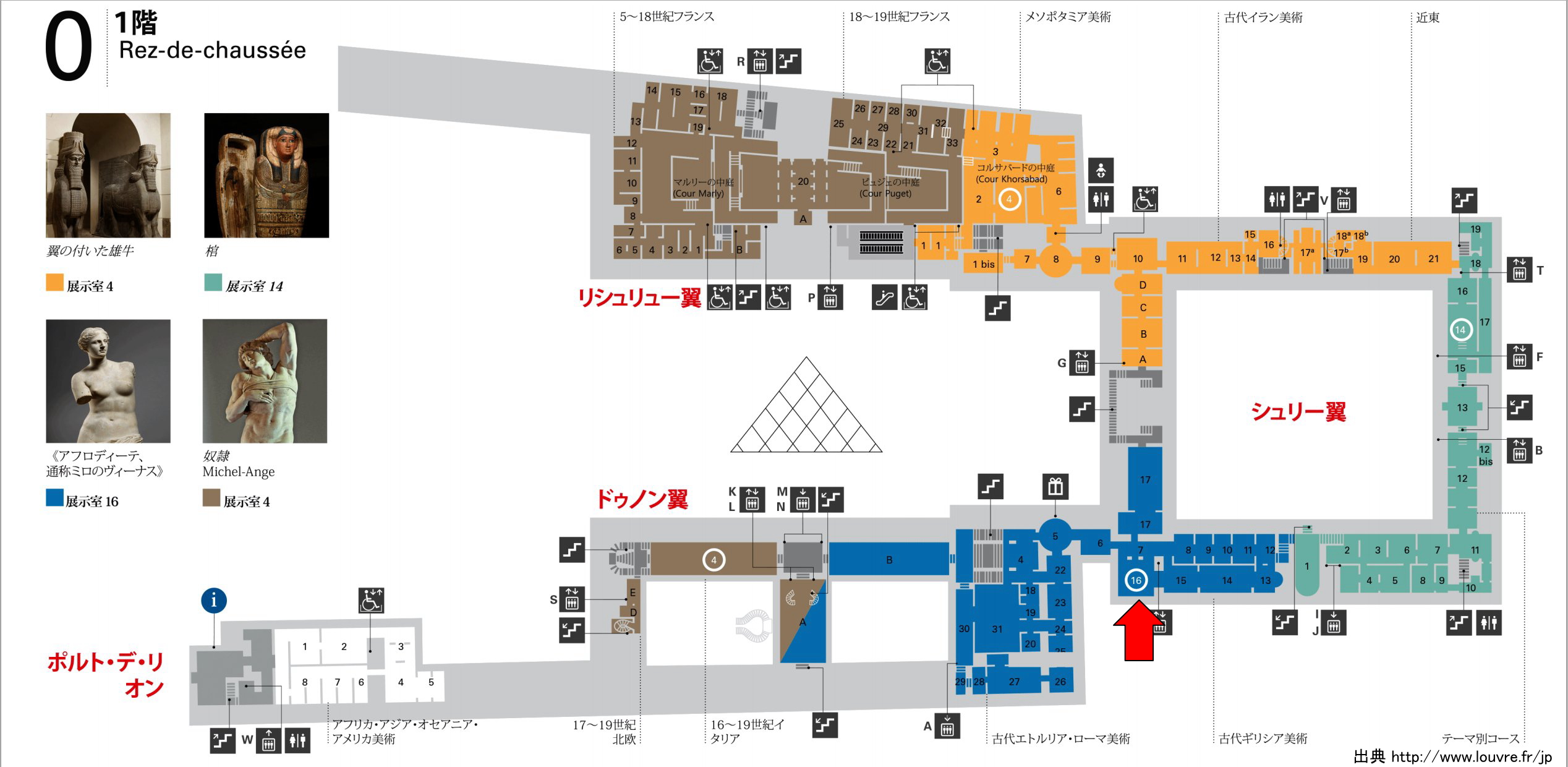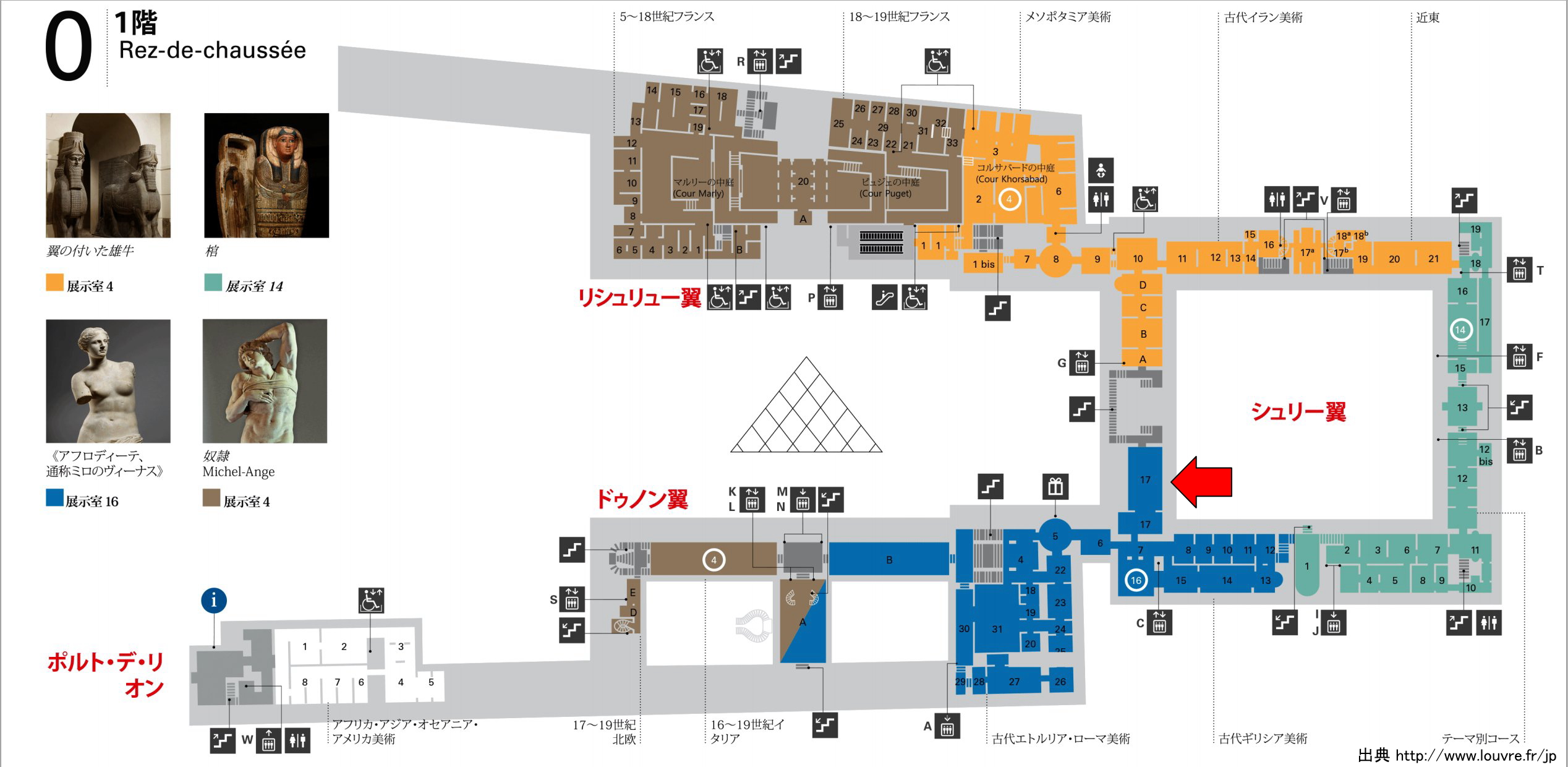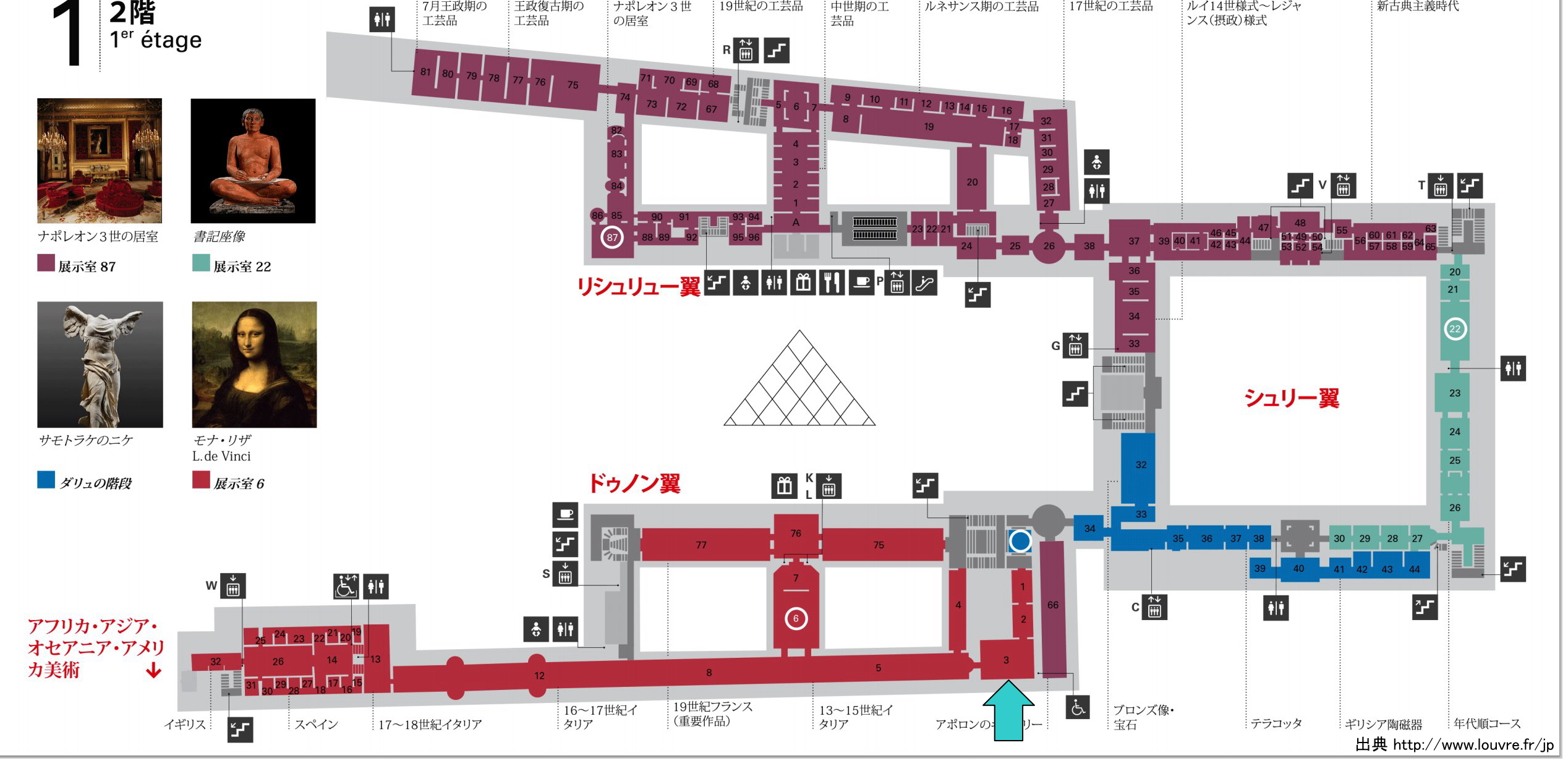 | デノン 2階大ギャラリー ルーム5 [Denon 1er étage Grande Galerie Salle 5] 注:フランス語の 1er étage は日本では2階に相当する。 ヨーロッパ諸国では日本で言う1階はグラウンドやロビーなどと呼び、2階から1階、2階、3階・・・・・・・と数えて呼んでいる。 (館内見取り図) |