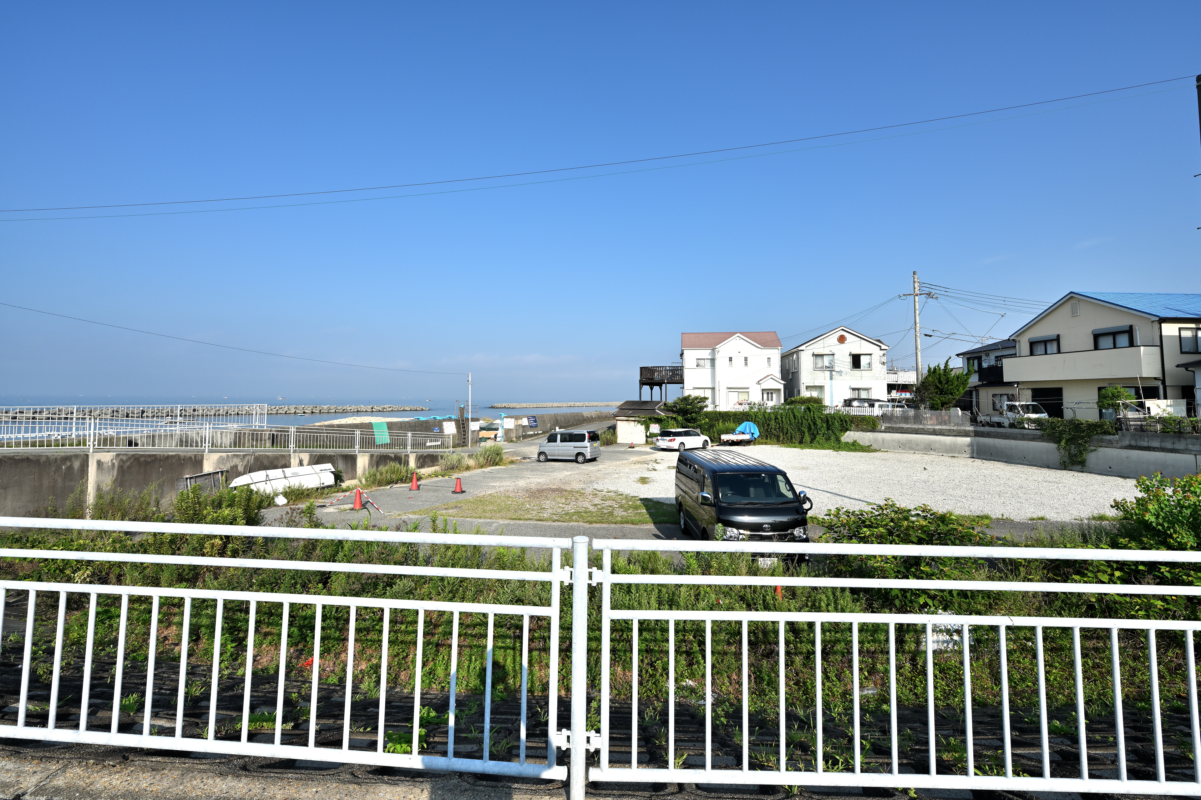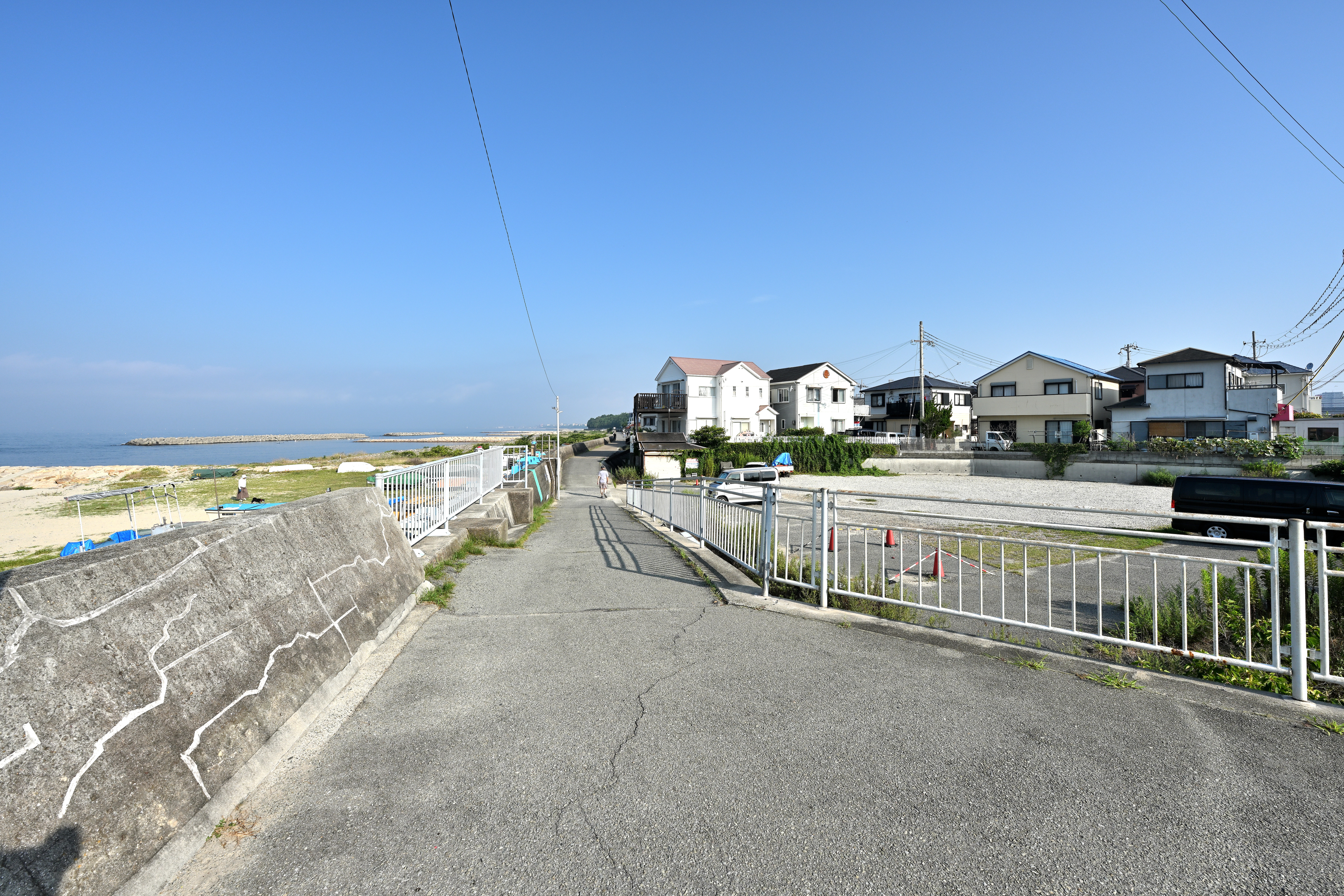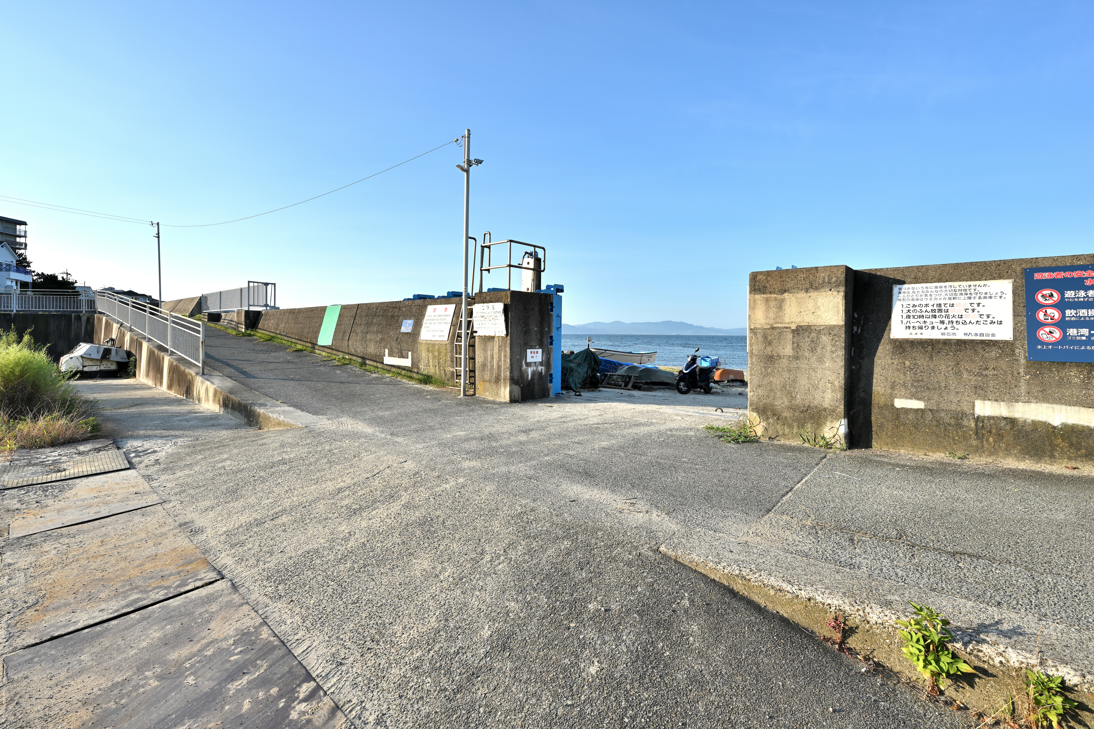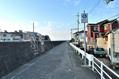 | 撮影地点 MAP "浜の散歩道"に沿って設けられた防波堤の一部は、駐車場から海へのアクセスを容易にするため開かれた状態になっている。 例えば、車で運んできた、レジャーボートや釣りボート等、海への運搬が容易に行える。 |