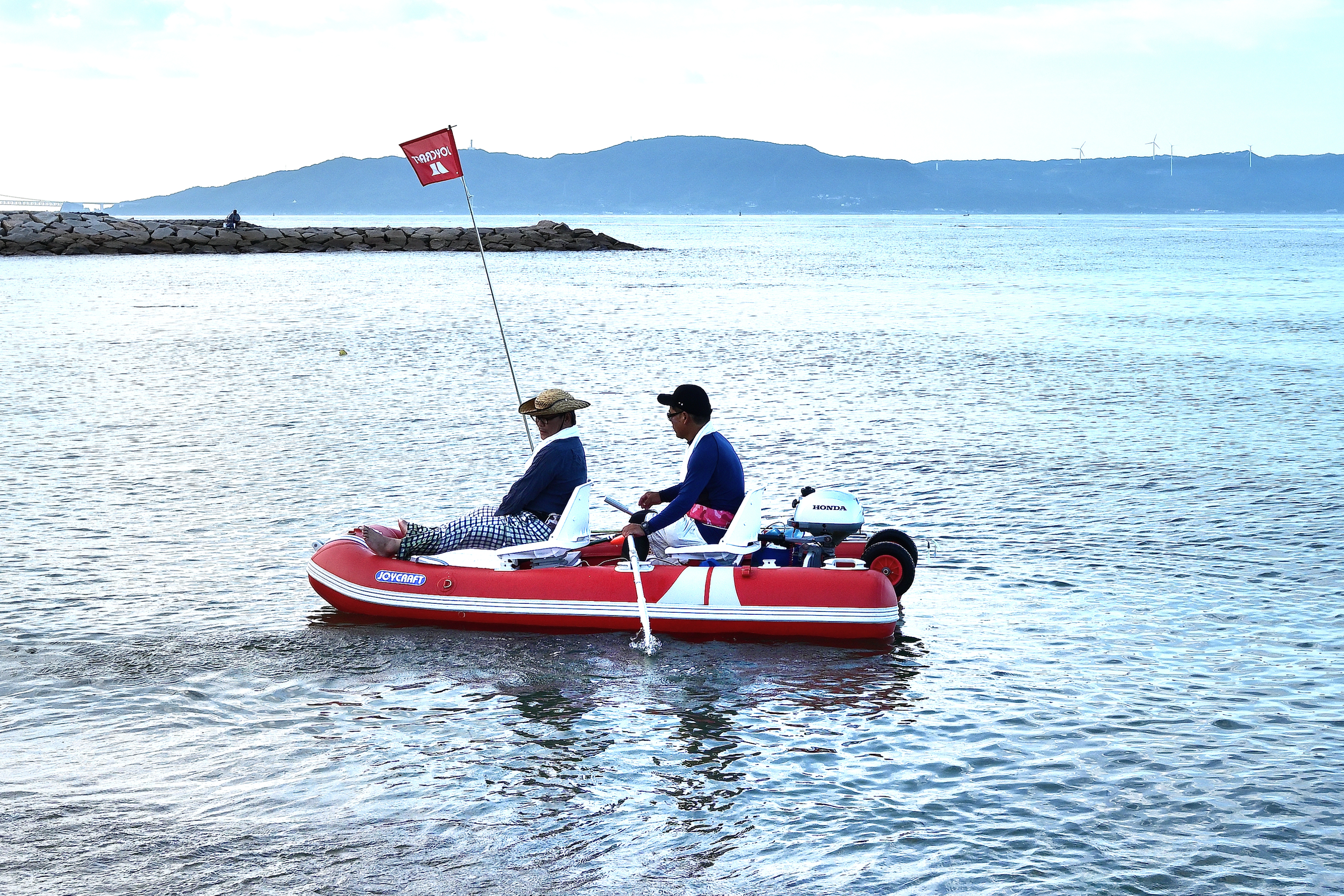 撮影地点 MAP 釣り人が駐車場でランチングホイール付きの ゴムボートを組み立て、今、海に出ようとしている。 |