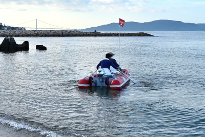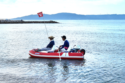 | 撮影地点 MAP 釣り人が駐車場でランチングホイール付きの ゴムボートを組み立て、今、海に出ようとしている。 |