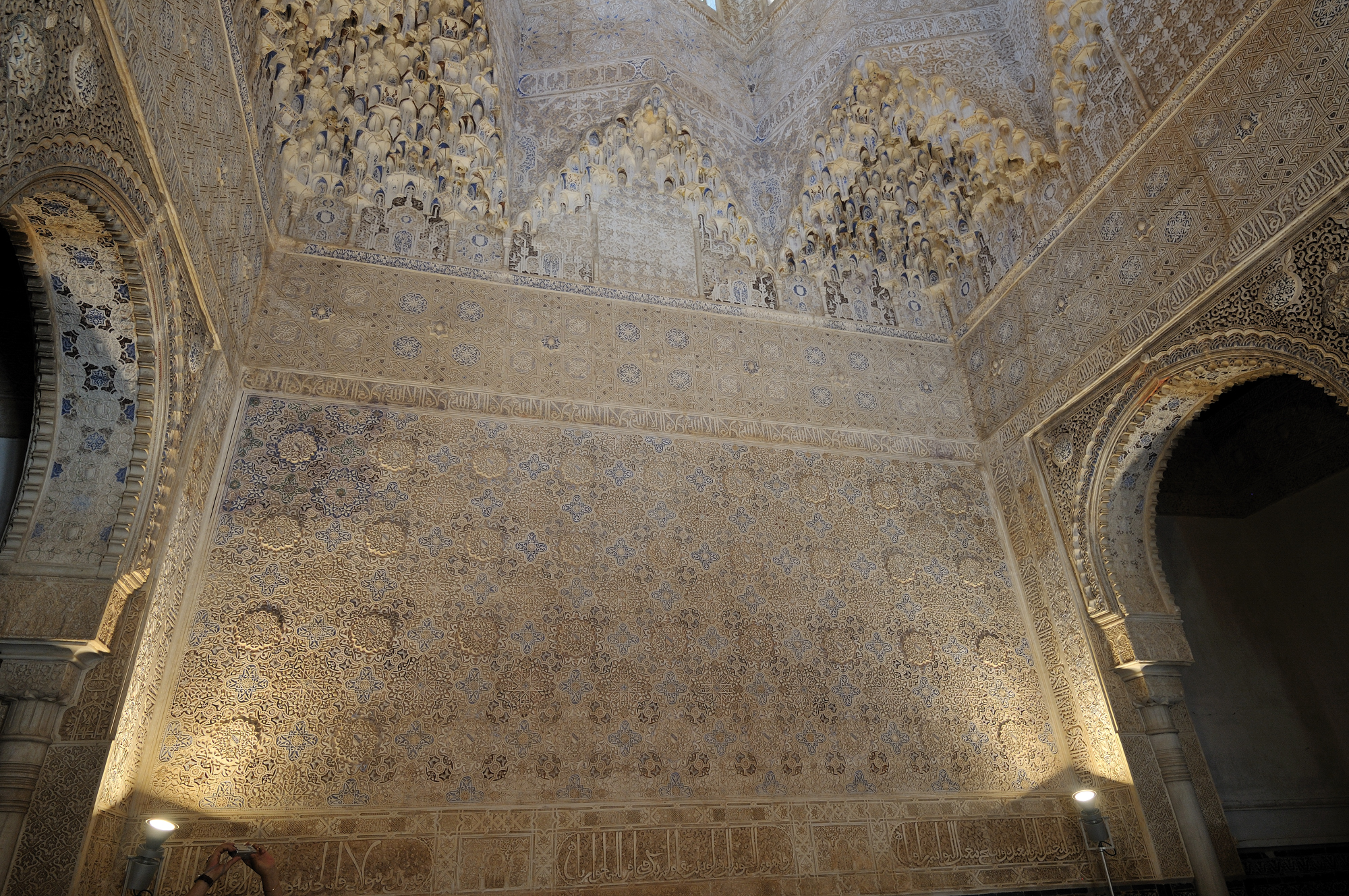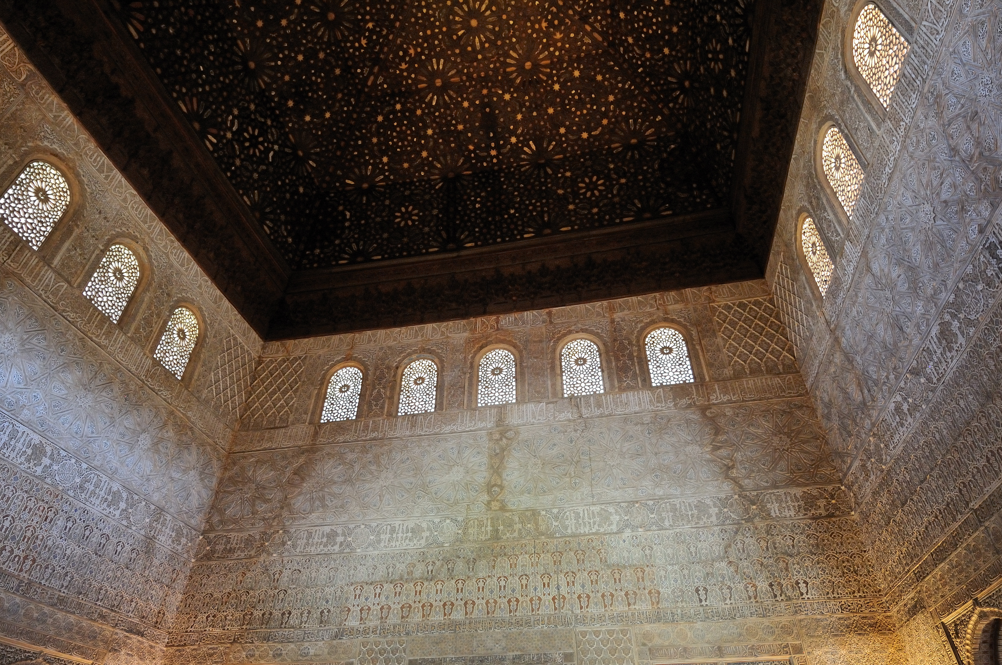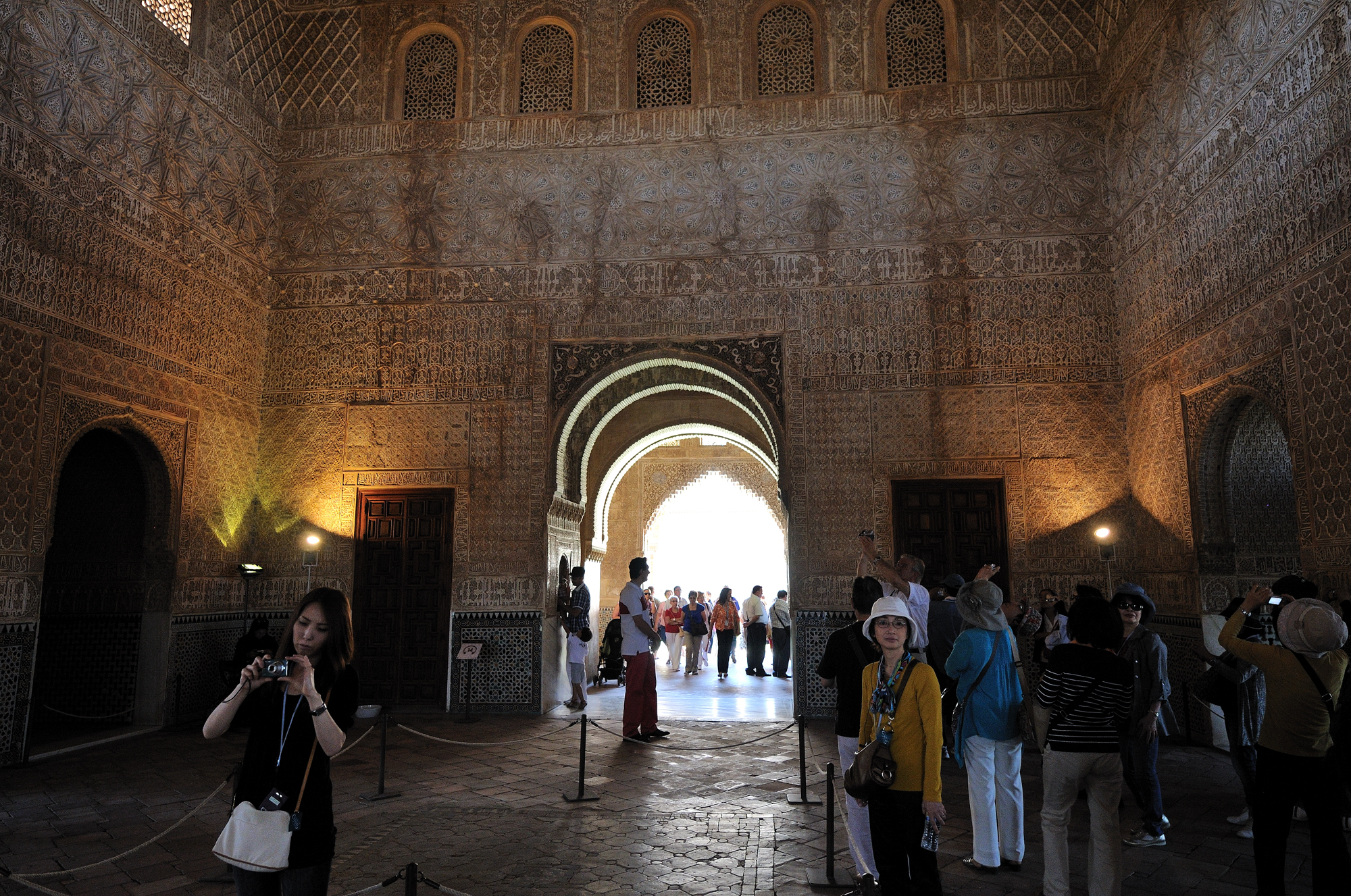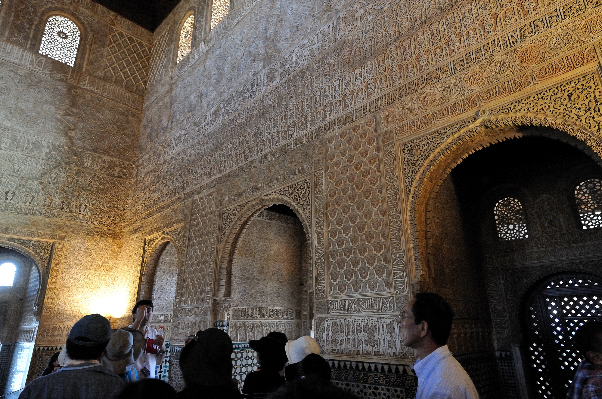 | 大使の間 [Salón de Comares] <Planⓛ> (11:58) 別名、「王座の間」とも呼ばれる、かってのイスラム教徒君主の謁見の間、床面積が約121㎡、天井の高さが約18mで、「コマレスの塔」の内部空間を全て占有している。 周囲の壁面はスタッコ仕上げで、モーロ風の幻想的な模様で飾られており、天井は落葉松材もしくはヒマラヤ杉材を用いたアラベスク模様で星空をイメージした造りになっている。 かっての天井は、ムカルナス (muqarnas) と呼ばれる形式の精緻な鍾乳石飾りで覆われ、金箔と原色顔料で色鮮やかに彩色されていたが、地震のために天井の大部分が崩壊してしまい、現在の天井に取って代わられている。 「北方向」MAPLay. 1 j |