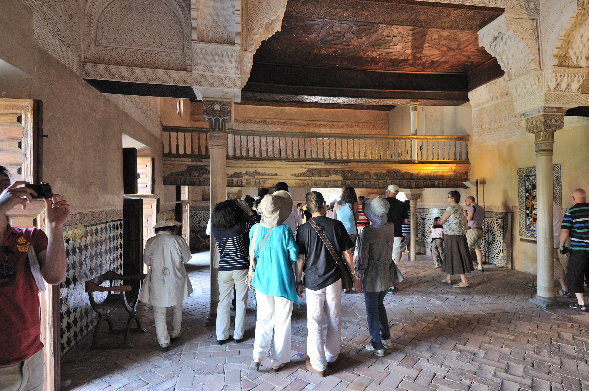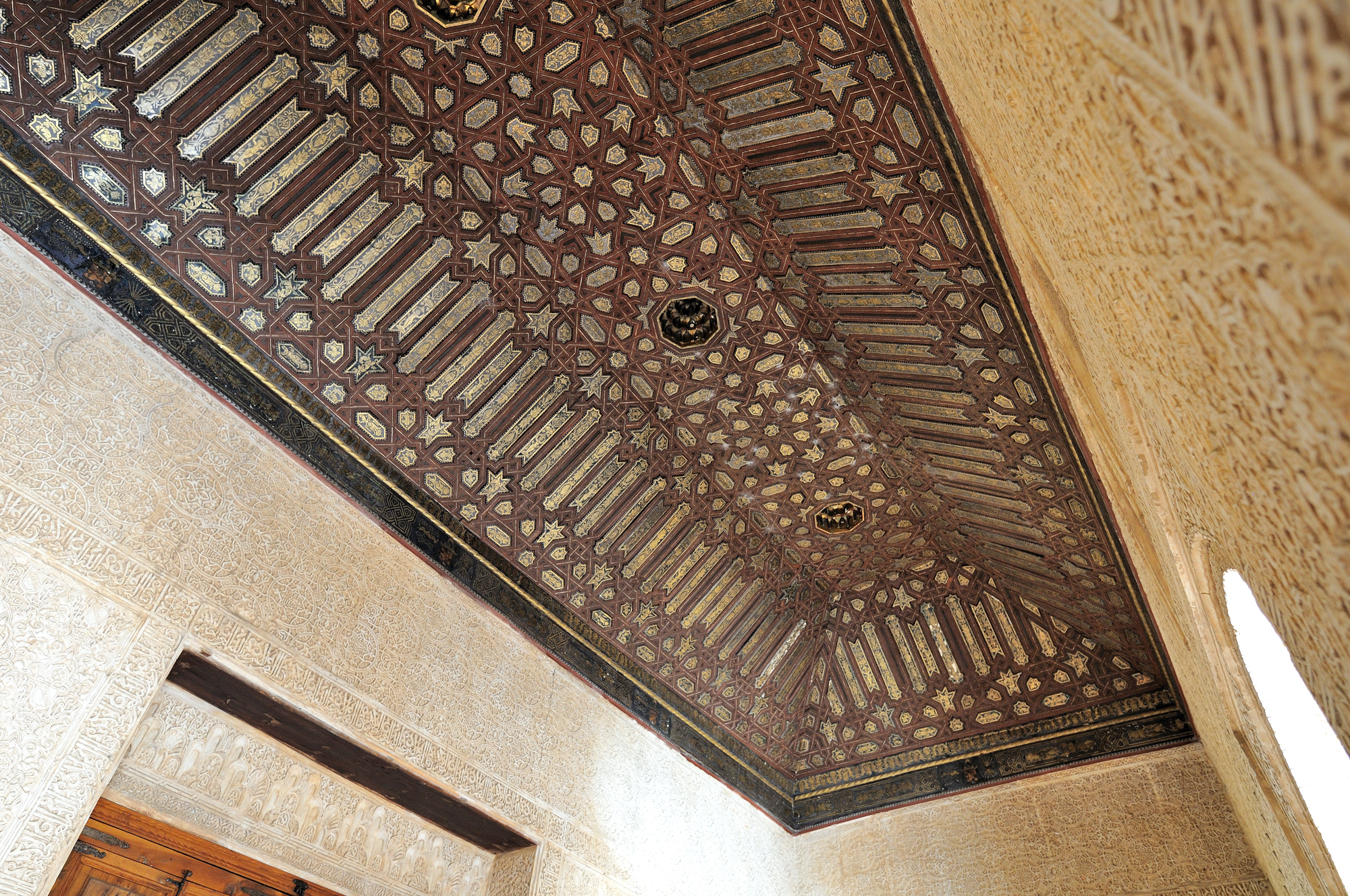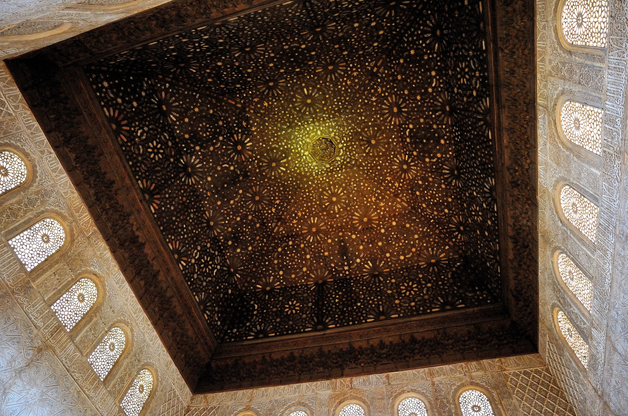 | 大使の間 [Salón de Comares] <Planⓛ> (11:58) 別名、「王座の間」とも呼ばれる、かってのイスラム教徒君主の謁見の間、床面積が約121㎡、天井の高さが約18mで、「コマレスの塔」の内部空間を全て占有している。 周囲の壁面はスタッコ仕上げで、モーロ風の幻想的な模様で飾られており、天井は落葉松材もしくはヒマラヤ杉材を用いたアラベスク模様で星空をイメージした造りになっている。 かっての天井は、ムカルナス (muqarnas) と呼ばれる形式の精緻な鍾乳石飾りで覆われ、金箔と原色顔料で色鮮やかに彩色されていたが、地震のために天井の大部分が崩壊してしまい、現在の天井に取って代わられている。 「北方向」MAPLay. 1 j |