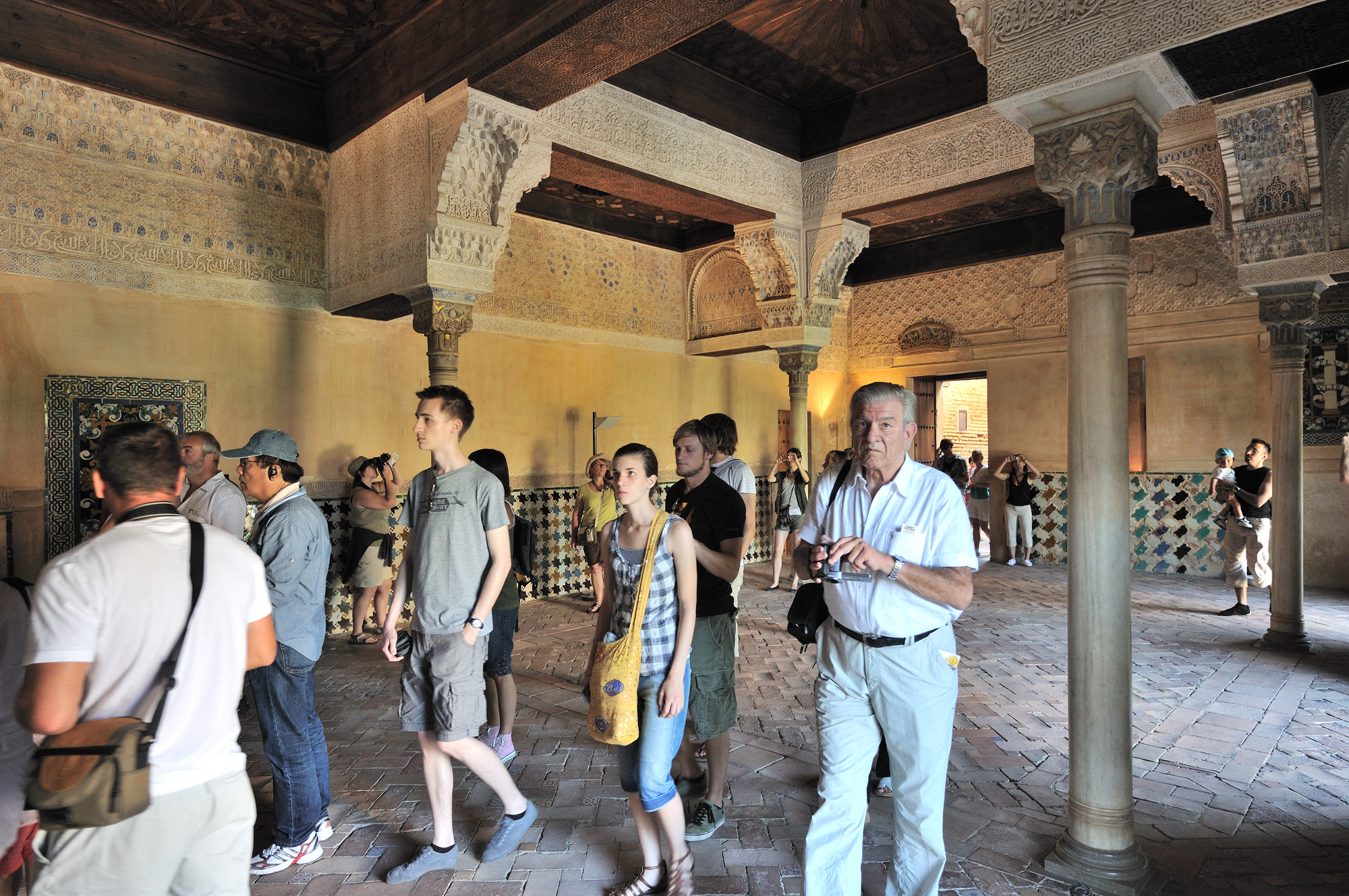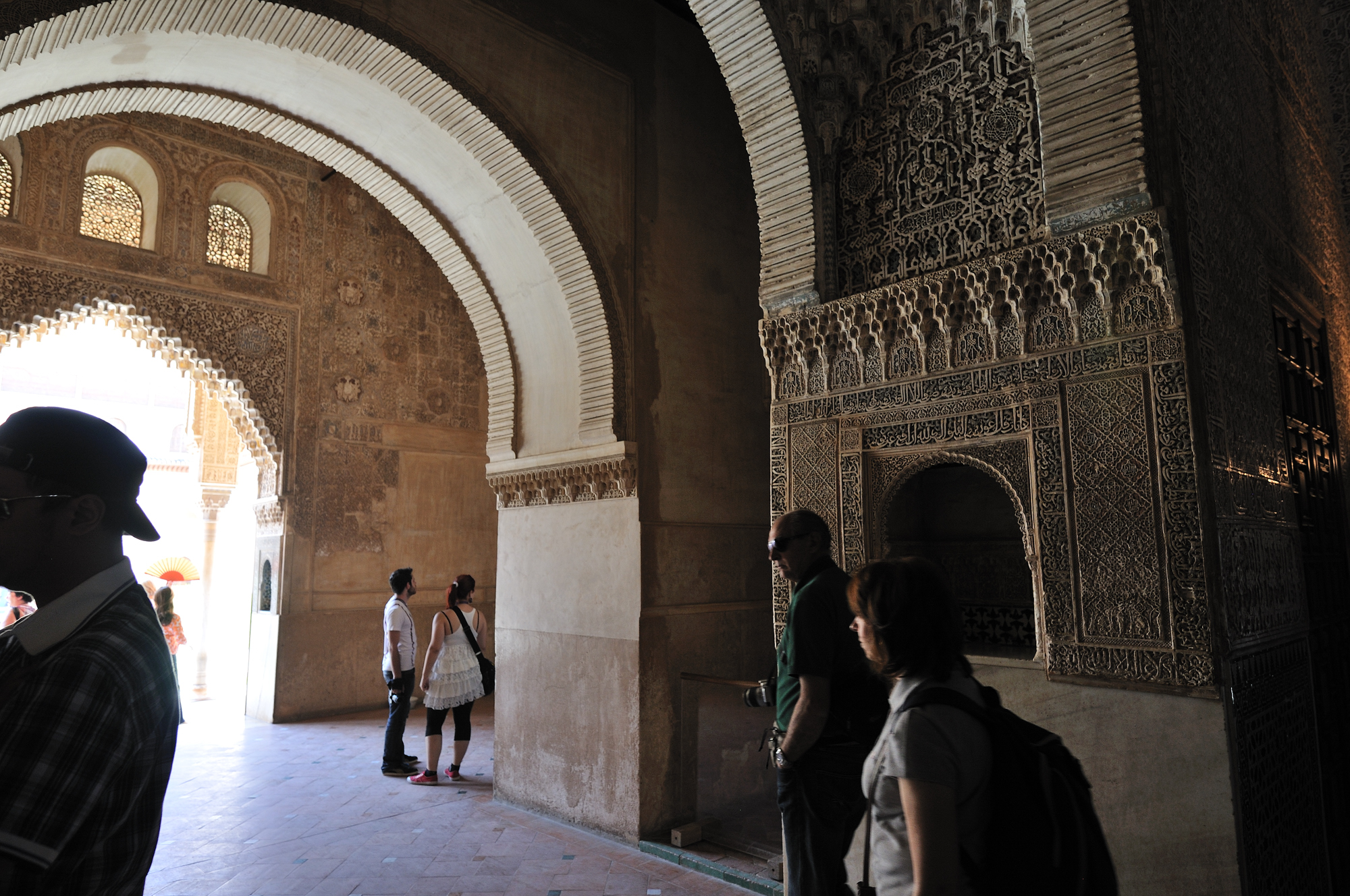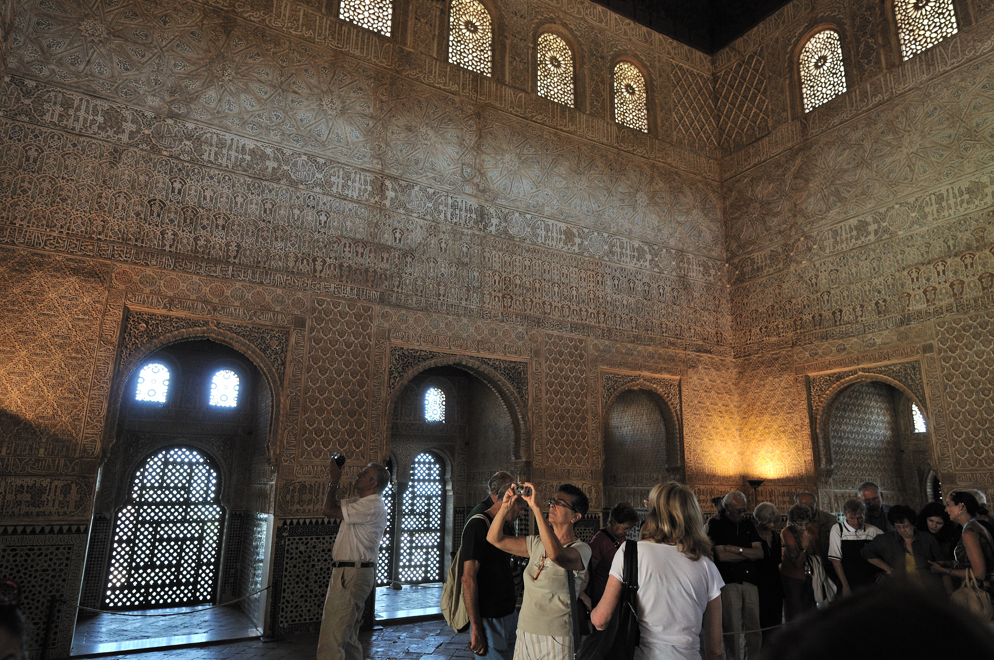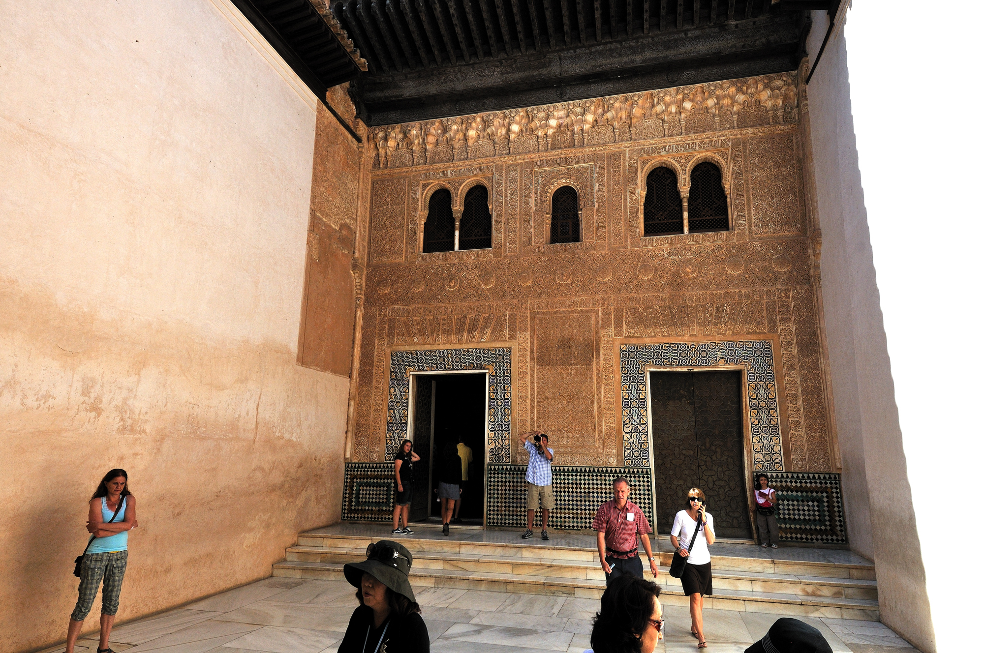 | 大使の間 [Salón de Comares] <Planⓛ> (11:58) 別名、「王座の間」とも呼ばれる、かってのイスラム教徒君主の謁見の間、床面積が約121㎡、天井の高さが約18mで、「コマレスの塔」の内部空間を全て占有している。 周囲の壁面はスタッコ仕上げで、モーロ風の幻想的な模様で飾られており、天井は落葉松材もしくはヒマラヤ杉材を用いたアラベスク模様で星空をイメージした造りになっている。 かっての天井は、ムカルナス (muqarnas) と呼ばれる形式の精緻な鍾乳石飾りで覆われ、金箔と原色顔料で色鮮やかに彩色されていたが、地震のために天井の大部分が崩壊してしまい、現在の天井に取って代わられている。 「北方向」MAPLay. 1 j |