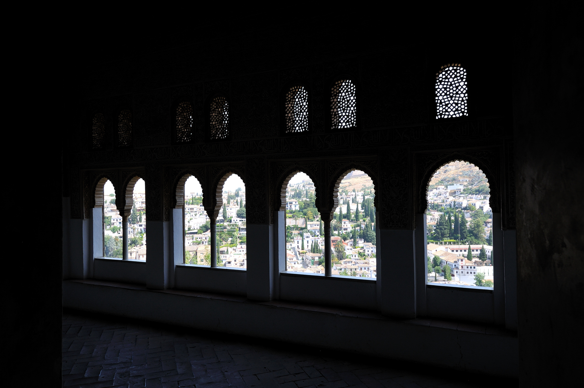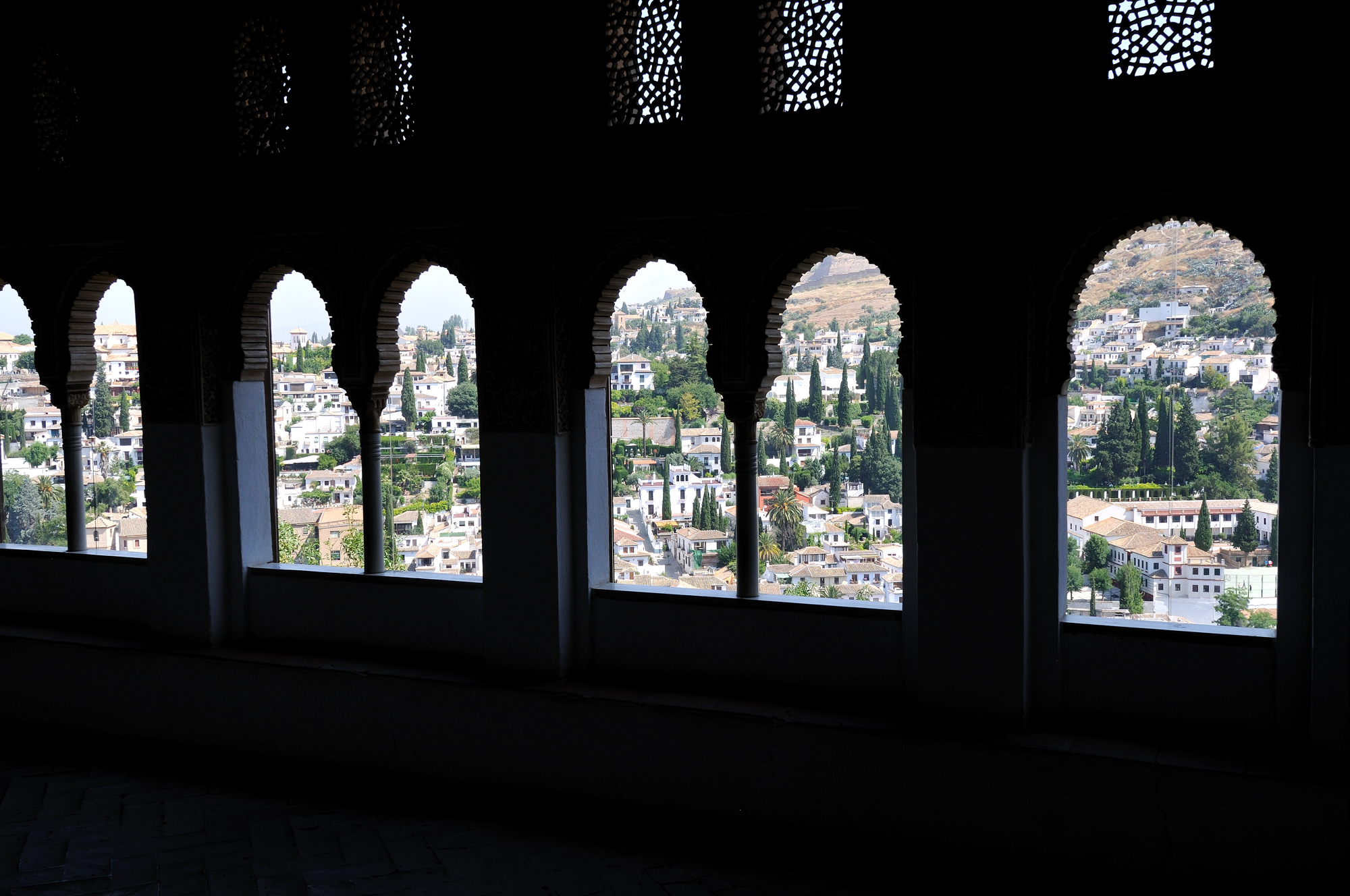 | アルバイシン [Albayzin] 地区<Planⓔ> (11:46) "黄金の間"のガラス窓から見るアルバイシン地区、ナスル王朝時代から1492年のグラナダ陥落までイスラム教徒の居住区として利用されていたグラナダ最古の町並。キリスト教徒によるグラナダ陥落の際にはアベン・ウメヤに指揮されたモーロ人の抵抗の砦となり、白壁と石畳はおびただしい流血に染められたという。敵の侵入を防ぐ城郭都市として作られたため、道は迷路のように入り組んでいる。 「北西方向」MAPLay. 1 d |