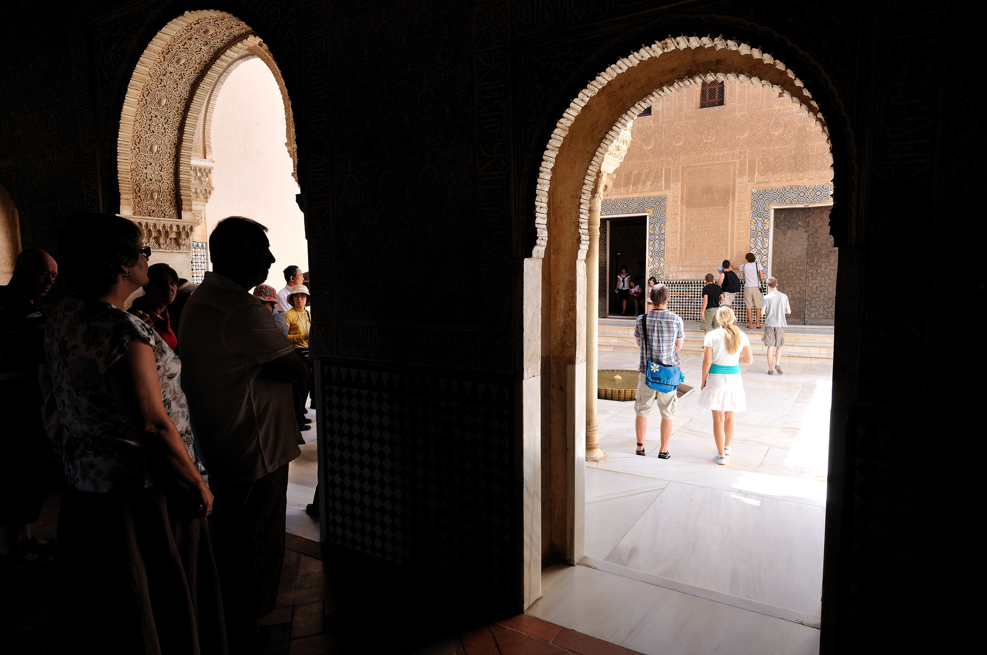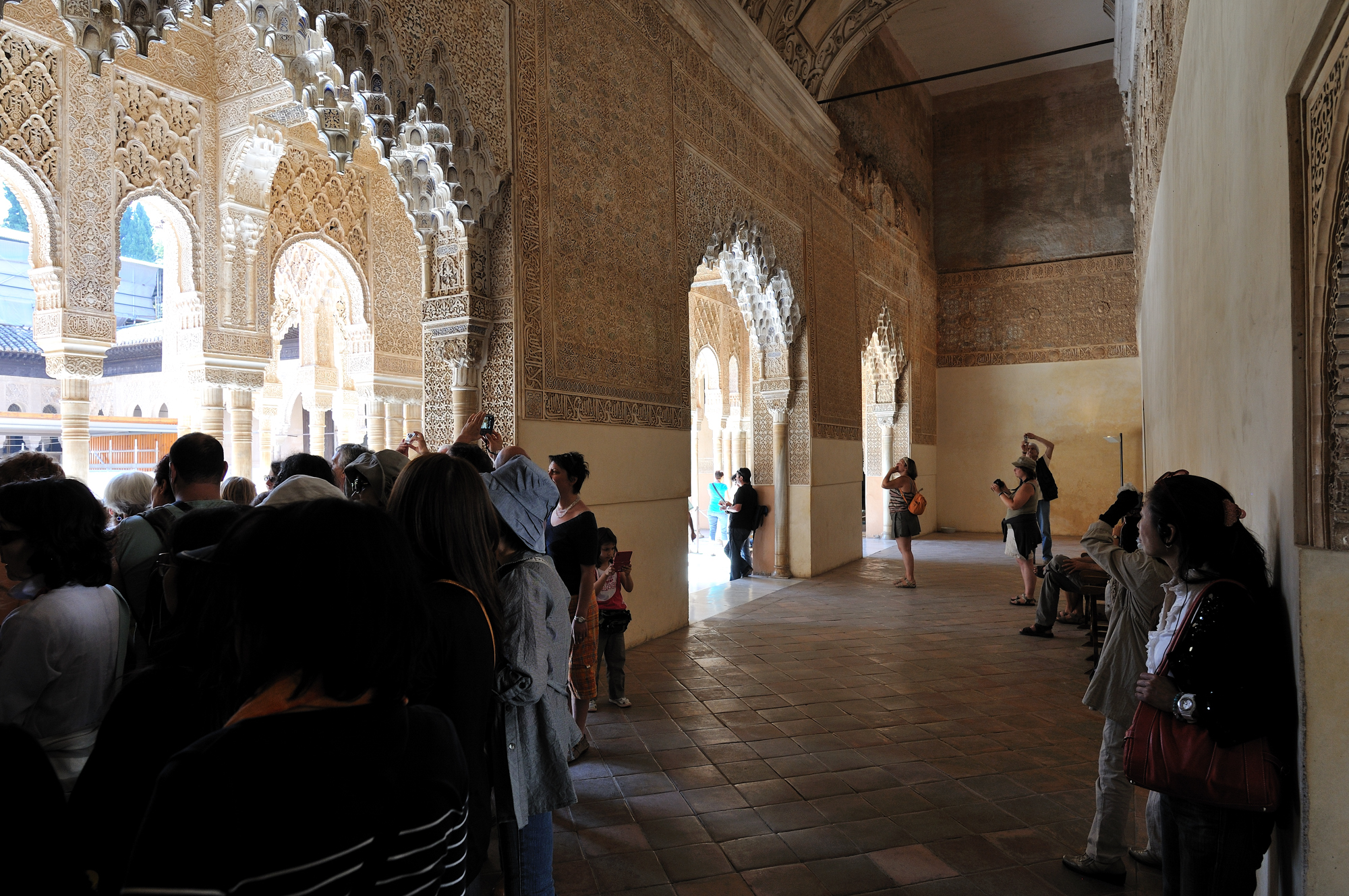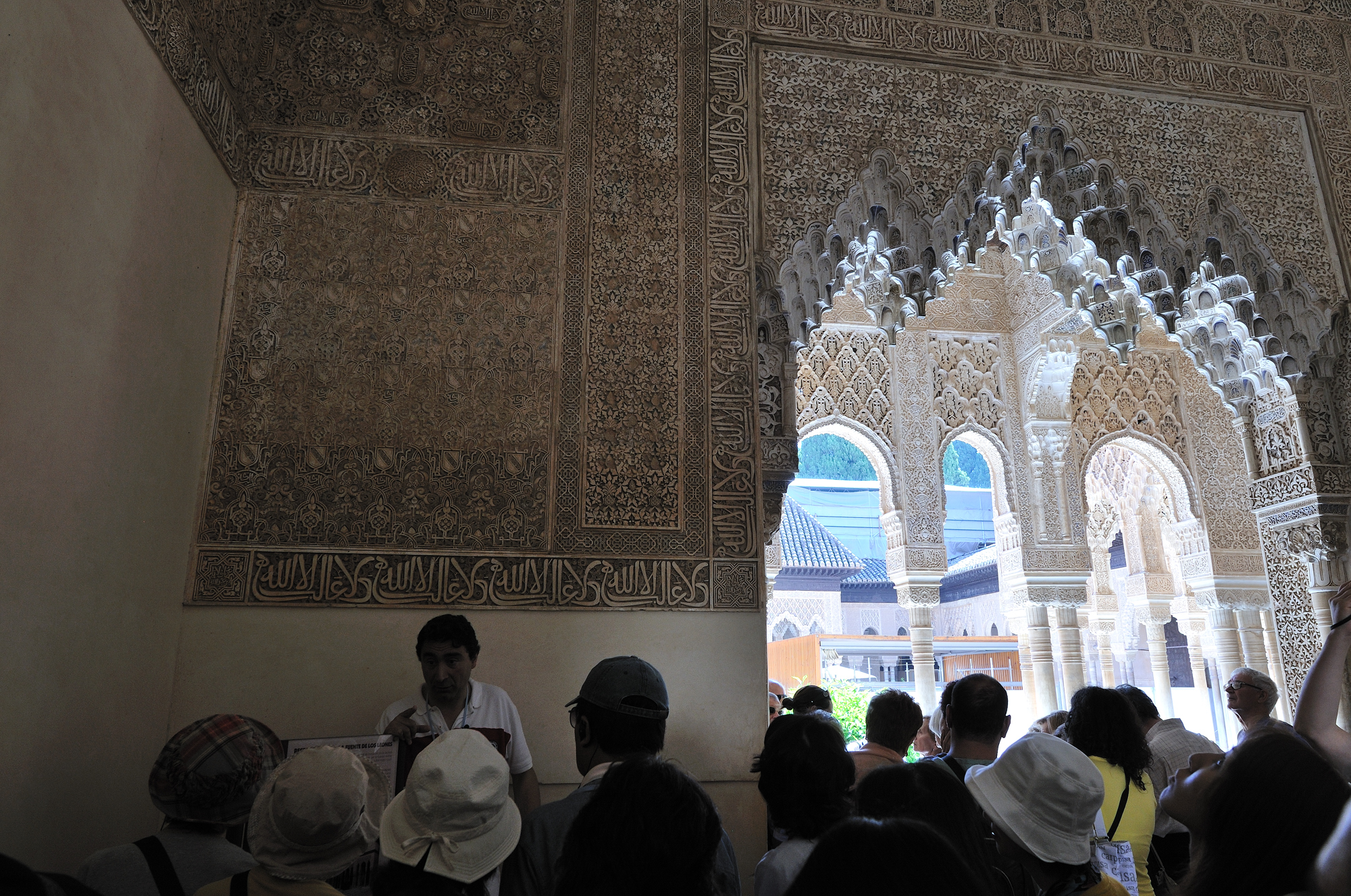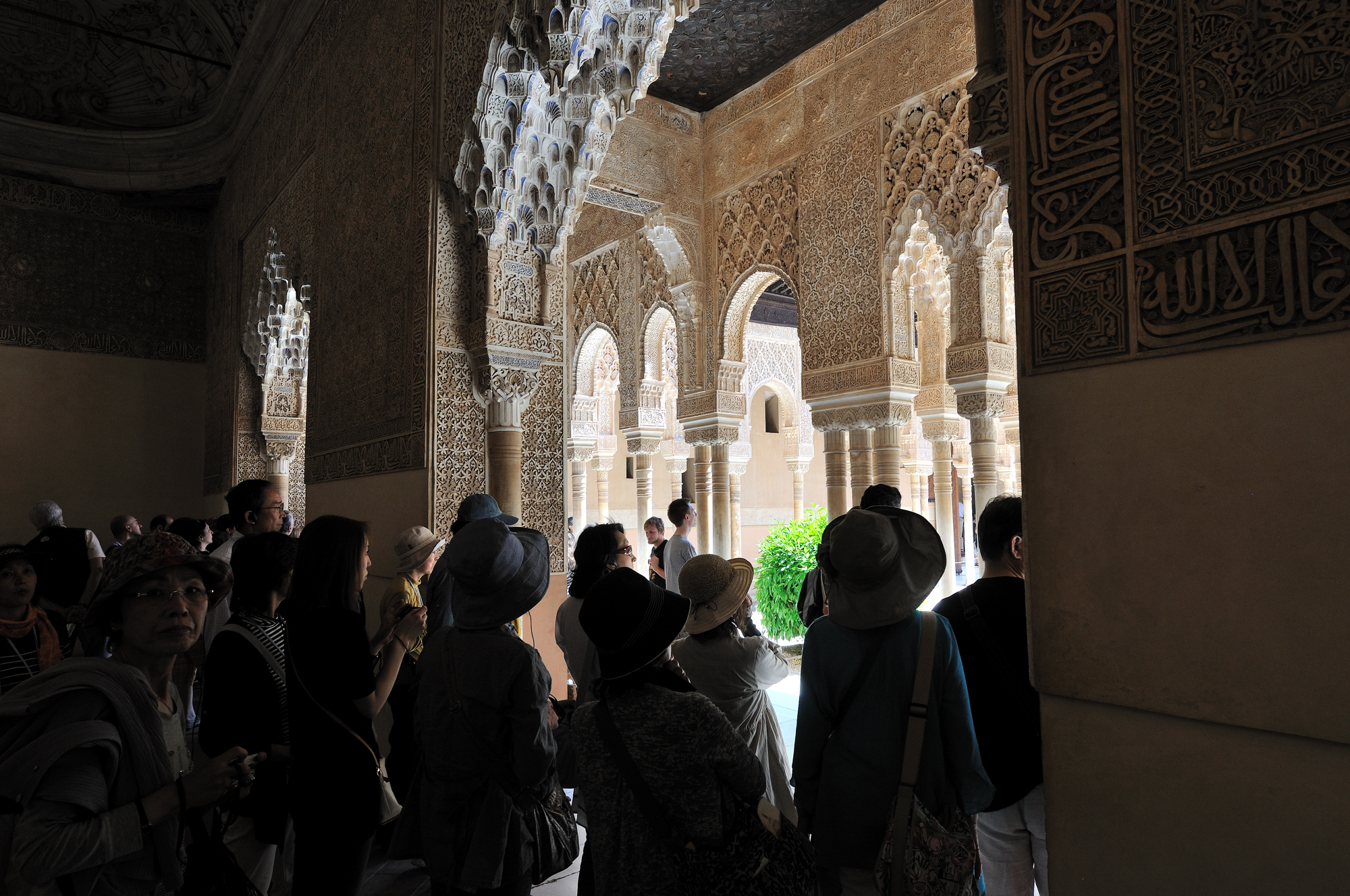 | ライオンの中庭 [Patio de los Leones] <Planⓢ> (12:09) ライオンの中庭は、四方を拱廊 (アーケード) がぐるりと囲んでいおり、拱廊は細い大理石の列柱によって支えられている。 柱と柱の間はモーロ様式の透かし彫り模様のスパンドレルで装飾され、数世紀を経た現在でも優雅で新鮮な輝きを放っている。 「南西方向」MAP Lay. 2 A |