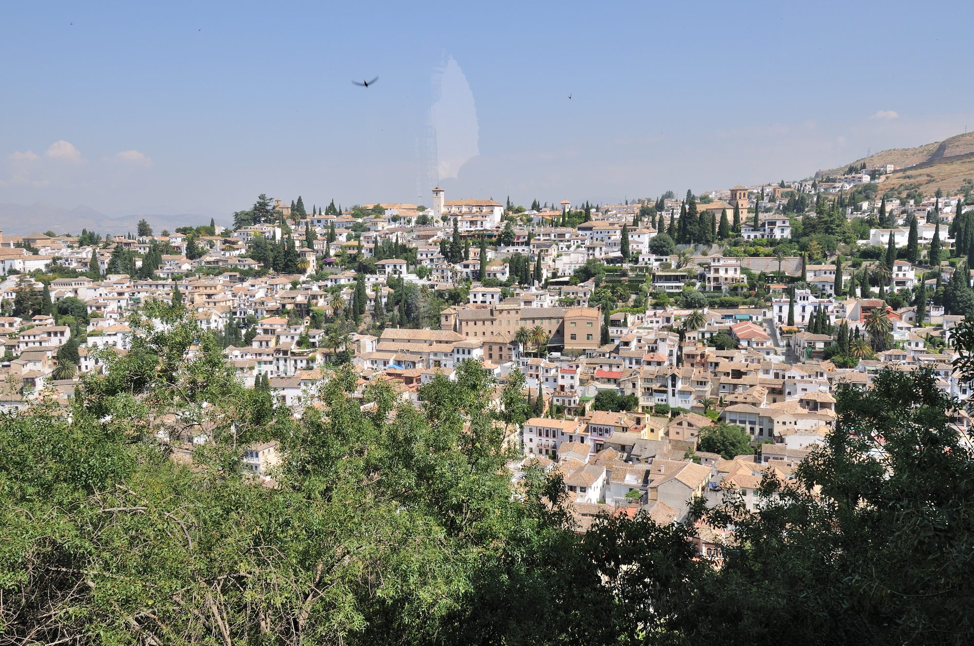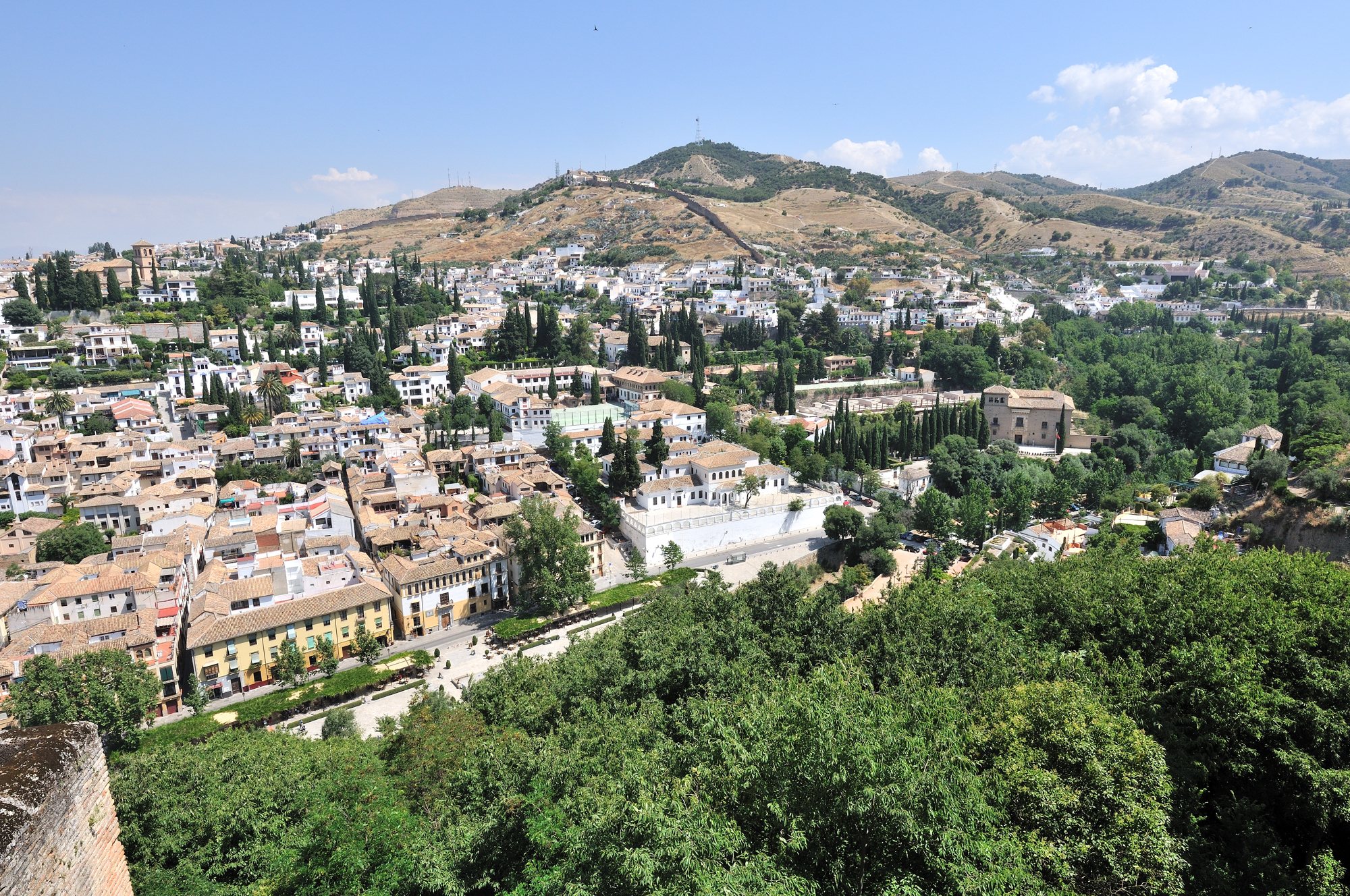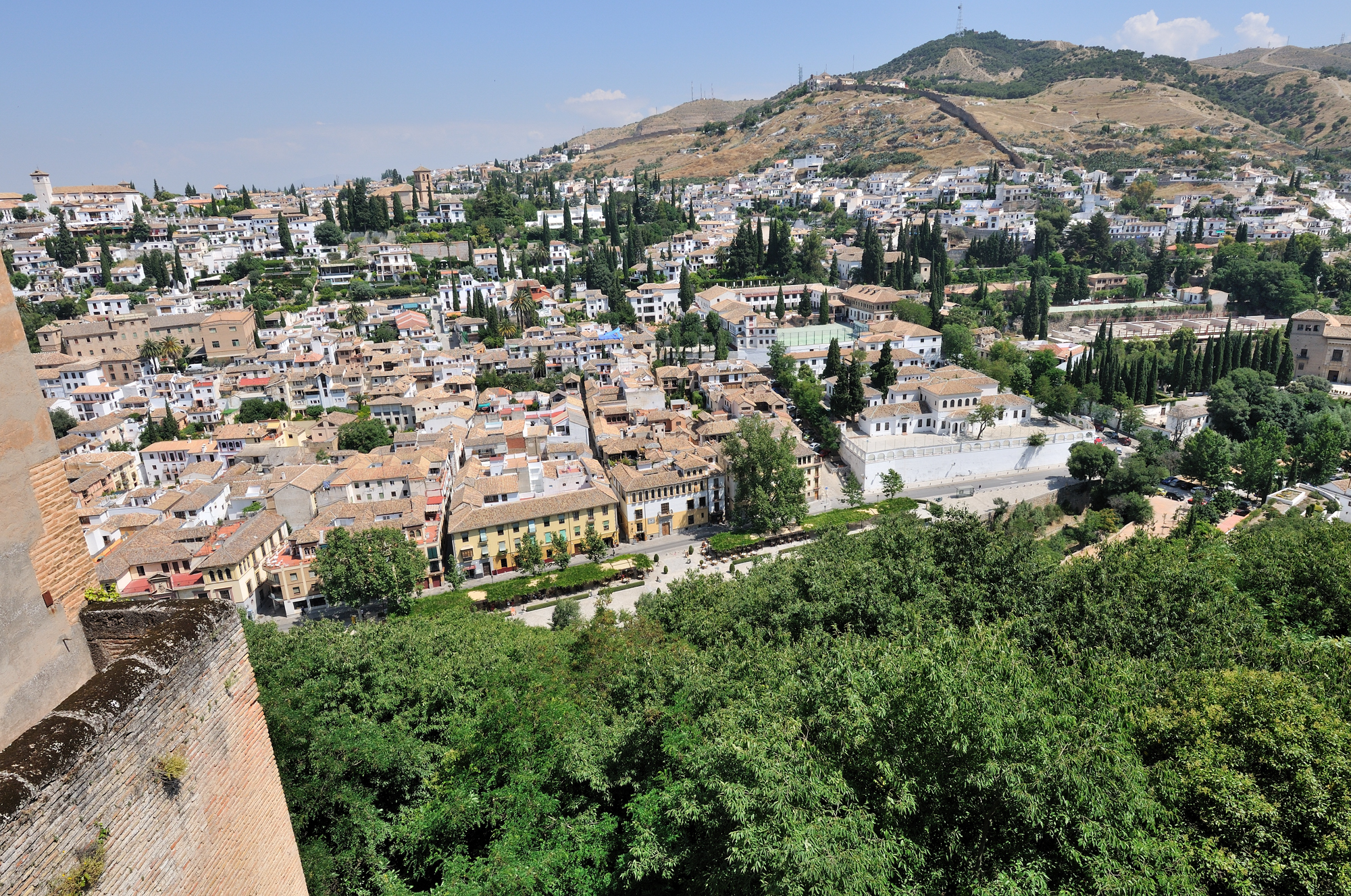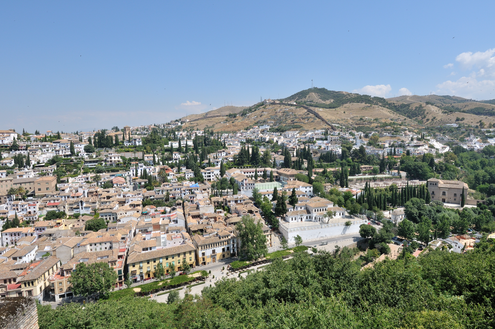 | 橋廊 (はしろう) からの眺望、アルバイシン [el Albayzín] <Planⓤ> (12:17) アルバイシンは市内を流れるダロ川*を挟んで、アルハンブラ宮殿と向かい合う丘に広がる旧市街地で、イスラム都市の特徴をよく表した、グラナダ最古の町並が残っている地区。敵の侵入を防ぐ城郭都市として造られたため、家々が密集し、勾配が急な細い道が迷路のように入り組んでいる。 ナスル王朝時代から1492年のグラナダ陥落までイスラム教徒の居住区として利用されていた。 キリスト教徒によるグラナダ陥落の際には、モーロ人の抵抗の砦となり、アラブ風に漆喰で塗られた白壁と石畳は、おびただしい流血で染められたと言われている。 1984年アルハンブラ宮殿、ヘネラリーフェ離宮とともに世界文化遺産に登録された。 「北北西方向」MAPLay. 2 B * ダロ川 [Río Darro] MAP |