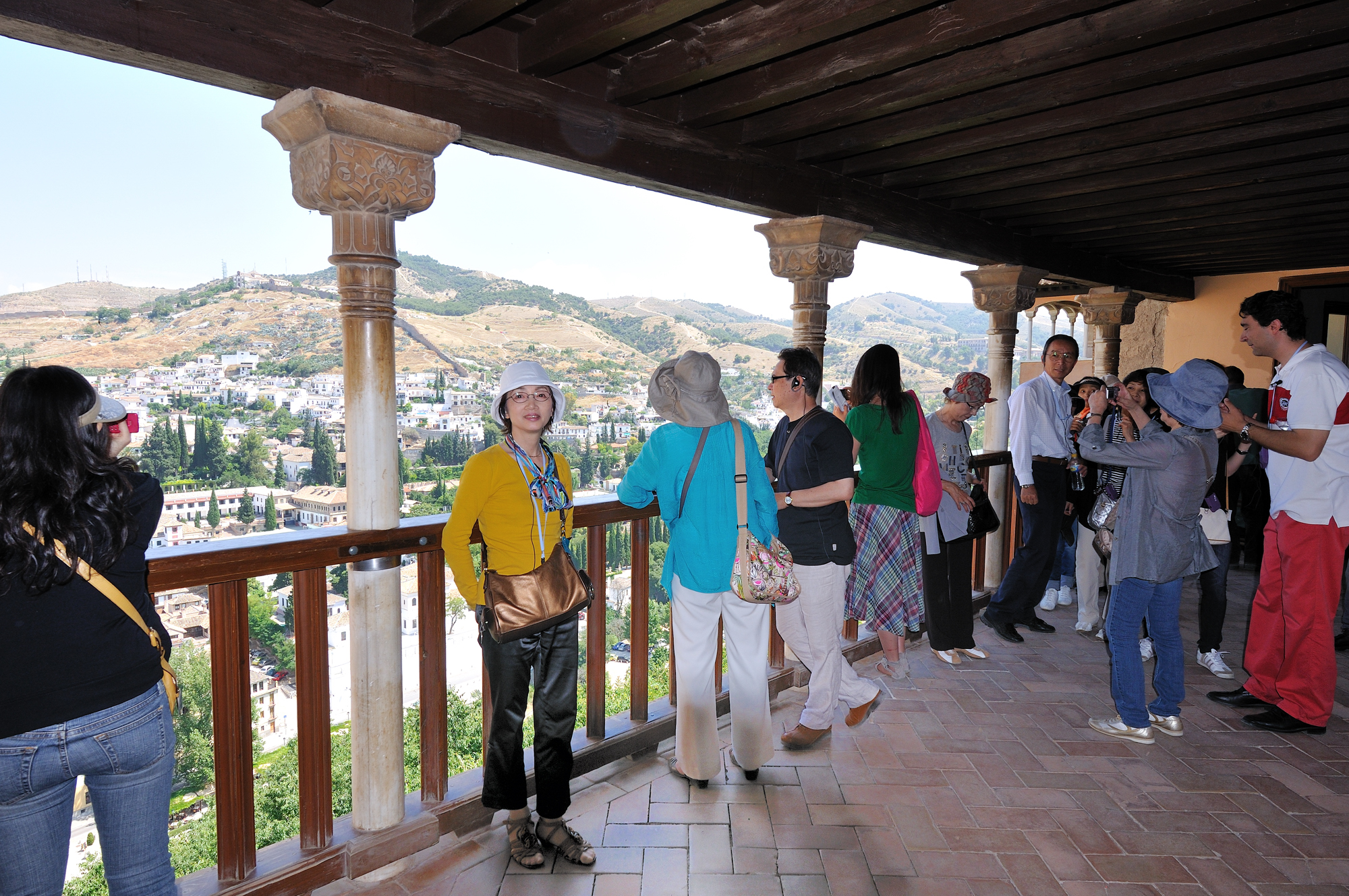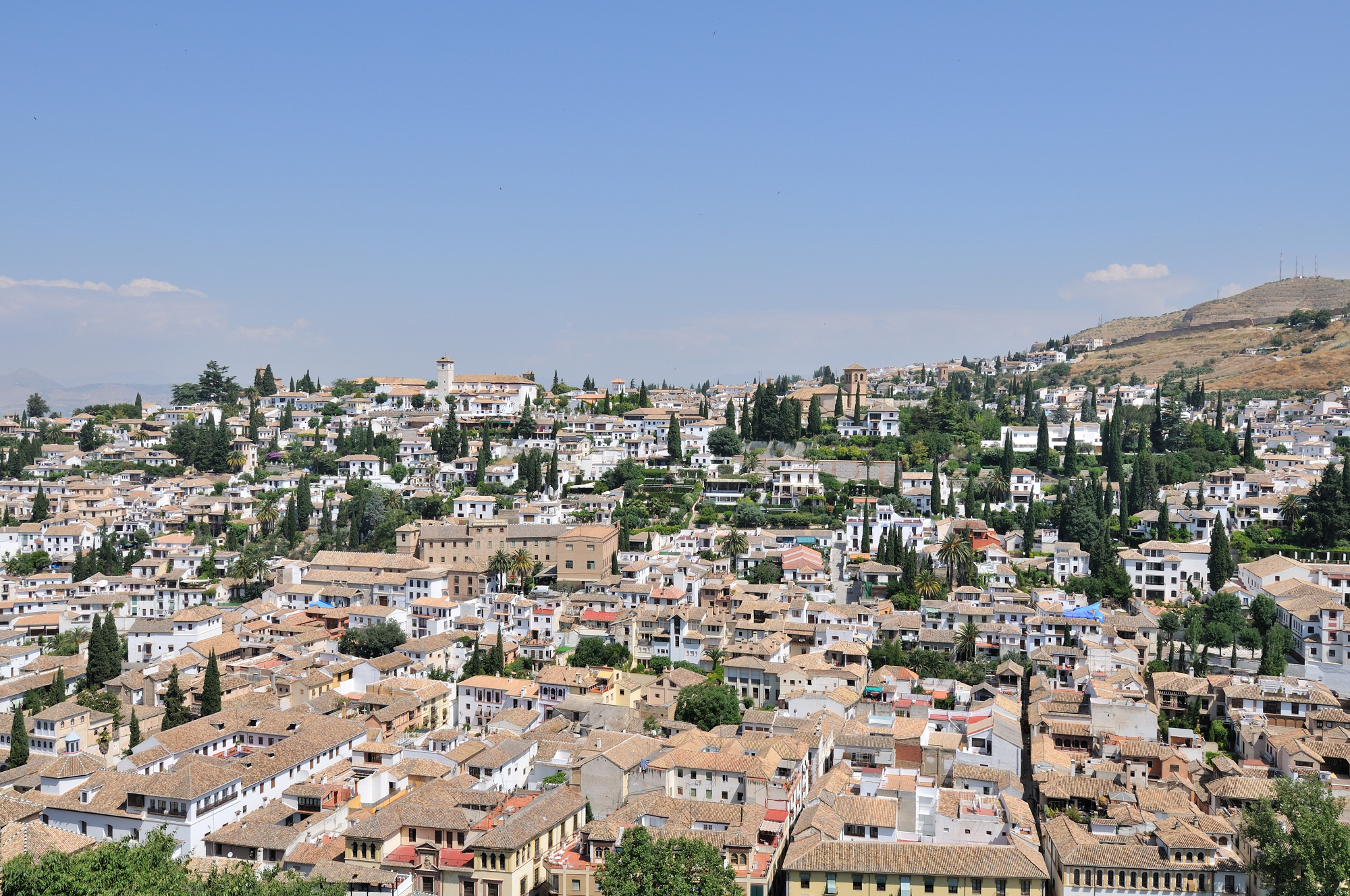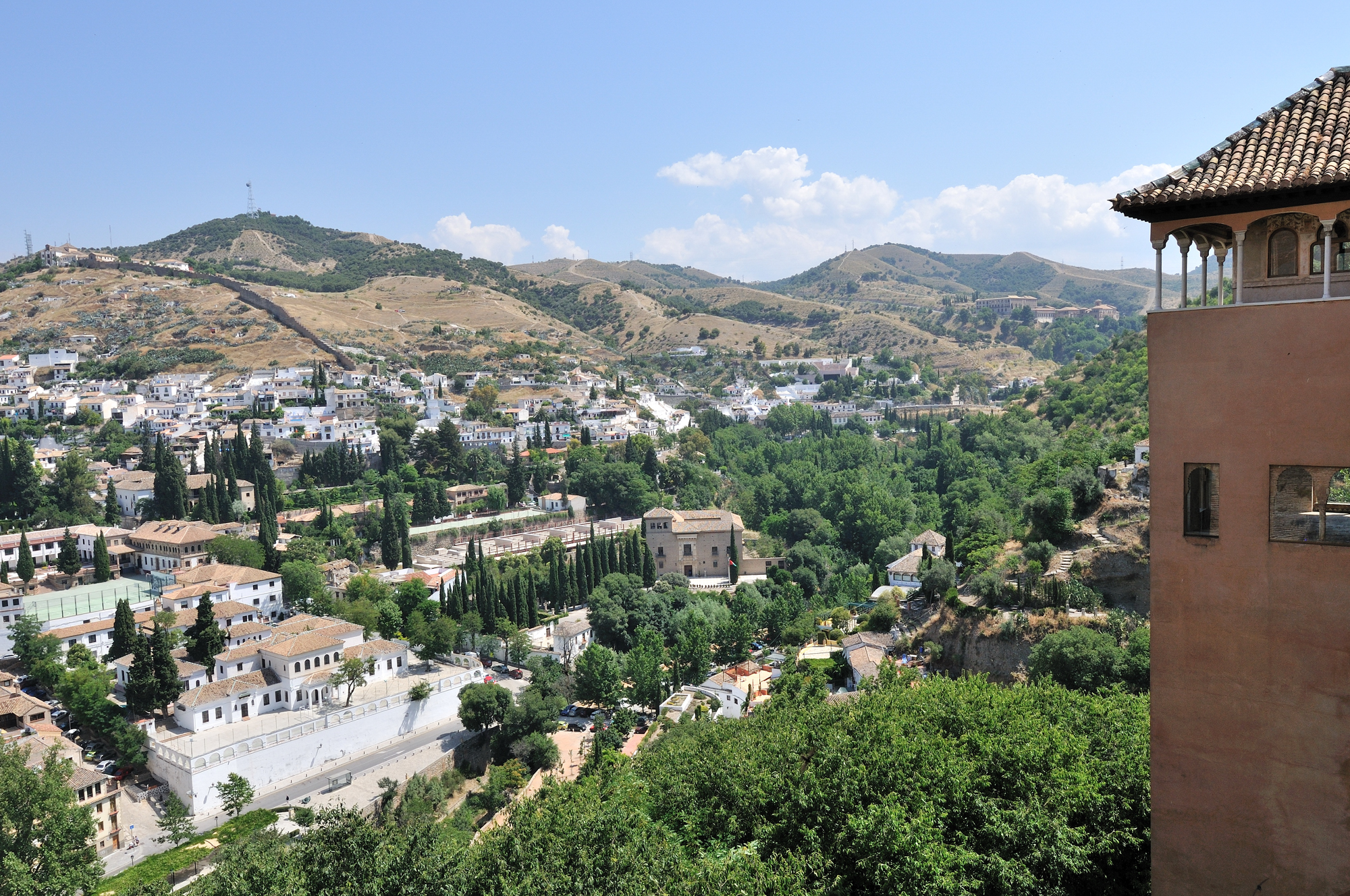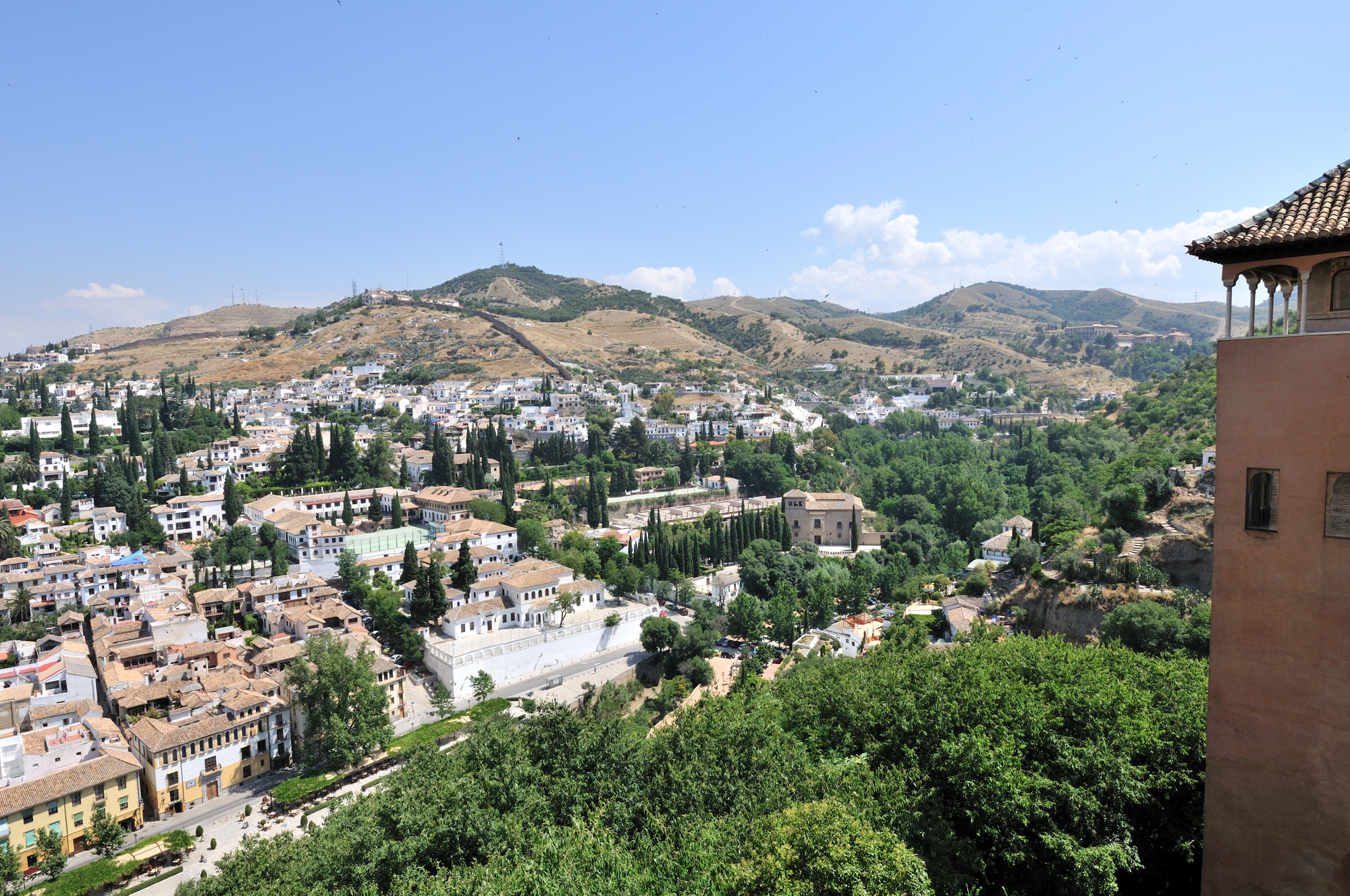 | 橋廊 (はしろう) からの眺望、アルバイシン [el Albayzín] <Planⓤ> (12:17) アルバイシンは市内を流れるダロ川*を挟んで、アルハンブラ宮殿と向かい合う丘に広がる旧市街地で、イスラム都市の特徴をよく表した、グラナダ最古の町並が残っている地区。敵の侵入を防ぐ城郭都市として造られたため、家々が密集し、勾配が急な細い道が迷路のように入り組んでいる。 ナスル王朝時代から1492年のグラナダ陥落までイスラム教徒の居住区として利用されていた。 キリスト教徒によるグラナダ陥落の際には、モーロ人の抵抗の砦となり、アラブ風に漆喰で塗られた白壁と石畳は、おびただしい流血で染められたと言われている。 1984年アルハンブラ宮殿、ヘネラリーフェ離宮とともに世界文化遺産に登録された。 「北北西方向」MAPLay. 2 B * ダロ川 [Río Darro] MAP |
