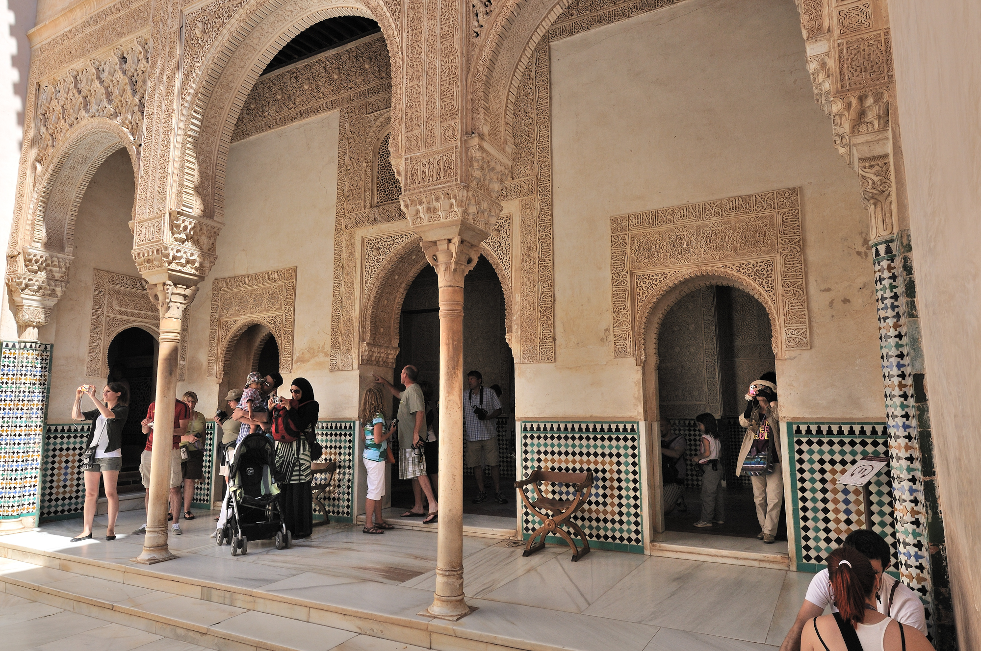 | ライオンの中庭 [Patio de los Leones] 、西側の拱廊 <Planⓟ> (12:06) ライオンの中庭は、四方を拱廊 (アーケード) がぐるりと囲んでいおり、拱廊はほそい大理石の列柱によって支えられている。 「南方向」MAPLay. 1 k |