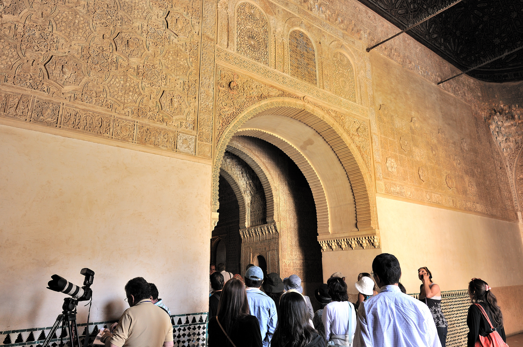 | 大使の間 [Salón de Comares] <Planⓛ> (12:00) 別名、「王座の間」とも呼ばれる、公式行事が行われていた「大使の間」の壁面は、スタッコ細工で作られたアラベスク模様で覆われている。 スタッコ細工は石膏をいろいろな鋳型に流し込んで型取り、多種多様な模様の石膏板を巧みに組み合わせてつなぎ合わせたもので、壁面をアラベスク模様で飾り、円天井を鍾乳石状の細工で飾る、この工法の発祥地は、ダマスカス (シリア) だが、それを高度に洗練させたのはモロッコのモーロ人である。 スタッコ細工の最も優雅な、幻想的な細部仕上げは、このモーロ式工法によって初めて可能となった。 中央に見える入口の向こうに、「アラヤネスの中庭」がある。 「南方向」MAPLay. 1 j |