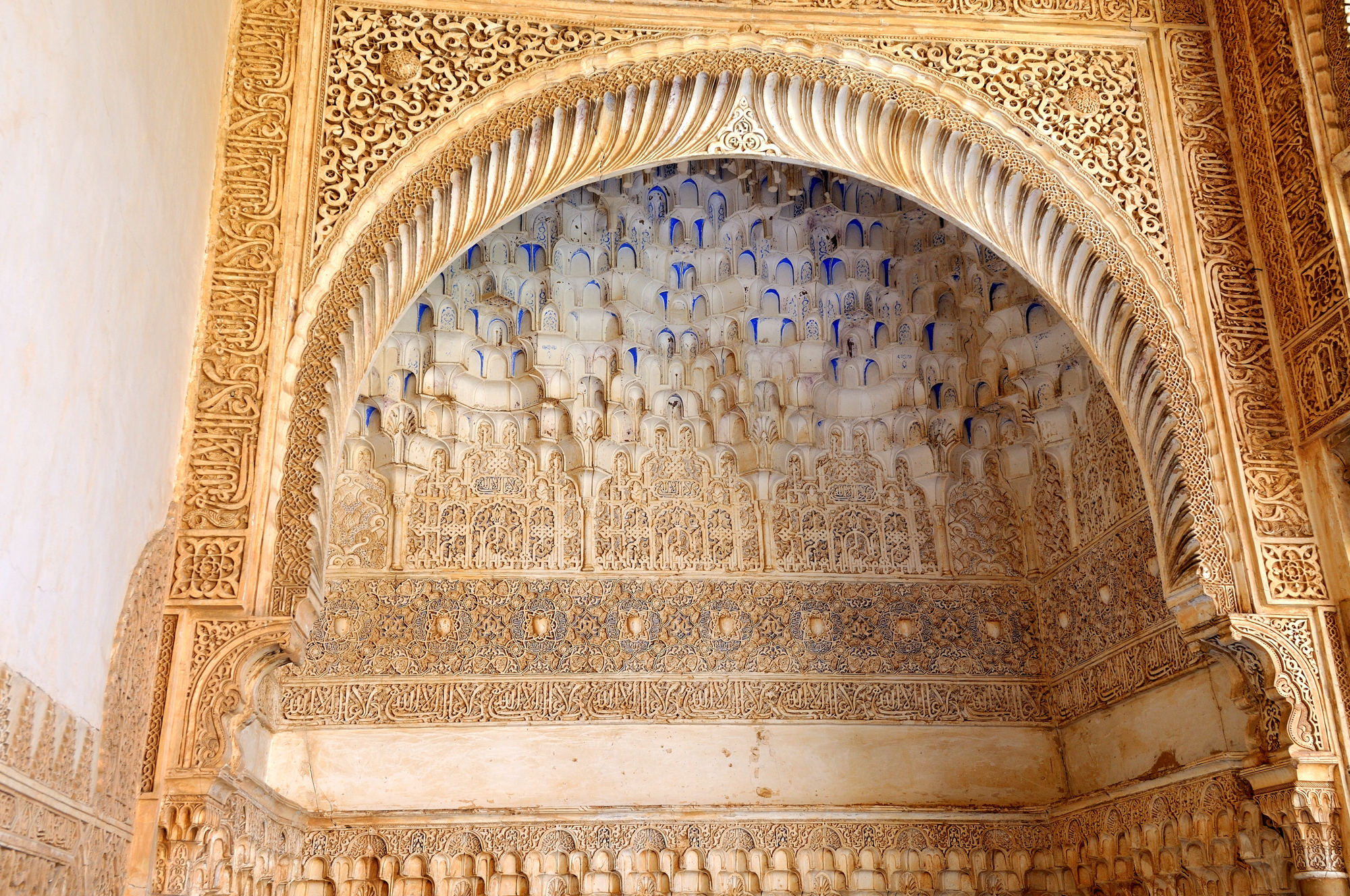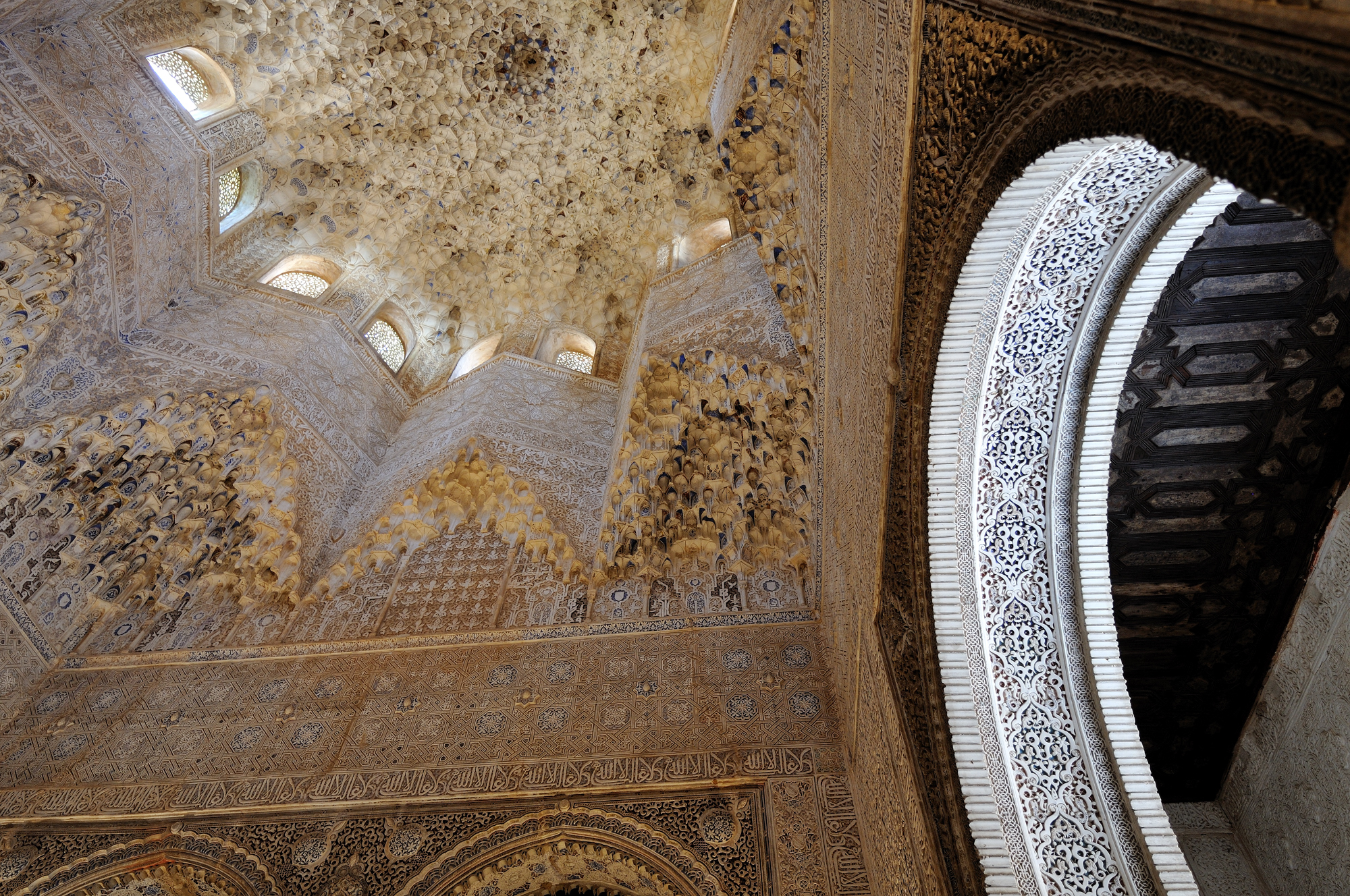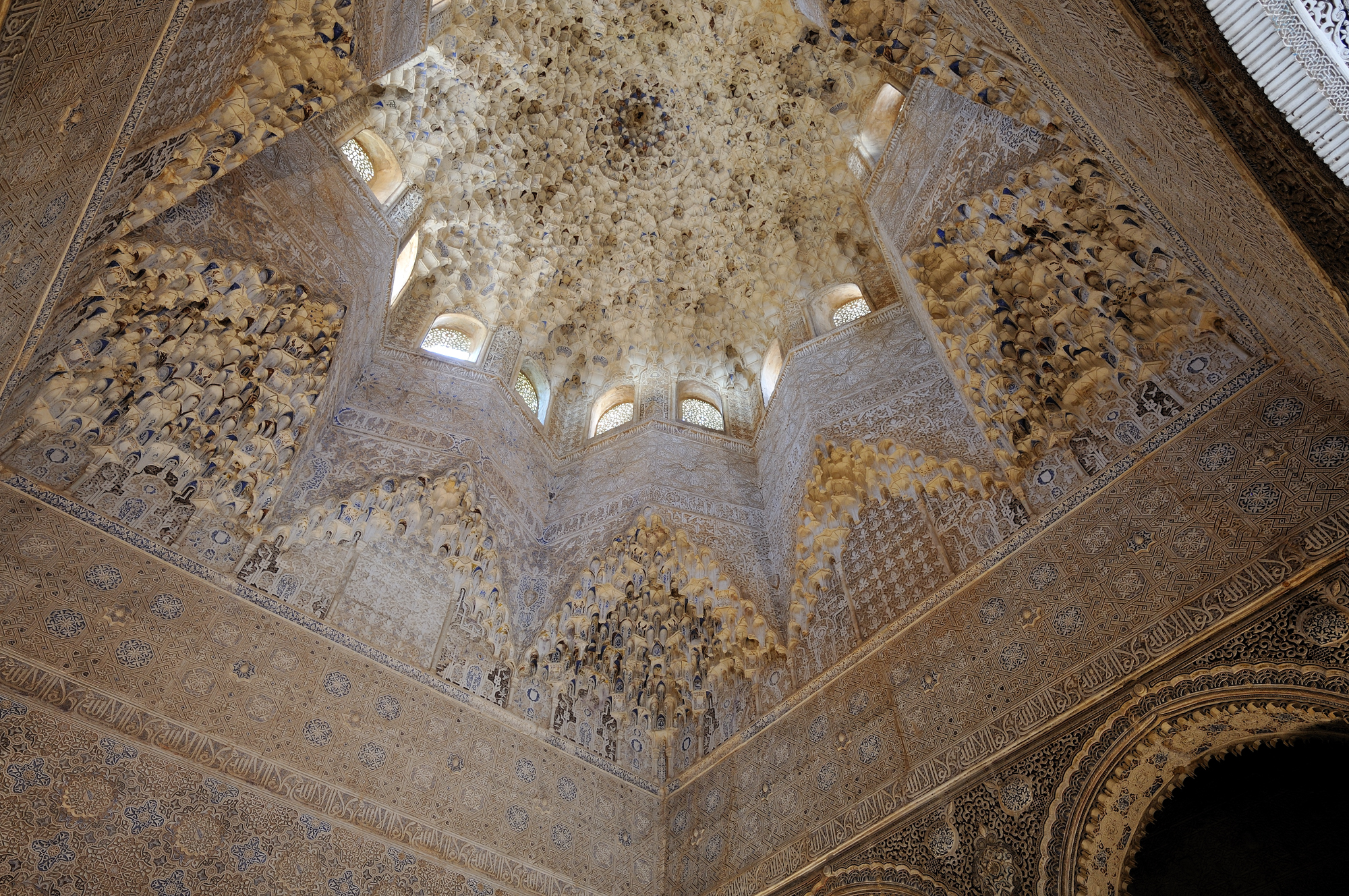 | アベンセラーヘ家の間 [Sala de los Abencerrajes ] <Planⓡ> (12:08) 巨大な蜂の巣とも"霜の花"とも見える、天井部の鍾乳石飾り (ムカルナス) と、スタッコ細工*で施されたアラベスク模様の壁面。 「南南西方向」MAPLay. 1 l * スタッコ細工は石膏をいろいろな鋳型に流し込んで型取り、多種多様な模様の石膏板を巧みに組み合わせてつなぎ合わせたもので、壁面をアラベスク模様で飾り、円天井を鍾乳石状の細工で飾る、この工法の発祥地は、ダマスカス (シリア) だが、それを高度に洗練させたのはモロッコのモーロ人である。 スタッコ細工の最も優雅な、幻想的な細部仕上げは、このモーロ式工法によって初めて可能となった。 |