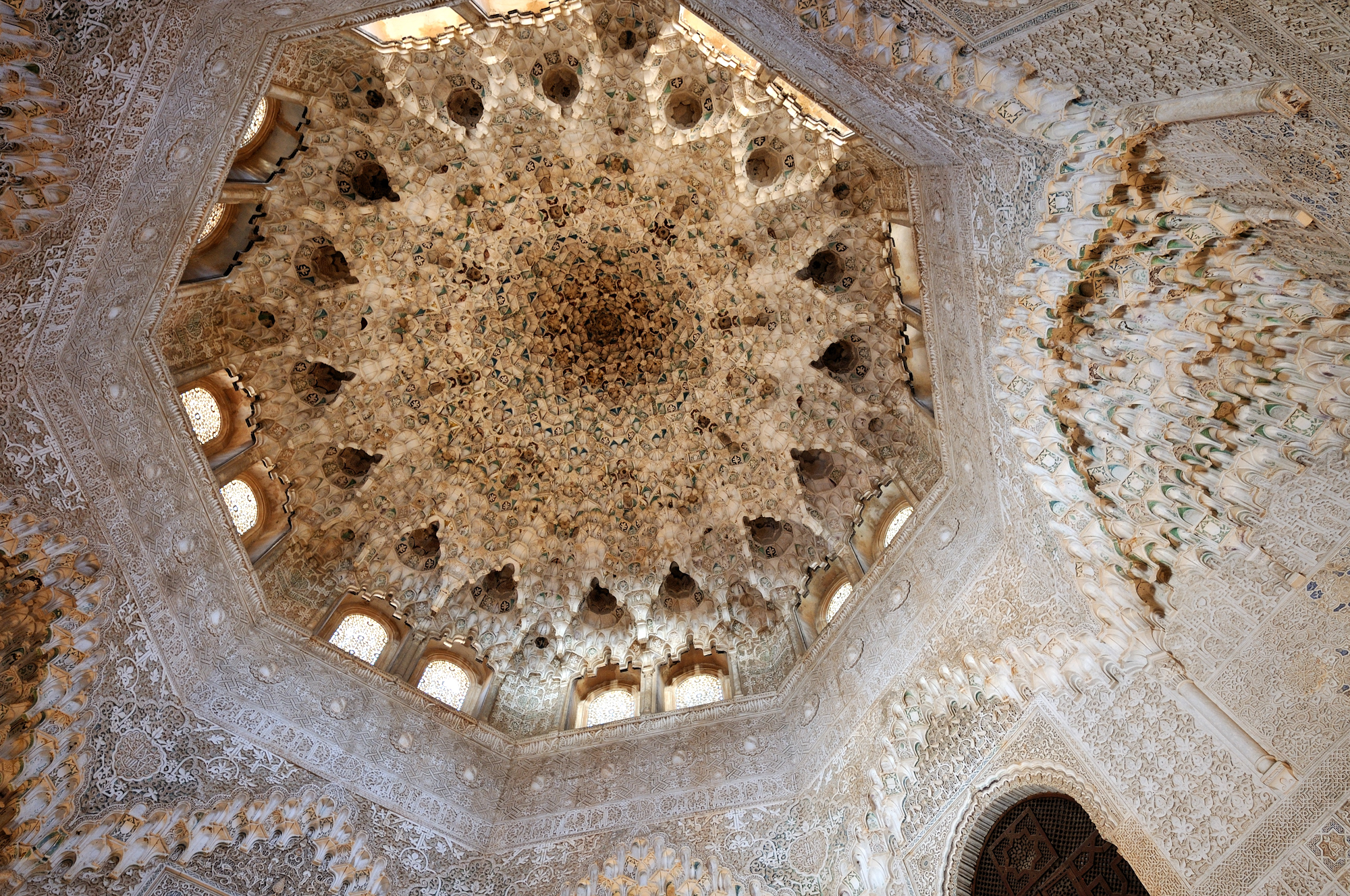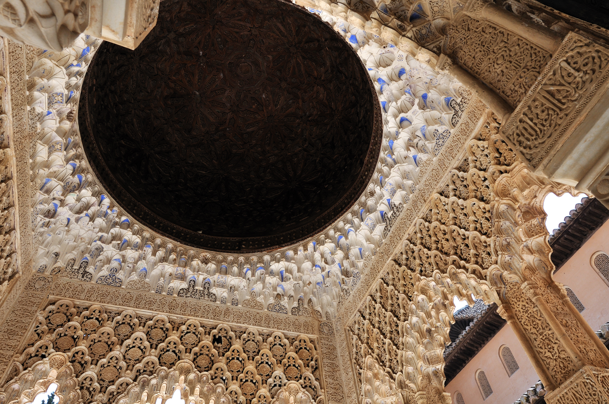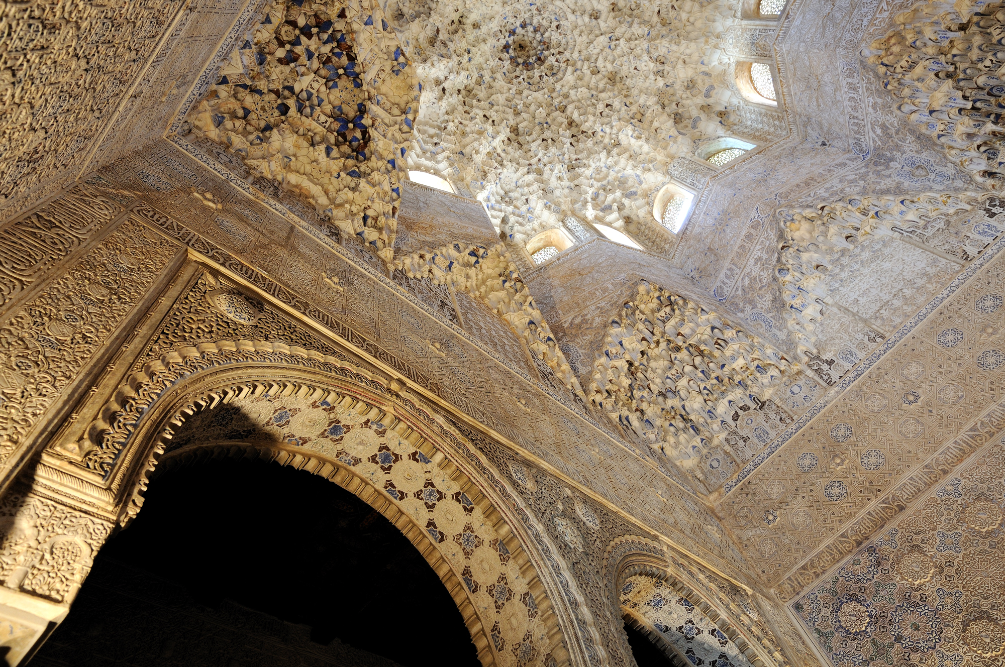 | ライオンの中庭 [Patio de los Leones] 地震などによる自然災害をほとんど被っておらず、モーロ様式*1の優雅な美的世界の輝きが、ほぼ往時のまま今に伝わっている。 天井の円蓋全体を覆い尽くすアラベスク装飾とそれを取り囲むように装飾された鍾乳石飾り (ムカルナス) 、モーロ様式の透かし彫り模様のスパンドレルなど数世紀を経た現在でも優雅で新鮮な輝きを放っている。 *1 スタッコ細工を用いて、壁面をアラベスク模様で飾り、円天井を鍾乳石状の細工で飾る、この工法の発祥地は、ダマスカス (シリア) だが、それを高度に洗練させたのはモロッコのモーロ人である。 スタッコ細工の最も優雅な、幻想的な細部仕上げは、このモーロ式工法によって初めて可能となった。 (スタッコ細工は石膏をいろいろな鋳型に流し込んで型取り、多種多様な模様の石膏板を巧みに組み合わせてつなぎ合わせたもの) |