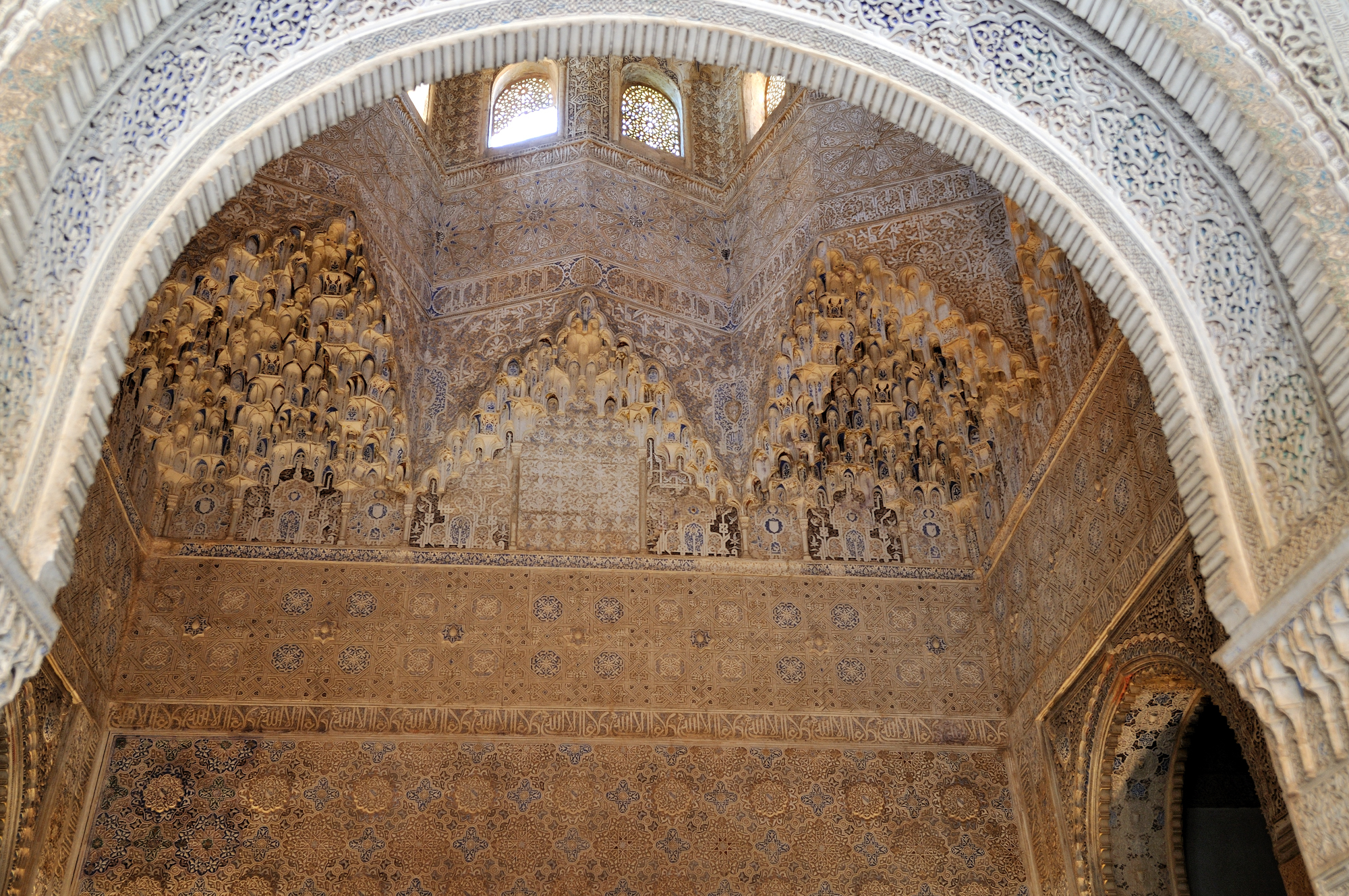 | アベンセラーヘ家の間 [Sala de los Abencerrajes ] <Planⓠ> (12:07) イスラム教徒であるアベンセラーヘ家は、オリエント出身の諸部族の中でも、予言者ムハンマドの盟友部族の一つ、ベニ・セラヒの血を引く純潔中の純潔、まさしく名門の誇り高い家系であった。当時、ムレイ・アブール・ハッサン王は、ムハンマド左利き王*の娘アイシャ・ラ・ホルラ公女と結婚し、彼女との間に二人の王子をもうけたが、その長子が、ボアブディルである。しかし、王は壮年期になって、もう一人の后を迎えた。若く、美しいキリスト教徒の捕虜で、本名はイサベル・デ・ソリス。しかし、モーロ人の間では、ソライア妃の名で通っていた。そして、王は第二王妃との間にも、二人の王子をもうけた。宮廷では、王位継承権をめぐって王妃同士の敵対関係が生じ、二つの党派が生まれた。ソライア妃の側には、ベネガス家のアブール・カシム・ベネガスと、その弟レドゥアン・ベネガス、そして多くの縁者たちがいた。反対に、アベンセラーヘ家は、アイシャ妃の側についた。主たる理由はベネガス家に対する代々の怨念とともに、かつてアベンセラーヘ家一族を引き立ててくれたムハンマド左利き王の息女であるアイシャ妃への強い忠誠心からである。そんな中、アイシャ王妃の陰謀説が巧みにムレイ・アブール・ハッサン王の耳に吹き込まれた。すなわち、王妃は、夫である現王を追放して、息子のボアンブディルを王位に就けようと謀を巡らせている、というものだった。王は激怒して母子を「コマレスの塔」に監禁し、思わず我を忘れて、ボアブディルは生かしておくまい、と口走った為、心配した母の王妃は、深夜、自分のスカーフと侍女たちのスカーフをかき集めて繋ぎ合わせると、塔の窓から息子を吊り下ろし、逃亡させた。アベンセラーヘ家の騎士たちがアルハンブラ宮殿広場で虐殺されたのは、数種の年代記に照らしてみると、ちょうどこの時期に当たる。その命を発したのは、アイシャ王妃の陰謀にアベンセラーヘ家が加担したにちがいない、と思いこんだムレイ・アブール・ハッサンであった。年代記によれば、アベンセラーヘ家の騎士の相当数を処刑することによって叛徒の見せしめにすべきだ、と王に奏上したのは、ほかならぬ宰相アブール・カシム・ベネガスだった。 * ムハンマド9世(Muhammed IX、1419-1427, 30-31, 32-45, 48-53)は、左利きのため、またすることなすこと思いどおりに行かず、悲運に見舞われ続けたため「左利き王」と呼ばれた。左利き王は、三度グラナダ王の王位から追放され、三度復位した。 「南方向」MAPLay. 1 l アーヴィング著 (平沼孝之訳) 「アルハンブラ物語」より引用 |