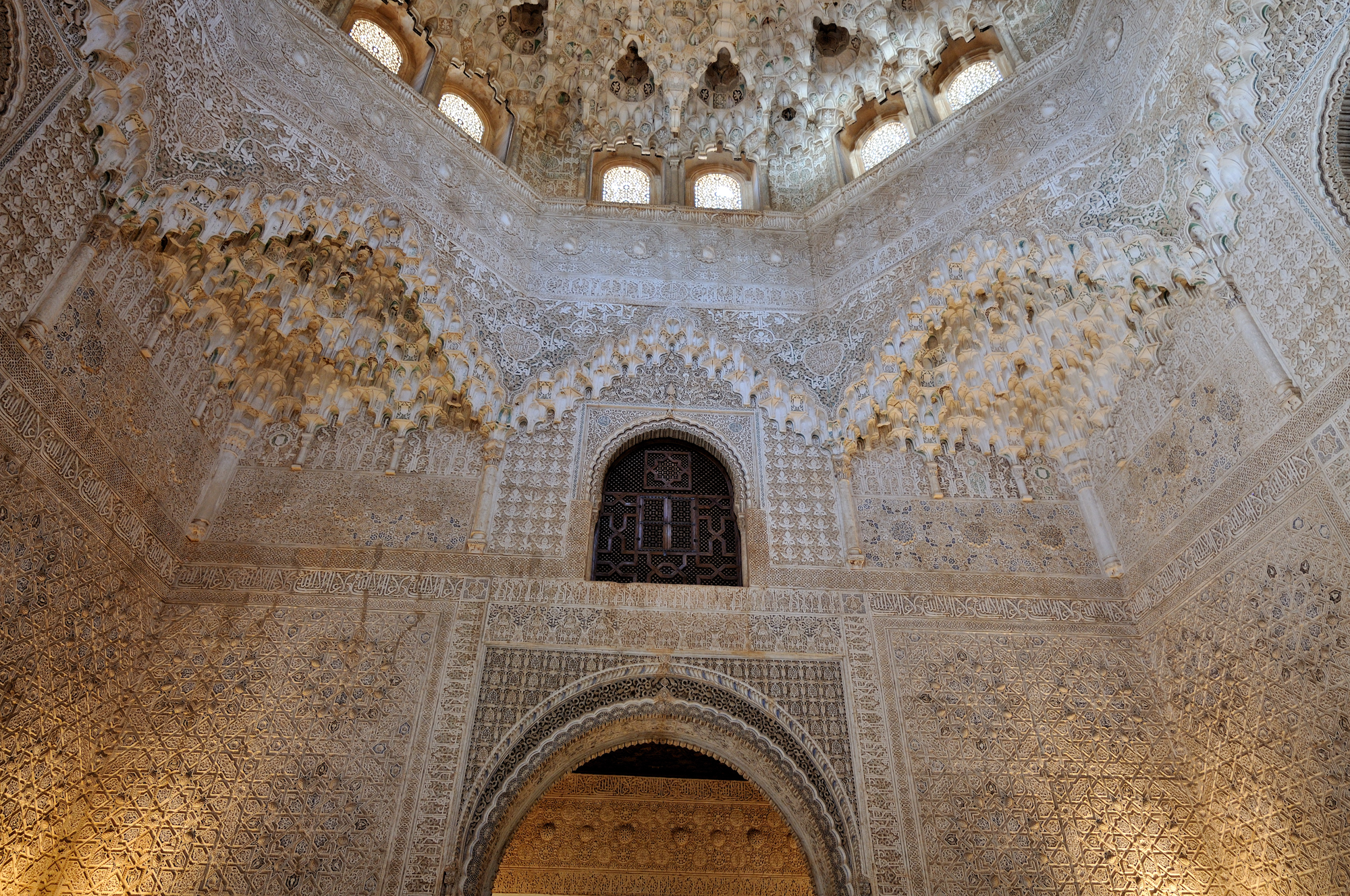 | アベンセラーヘ家の間 [Sala de los Abencerrajes ] <Planⓡ> (12:08) 巨大な蜂の巣とも"霜の花"とも見える、天井部の鍾乳石飾り (ムカルナス) と、スタッコ細工で施されたアラベスク模様の壁面。 右に見えるアーチが入口。 「西方向」MAPLay. 1 l |