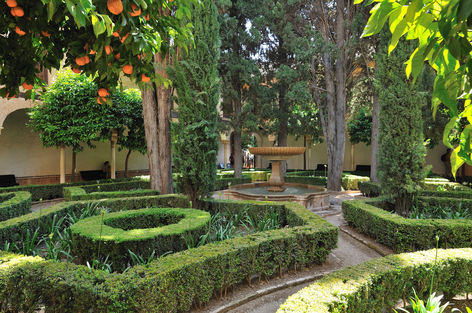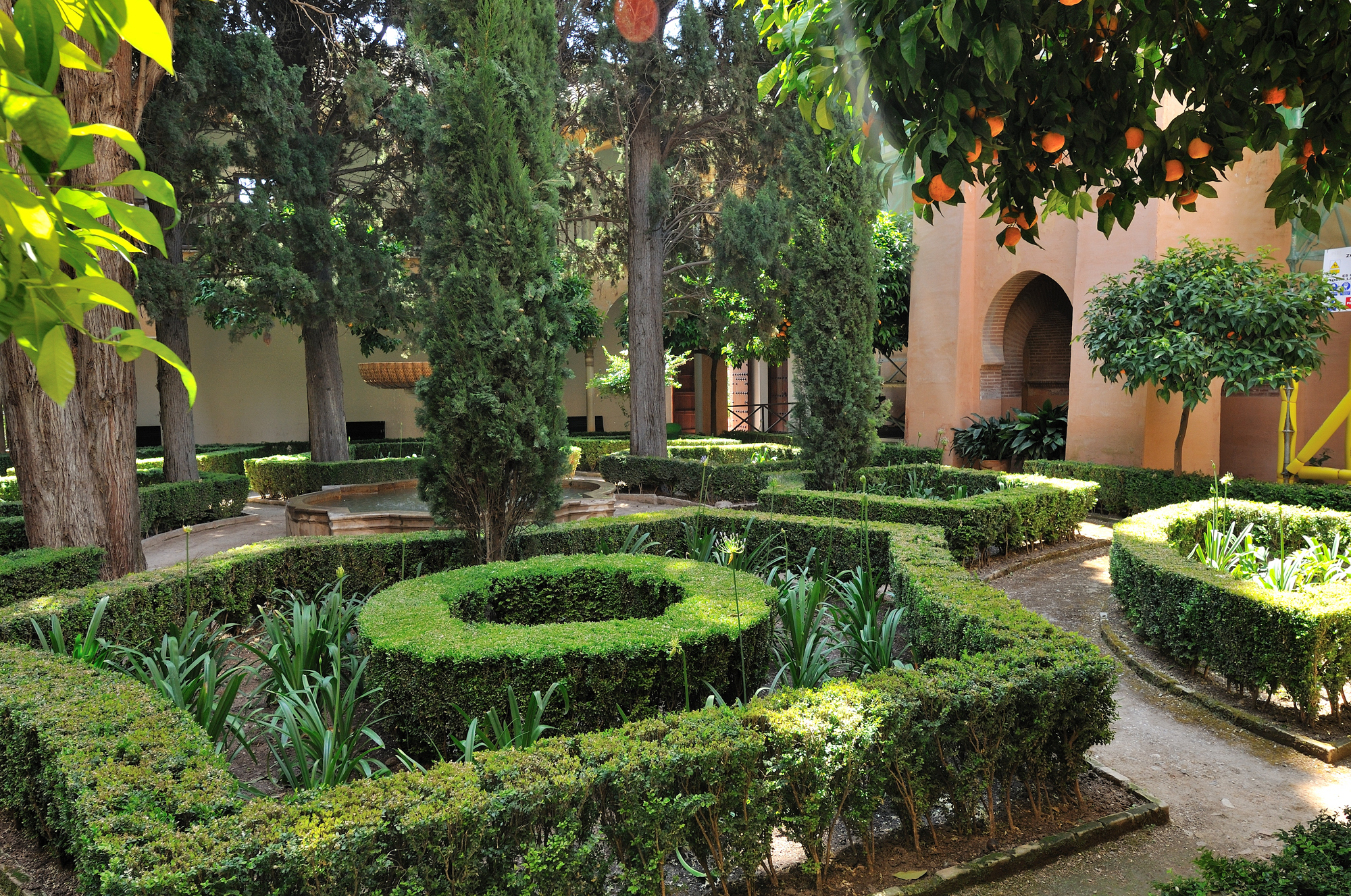 | リンダラーハの庭 [Jardín de Lindaraja] <Planⓥ> (12:22) 庭の中心部に噴水が施され、それを囲むようにオレンジやシトロン、糸杉などの樹木が配されている。 右に見える出入り口 (アーチ形の門) の上部がリンダラーハの展望楼 [Mirador de Lindaraja] / [Mirador de Daraxa] となっている。 「南東方向」MAPLay. 2 C |