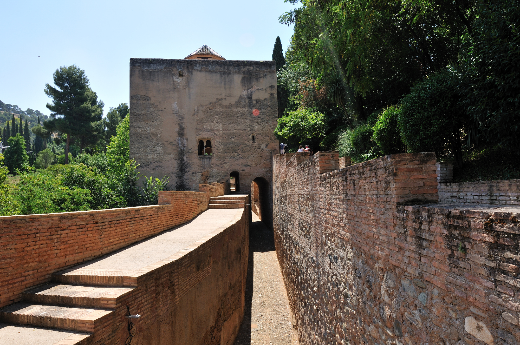 | 王女の塔 (ラス・インファンタスの塔) [Torre de las Infantas] (12:40) 「王女の塔」の名の由来は、以下の伝承に基づいている。 かつて、ムハンマドという名のモーロ人の王に、三人の愛らしい娘をいちどに授かった。 王は、イスラム教徒の君主の習わしによって、占星術師によって、三人の王女の出生の星について占ってもらったところ、「三方とも、とくに結婚適齢期を迎える頃は監視を怠らないように。」とのことであった。そこで、王は異性の眼に触れない安全な場所として、この塔に三人の王女を住まわせた。 「南東方向」MAPLay. 2 M |