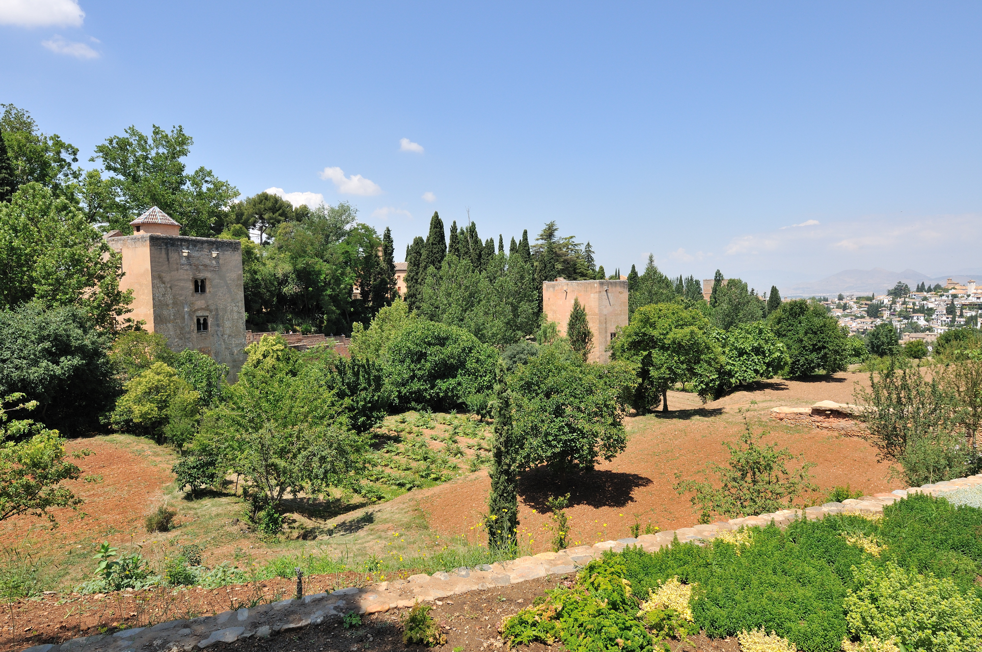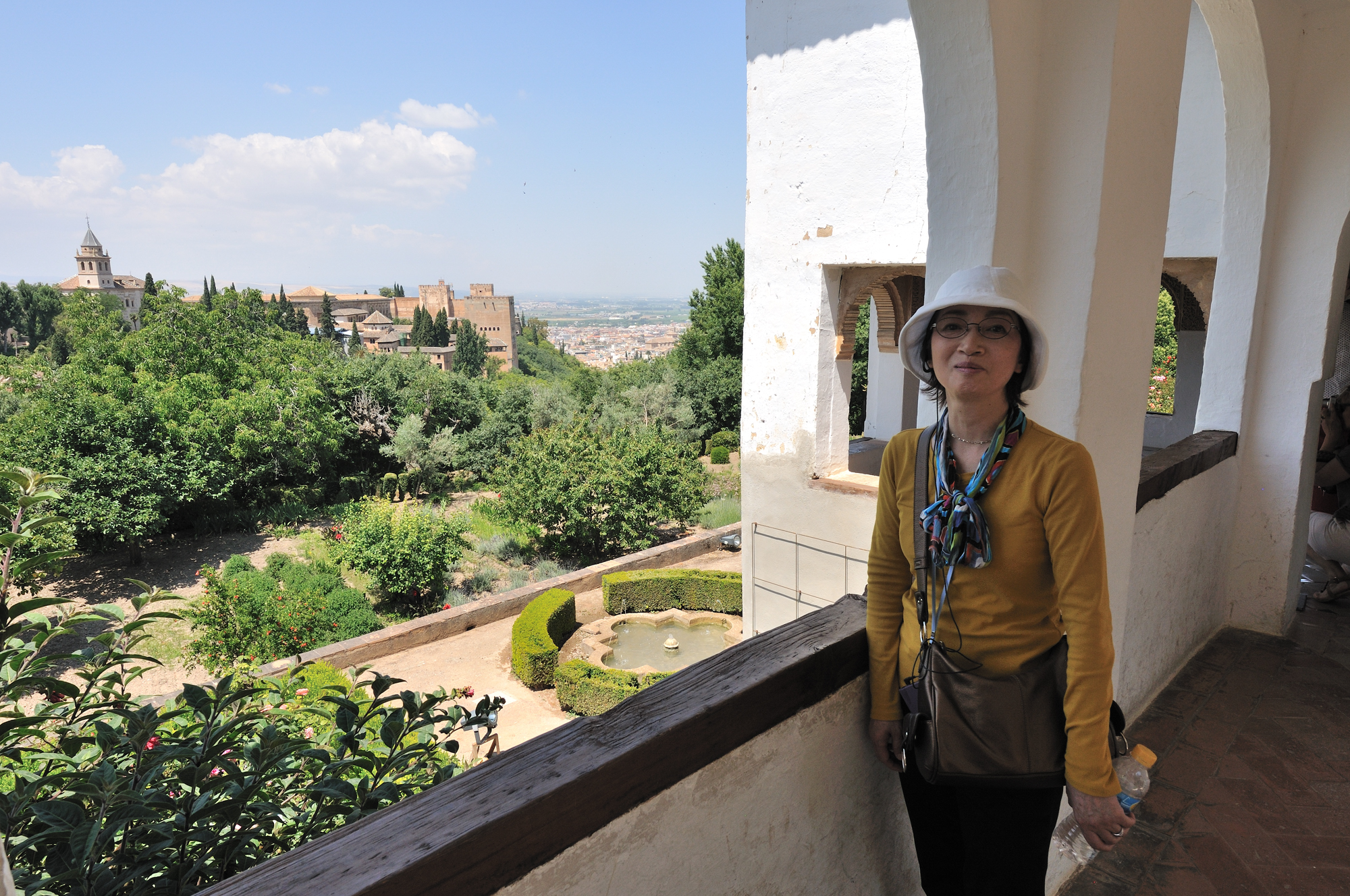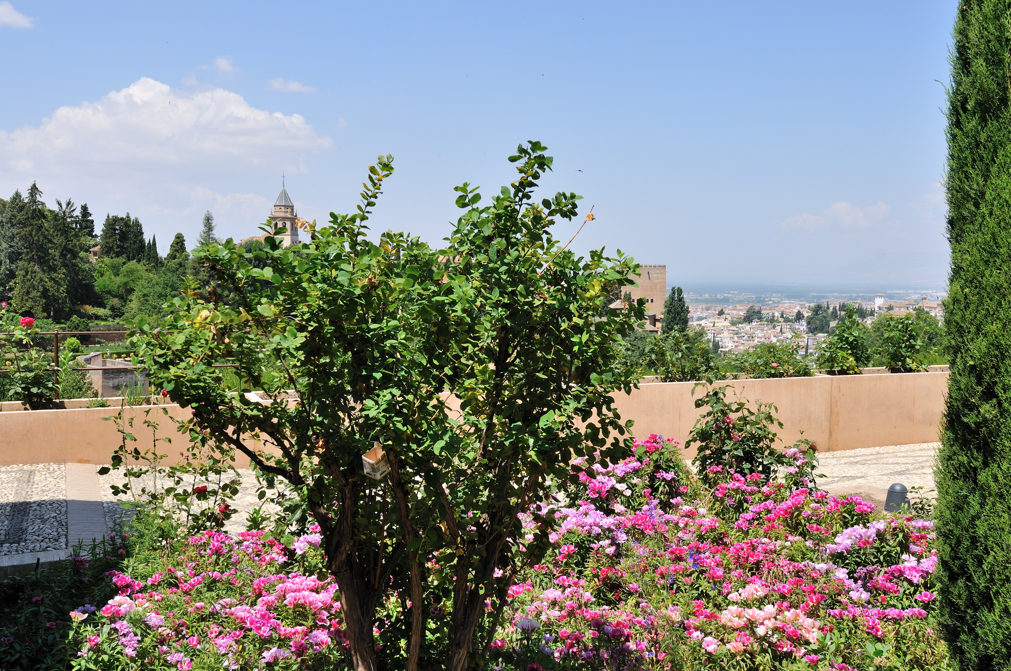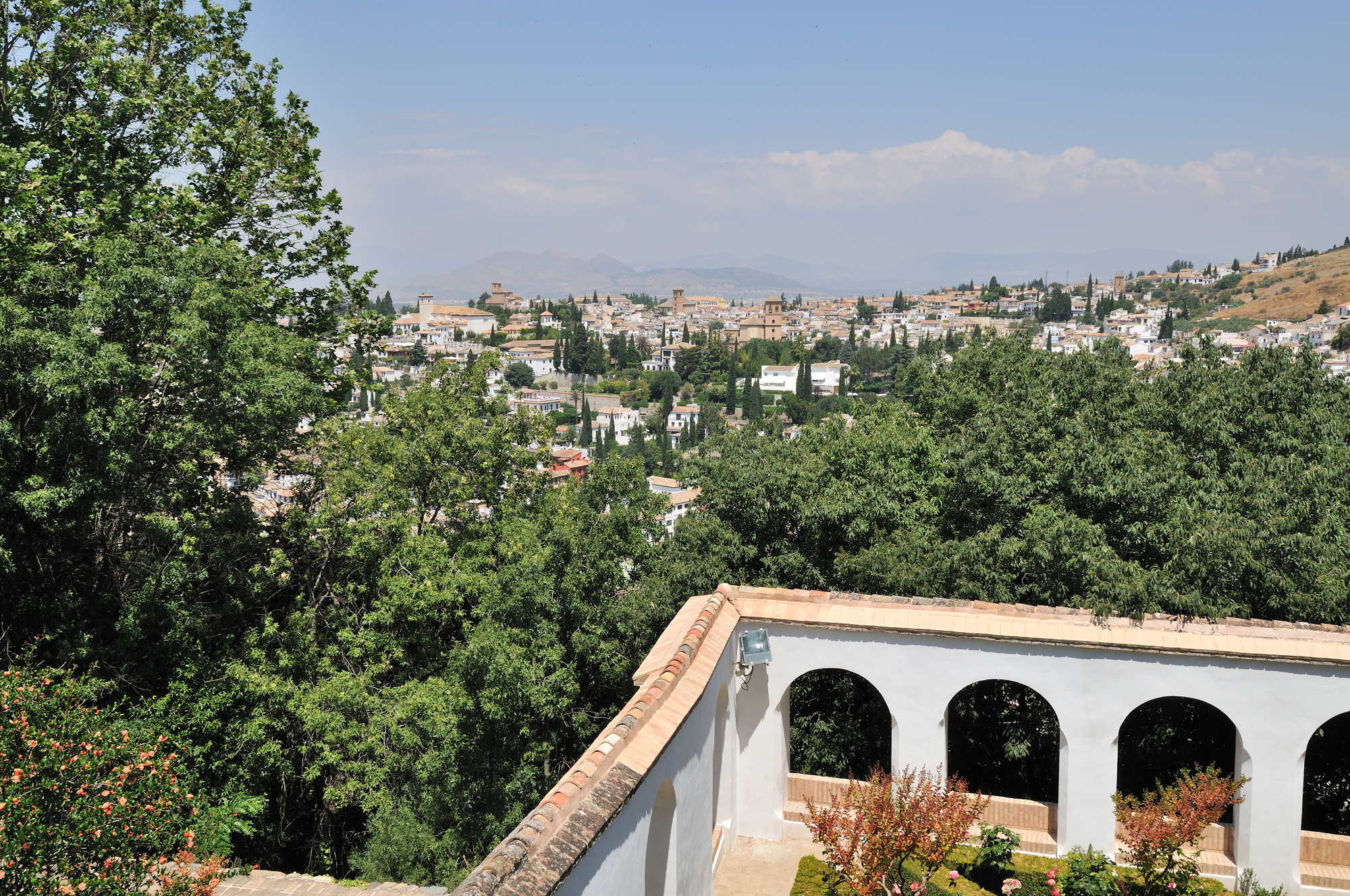 | ヘネラリフェのある太陽の丘からの眺望 (12:48) 左に見える塔は「囚われの貴婦人の塔」、遠くに見える市街はアルバイシン地区。 「西北西方向」MAP Lay. 2 P |