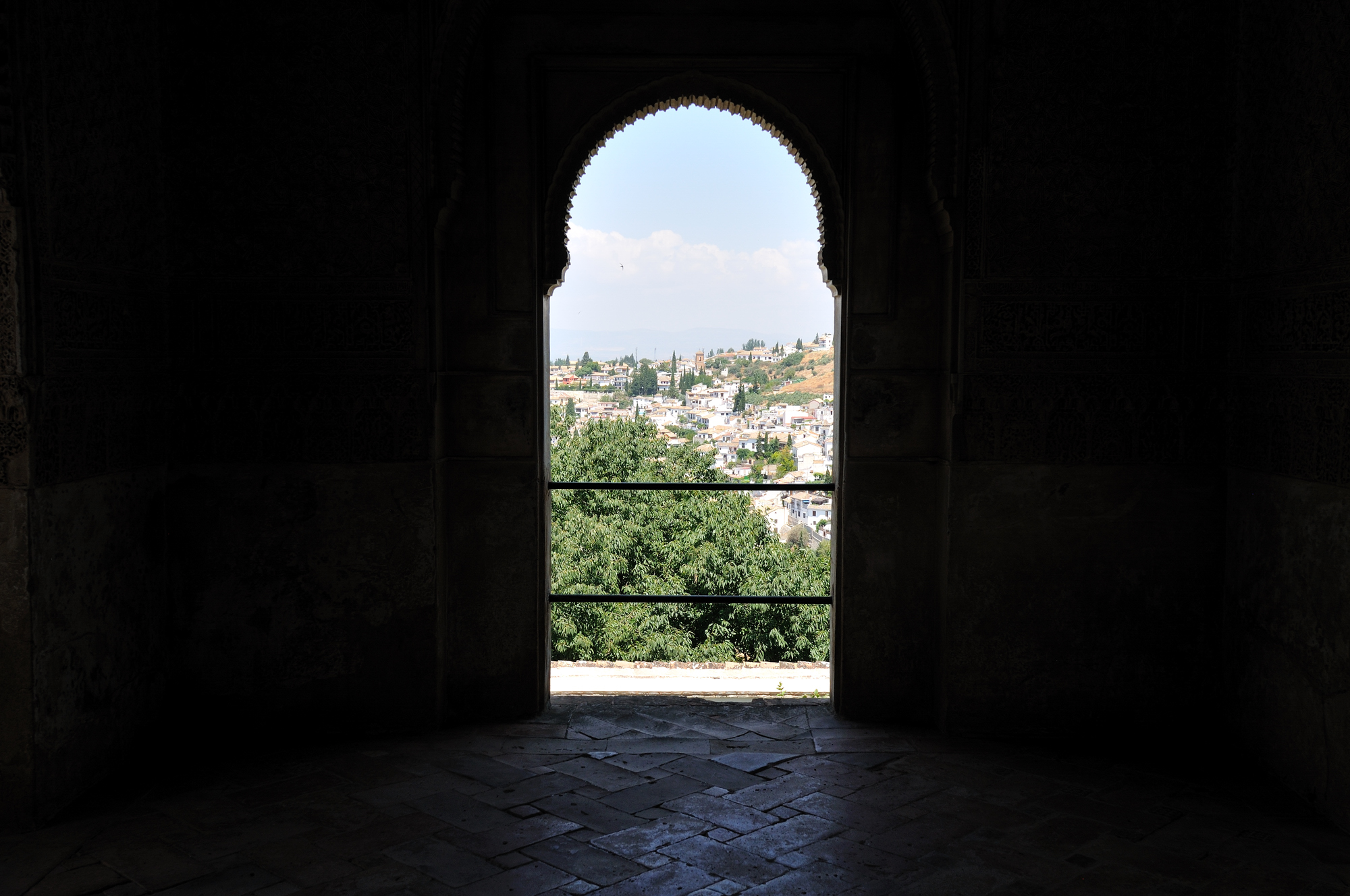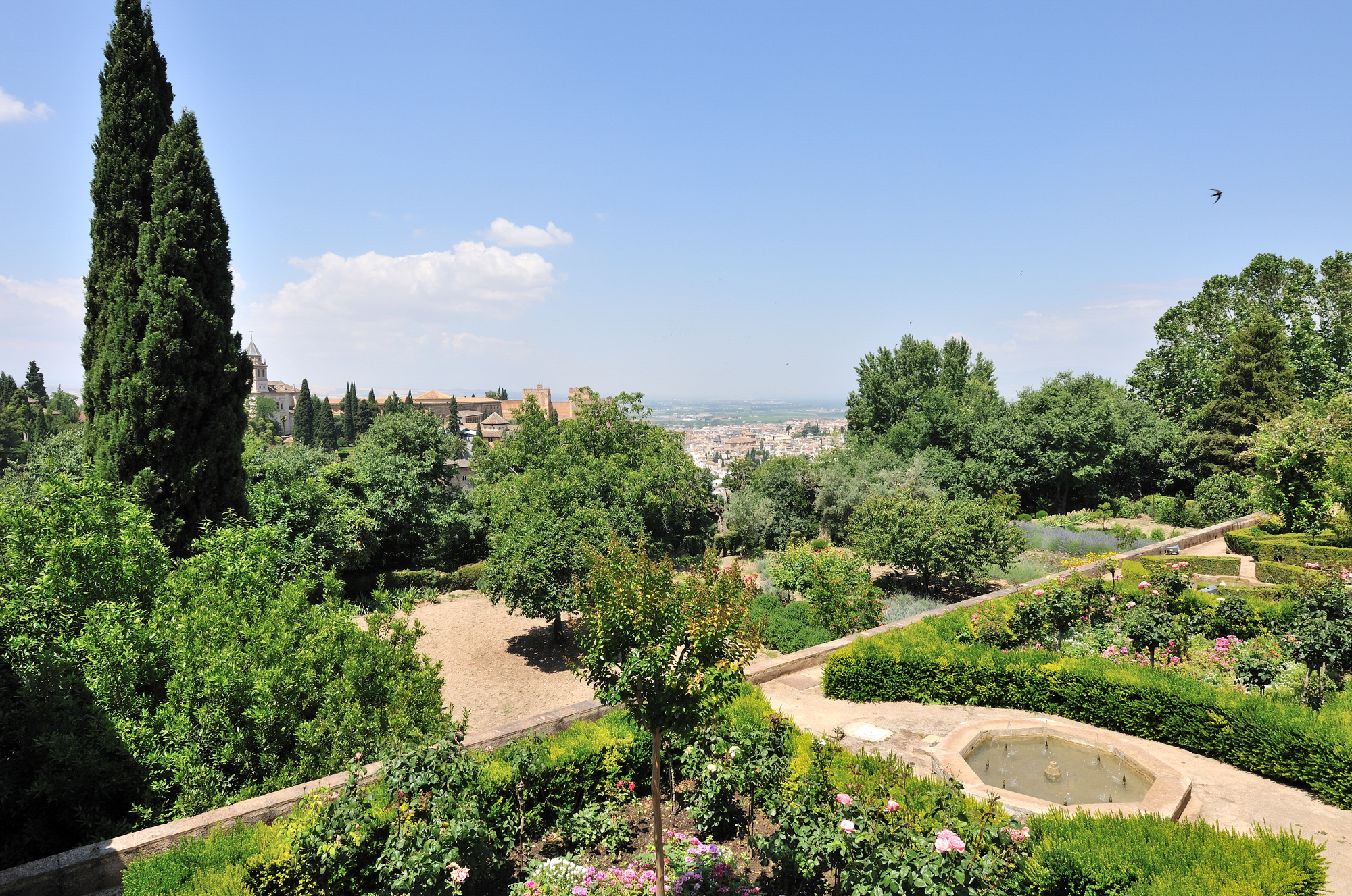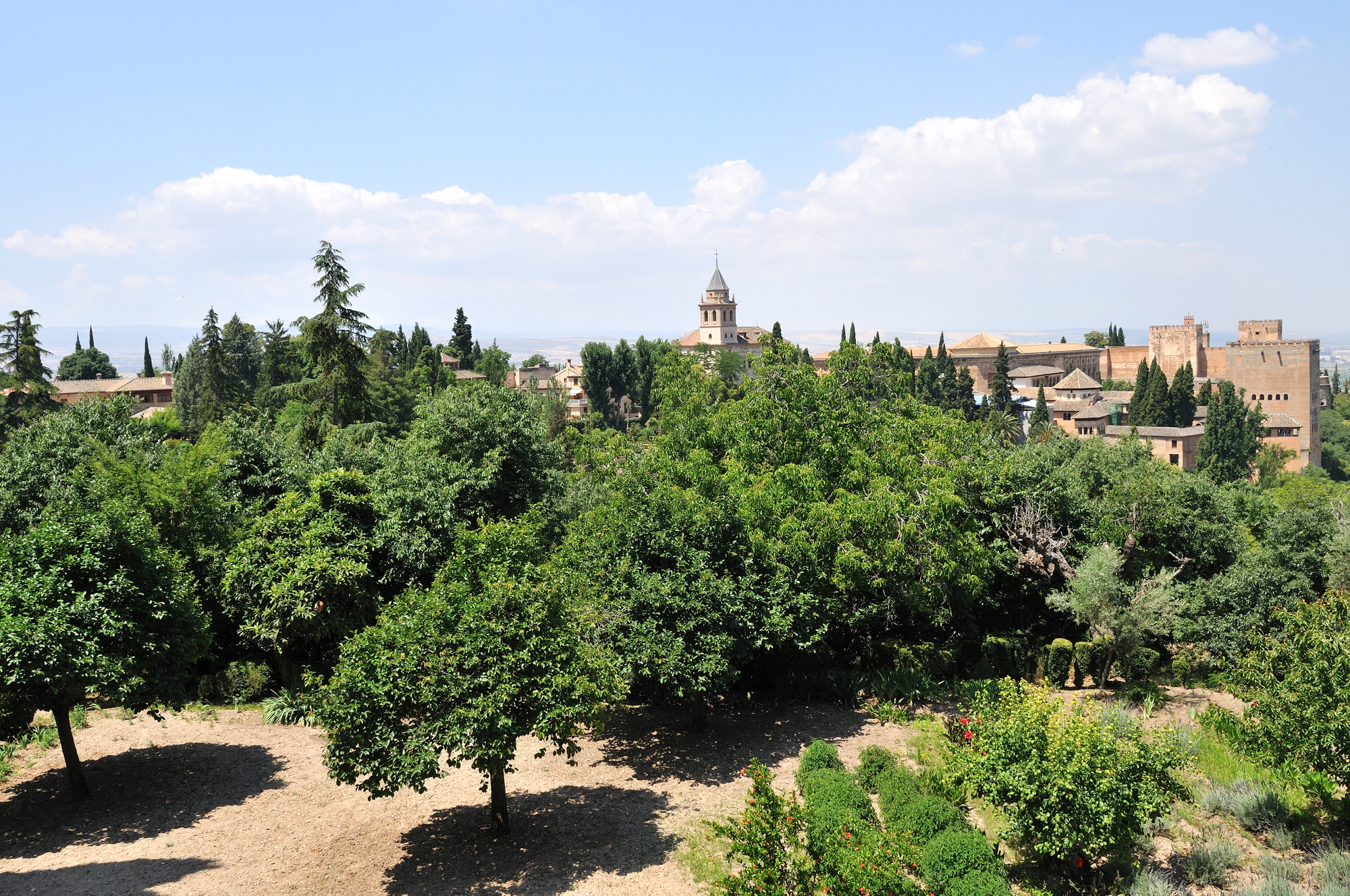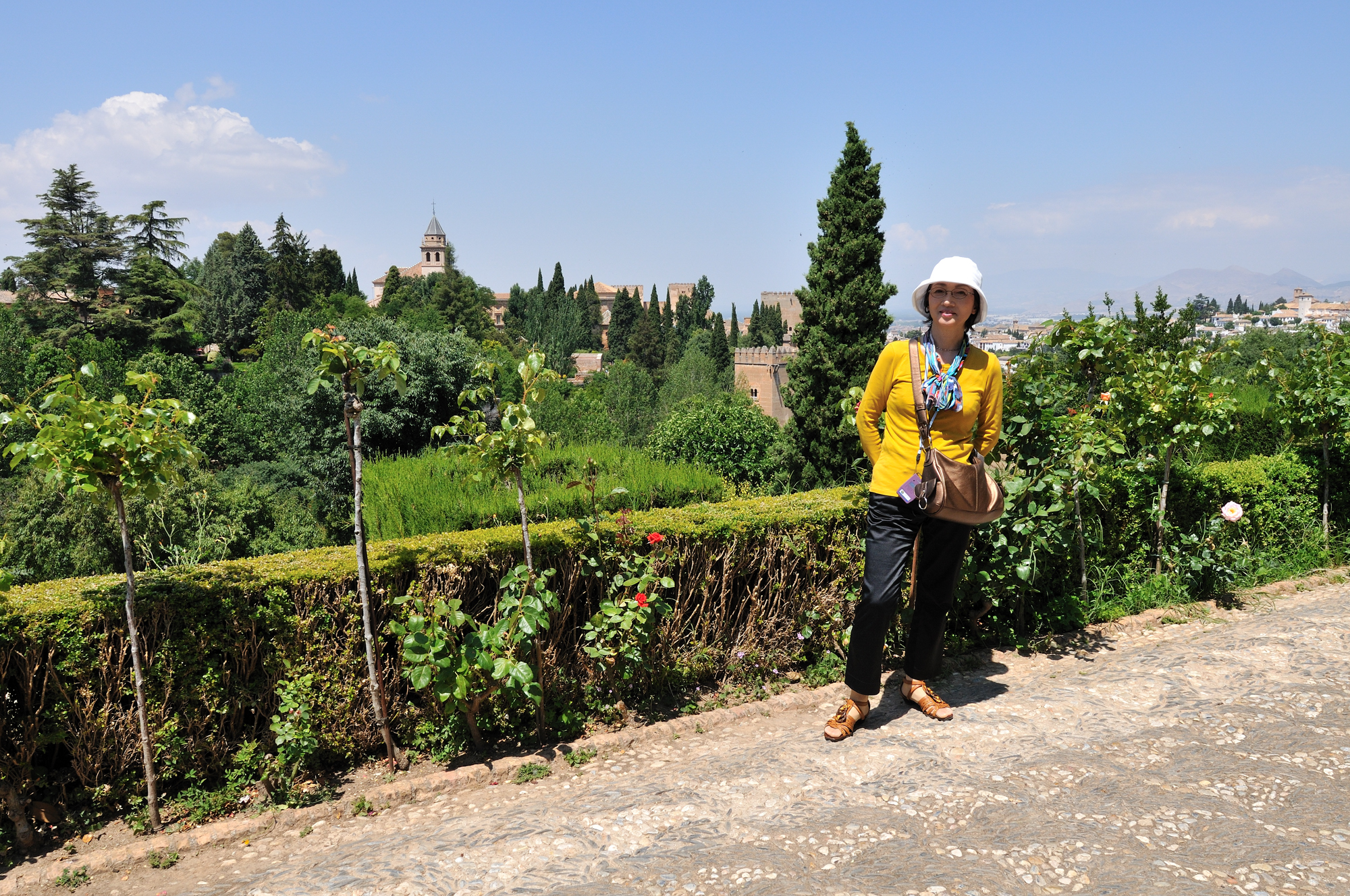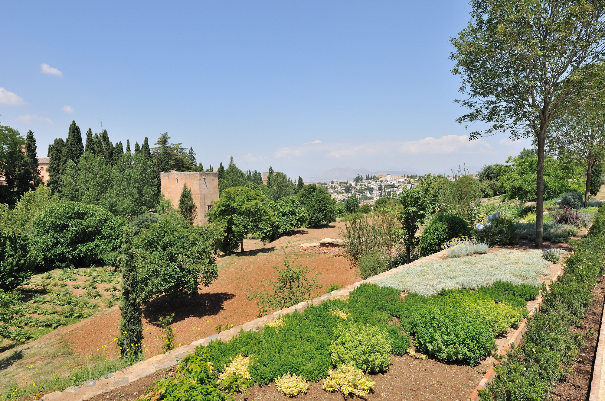 | ヘネラリフェのある太陽の丘からの眺望 (12:48) 左に見える塔は「囚われの貴婦人の塔」、遠くに見える市街はアルバイシン地区。 「西北西方向」MAP Lay. 2 P |