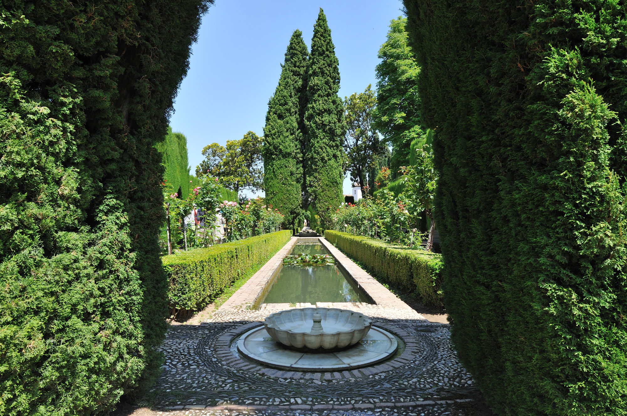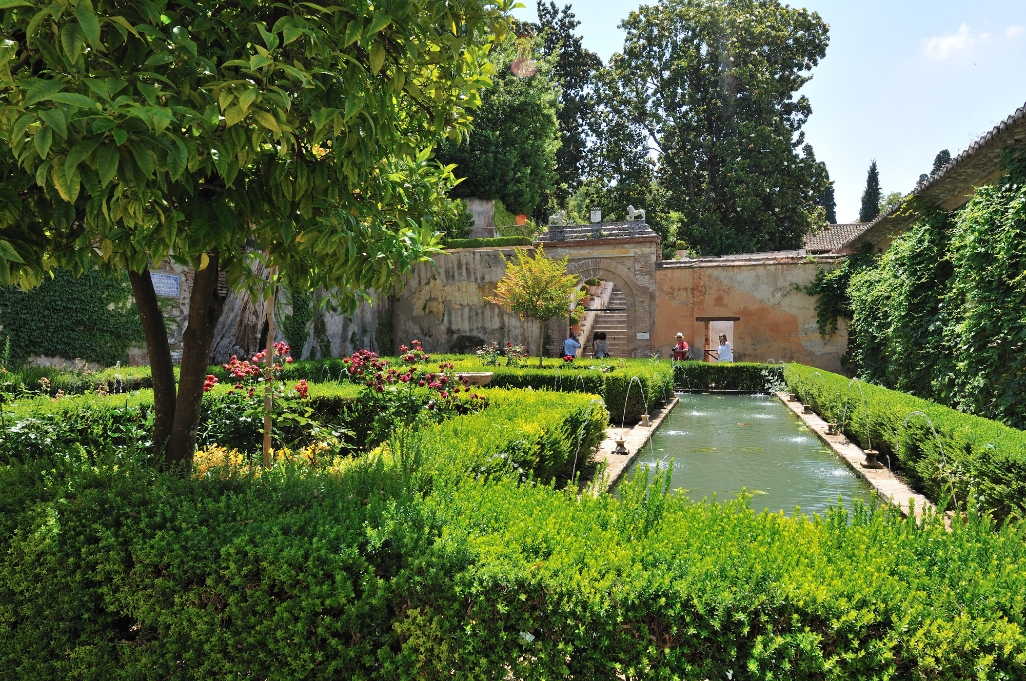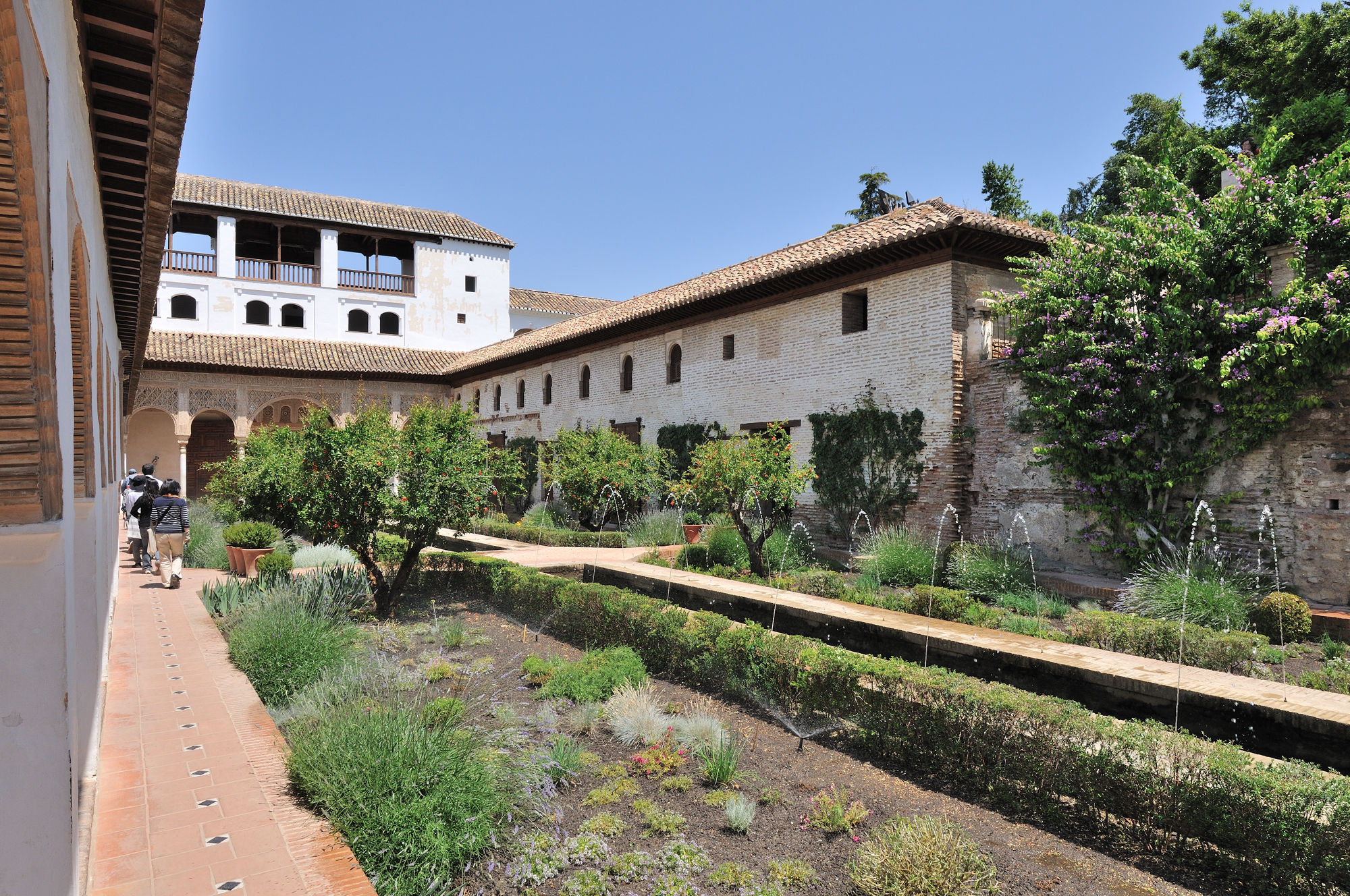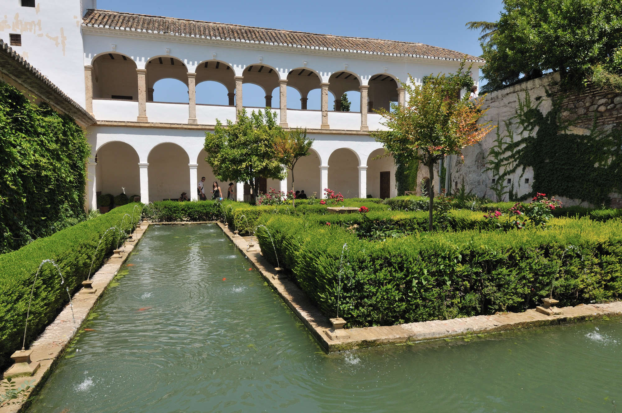 | ヘネラリフェのアセキア (堀割)の中庭 [Patio de la Acequia] (13:00) イスラム様式を代表する庭園で、かつて太陽の丘にはいくつもの庭園があったが、唯一残されたのが最も美しいヘネラリフェ庭園である。中央に約50mのアセキア (堀割)があり、その両脇に噴水がある。庭園内の水路や噴水の水はシエラ・ネバダ山脈の雪解け水が使用されている。イスラム様式の庭園は砂漠の民であるイスラム教徒の憧れである緑陰と果実、そして水が重要な構成要素になっている。 「南東方向」MAPLay. 2 Y |