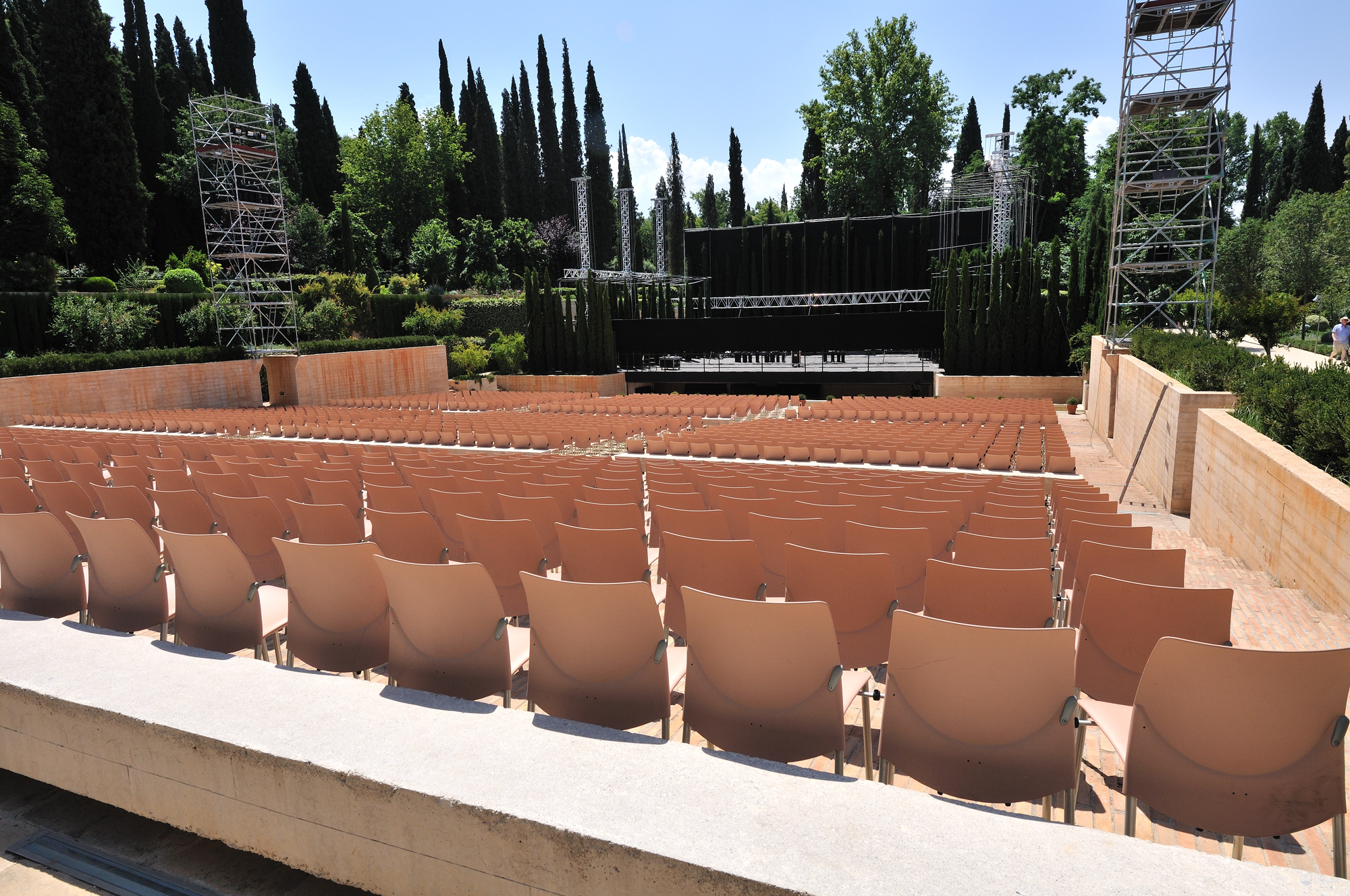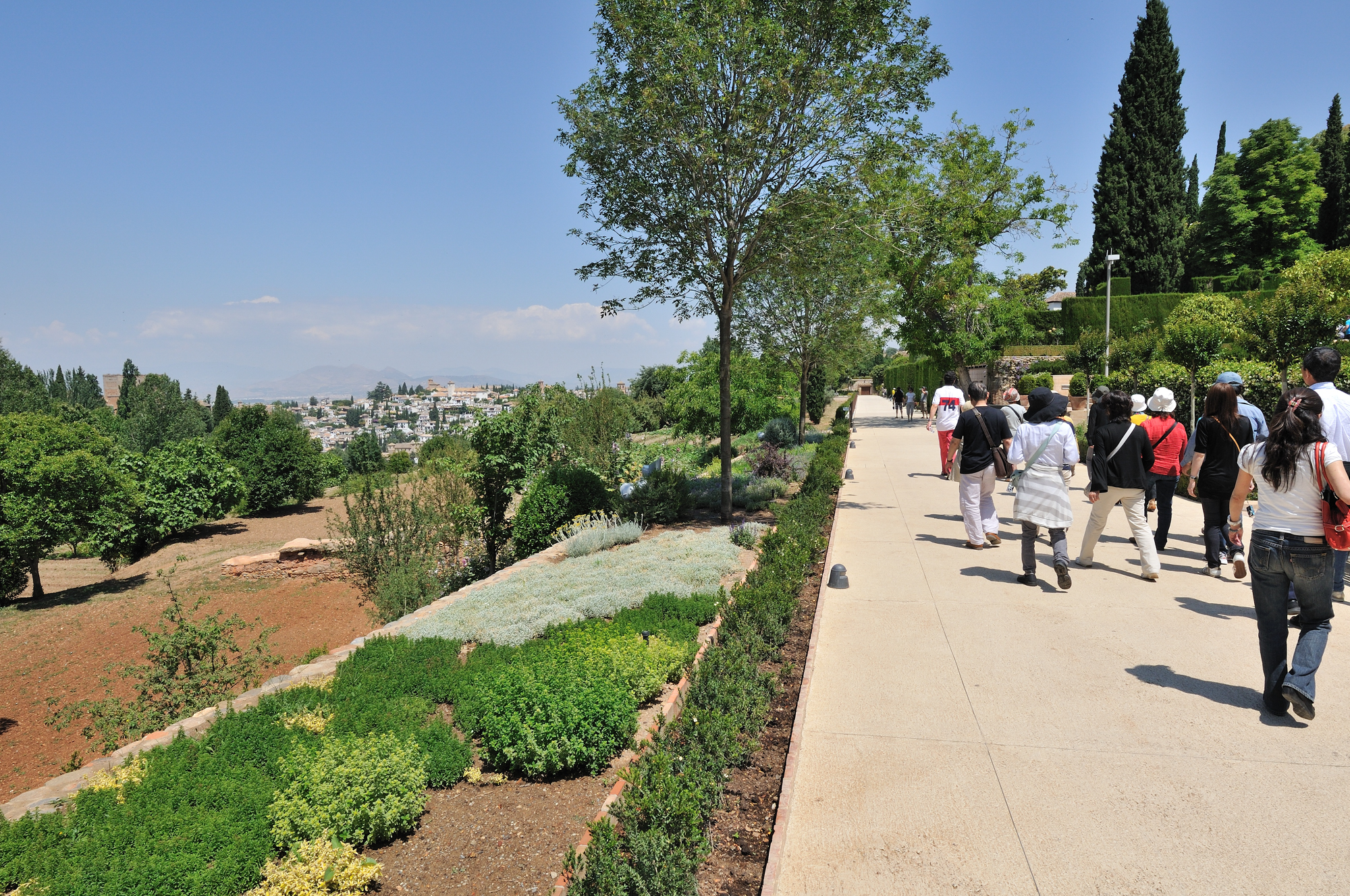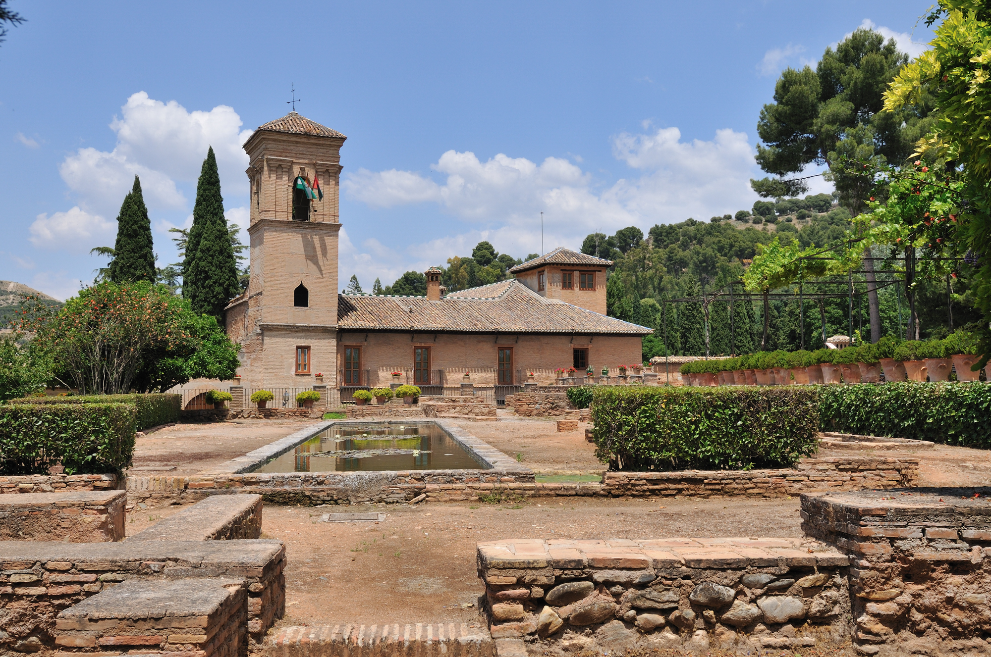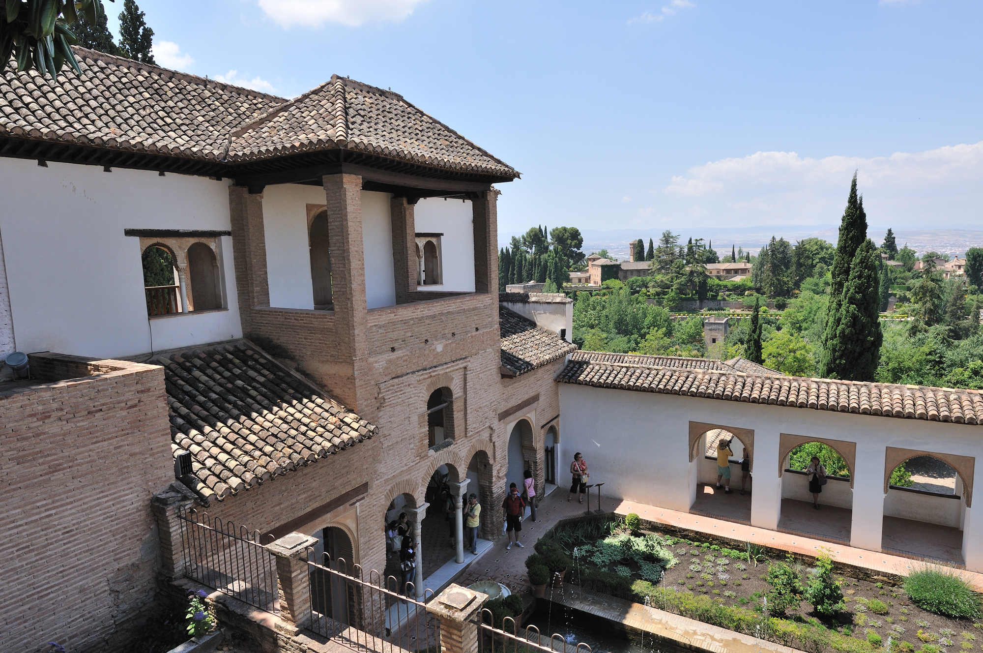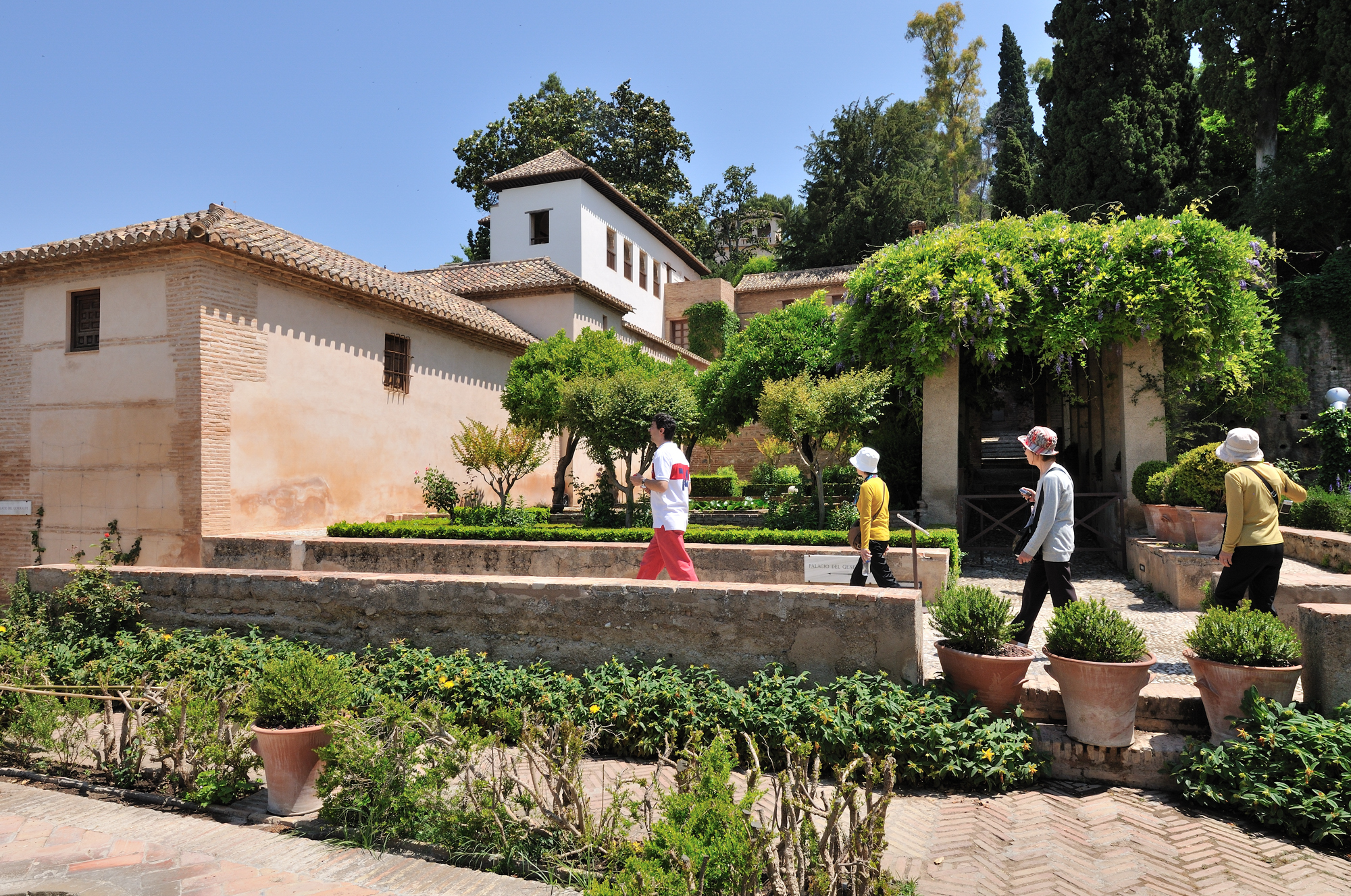 | ヘネラリフェのアセキア (堀割)の中庭 [Patio de la Acequia] (13:00) イスラム様式を代表する庭園で、かつて太陽の丘にはいくつもの庭園があったが、唯一残されたのが最も美しいヘネラリフェ庭園である。中央に約50mのアセキア (堀割)があり、その両脇に噴水がある。庭園内の水路や噴水の水はシエラ・ネバダ山脈の雪解け水が使用されている。イスラム様式の庭園は砂漠の民であるイスラム教徒の憧れである緑陰と果実、そして水が重要な構成要素になっている。 「南東方向」MAPLay. 2 Y |