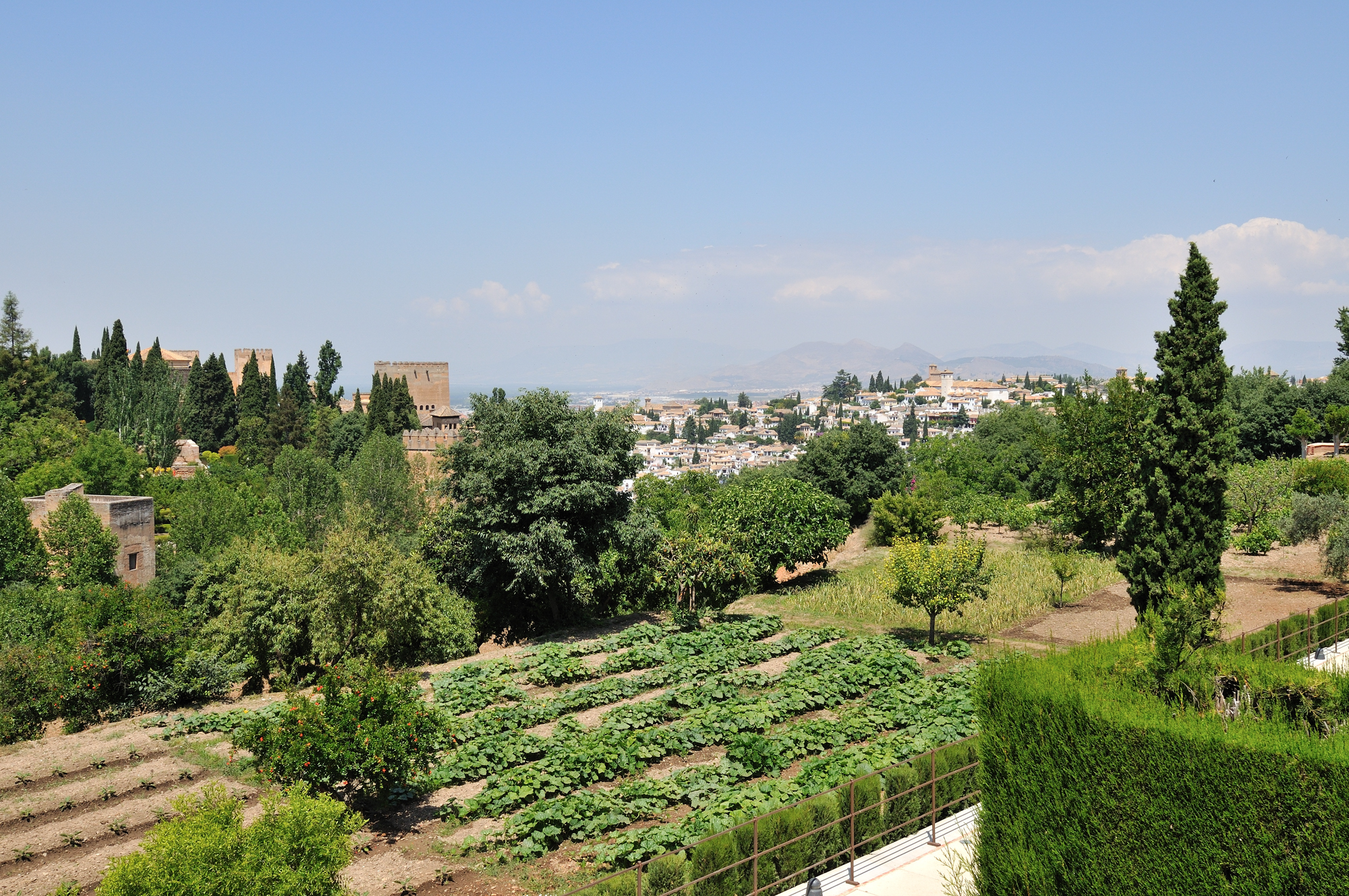 | ヘネラリフェ離宮 [Palacio del Generalife] の回廊からの眺め (12:58) アルハンブラ宮殿、そのずっと下方にグラナダ市とベガ (沃野)*が広がっている。 *ベガ [Vega] は、アラビア語のBekahに由来する言葉で、丘陵地の間に開けた広大な 沃野は、地味の肥えた、作物のよくできる平野を意味する。 「西方向」MAPLay. 2 W |