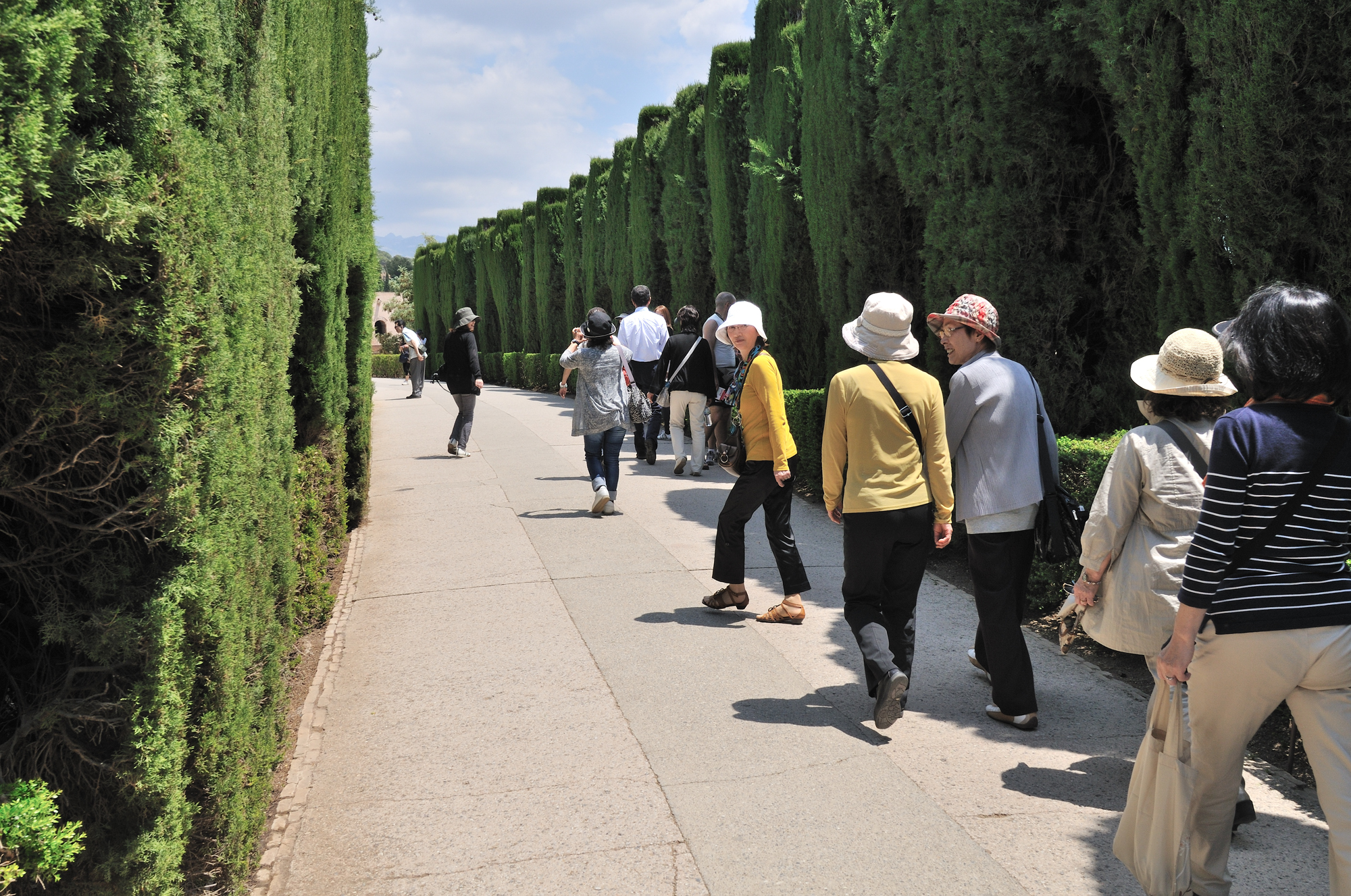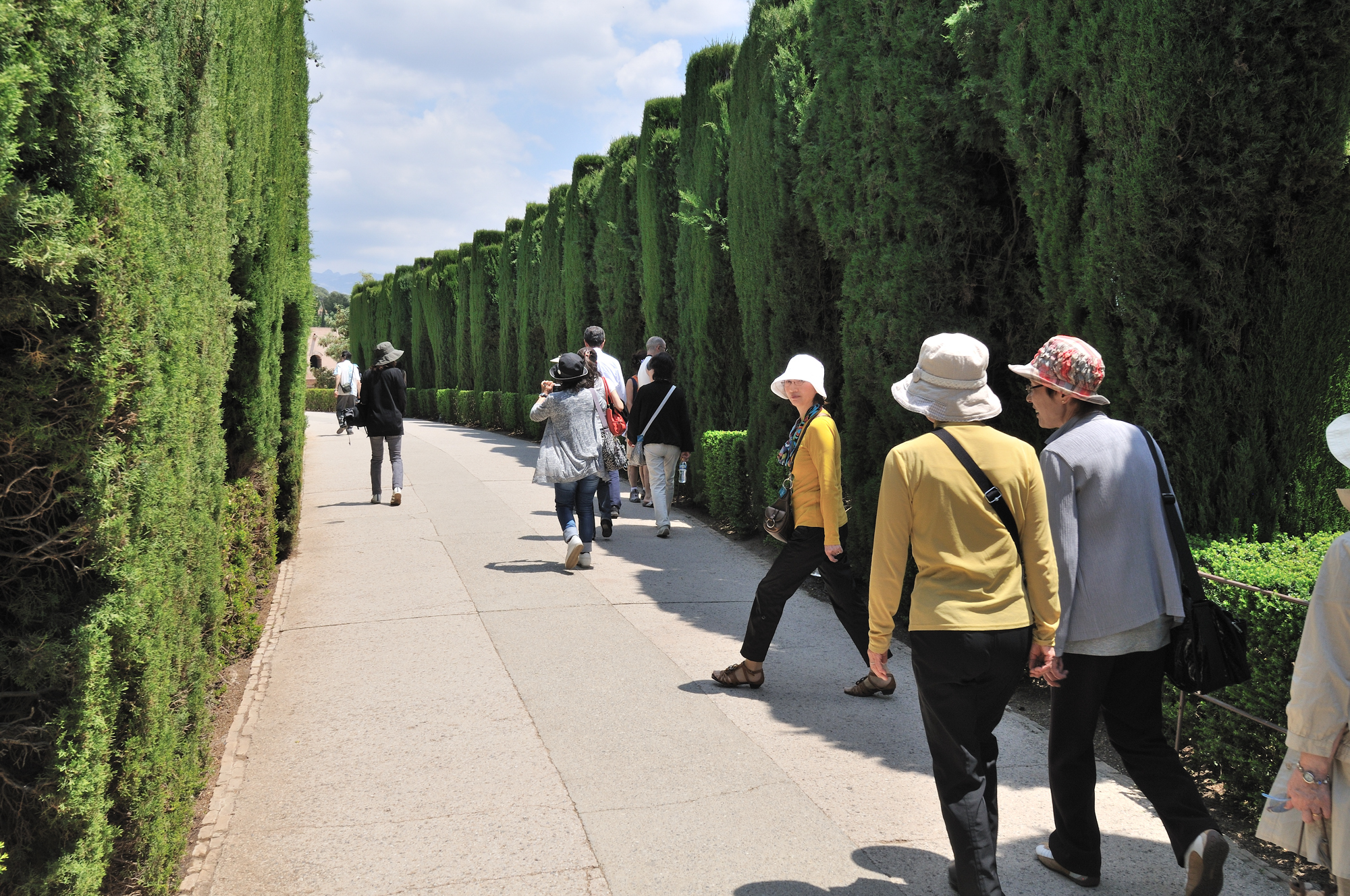 | ヘネラリフェ離宮への庭園遊歩道 (12:50) 糸杉、バラなどの低木、草花、水路、噴水などであしらった庭園。 「北北西方向」MAPLay. 2 R |