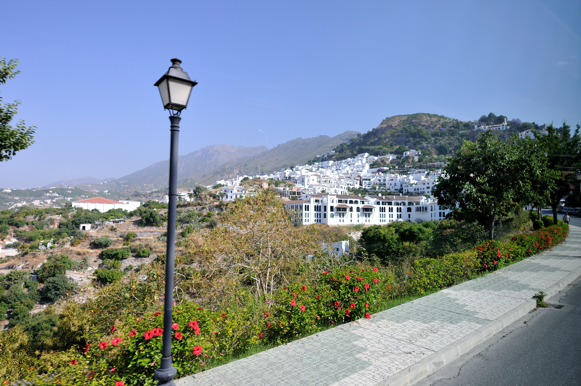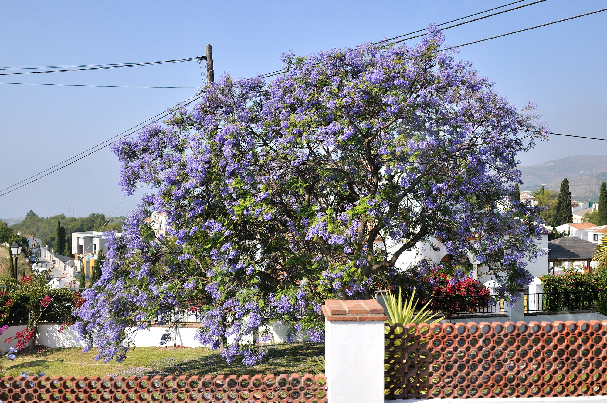 | フリヒリアナ [Frigiliana] の玄関口からの眺め (11:37) シャカランダ [Jacaranda] の木が紫色の花をつけているのが散見される。 「北方向」MAPLay. 1 i |