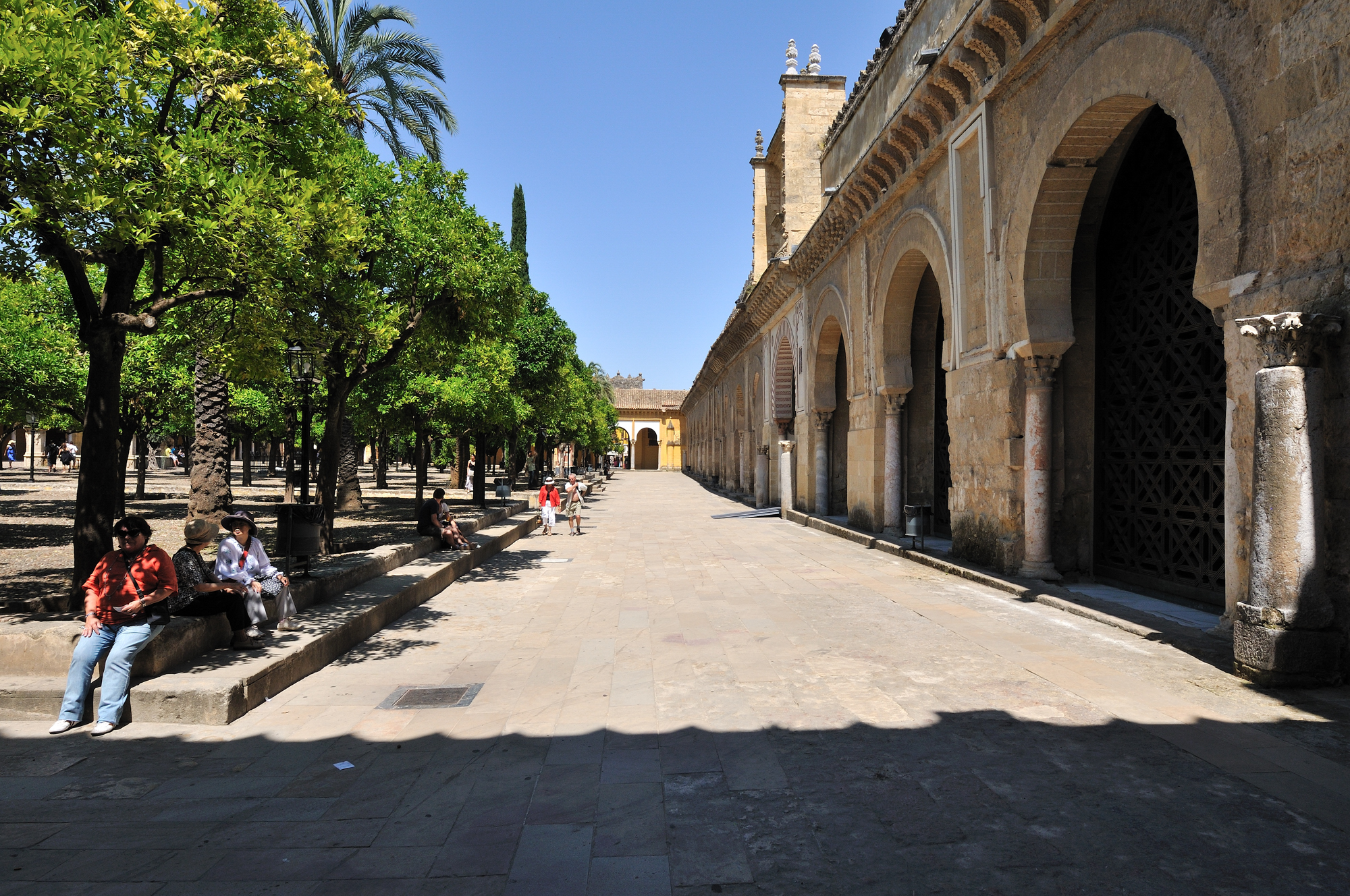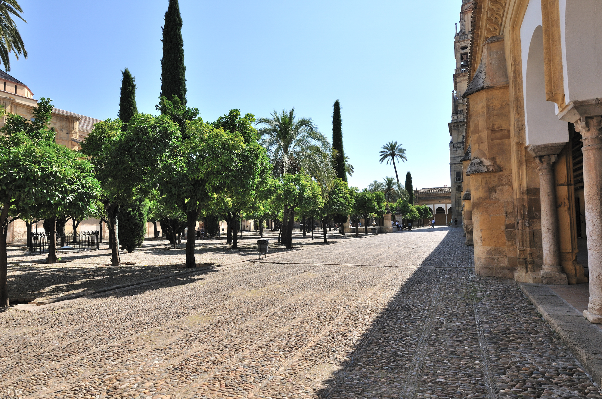 | オレンジの中庭 [Patio de los Naranjos] (16:11) イスラム様式の庭園は、コーランに描かれている楽園のイメージを具現化したものと言われている。楽園のイメージを要約すると「そこには腐ることのない水を湛える川、味の変ることのない乳の川、飲む者に快い美酒の川、純良な蜜の川がある。またそこでは、凡ての種類の果実と、主からの御赦しを賜る」となる。このオレンジの中庭も「楽園のイメージ」に基づいて造られているのかも知れない。 みそぎのために必要な水は、当初中庭にあった手掘りの井戸から汲み上げていたらしいが、今ではもう存在しない。 また、第2代カリフ、アルハカム2世の時代には山岳の泉から中庭の水盤まで導水路が引かれたが、やはり残されていない。 なお、オレンジの中庭という現在の名前は、15世紀からこの場に欠かしたことのないオレンジの樹に由来する。以前はヤシの樹があったらしく、18世紀以降は糸杉とオリーブも加わった。 「東北東方向」MAPLay. 2 P |