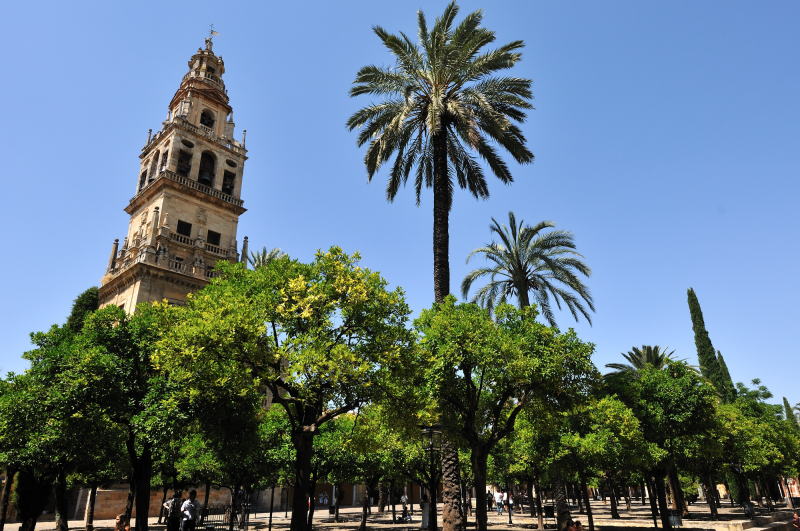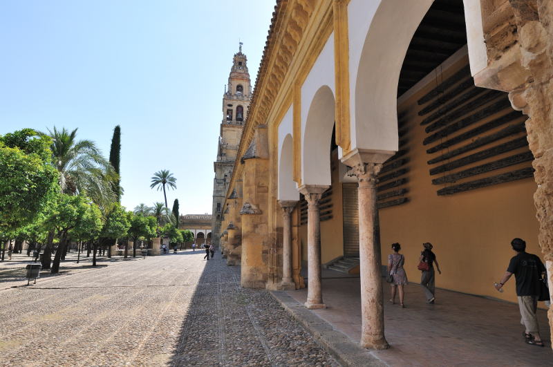 | オレンジの中庭 [Patio de los Naranjos] (16:13) 左に見える塔は、ミナレット [Minaret] *で、アルミナールの塔 [Torre del Alminar] とよばれている。アルミナールの塔からはイスラムの教義通り、ムアッジンとよばれる回教僧が、コルドバの信者に向かって日に5回アザーンという呼びかけの言葉を唱えた。 「北北東方向」MAPLay. 2 P * ミナレット [Minaret] とは、礼拝の時を告げたり、祝祭日には火をともしたりするモスクに付属した高い塔を意味する。 |