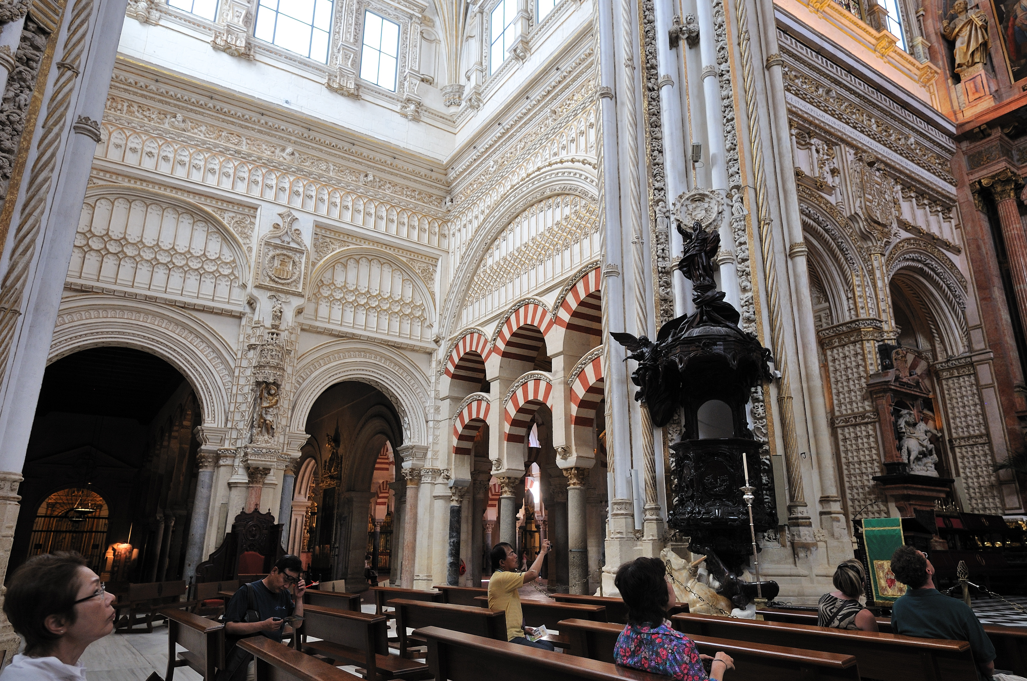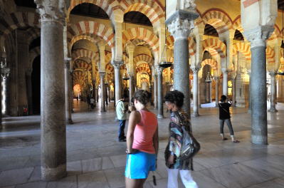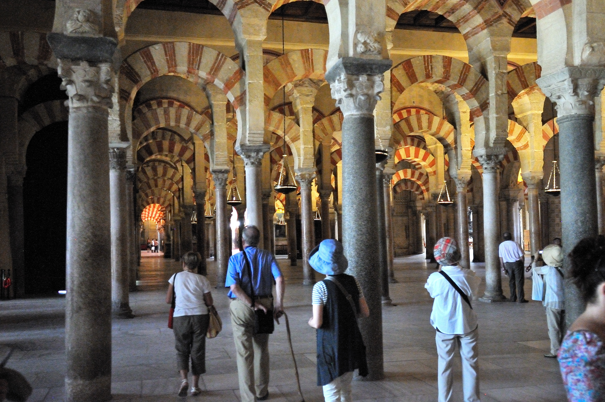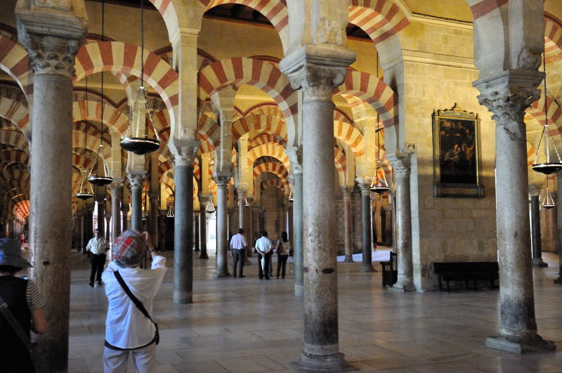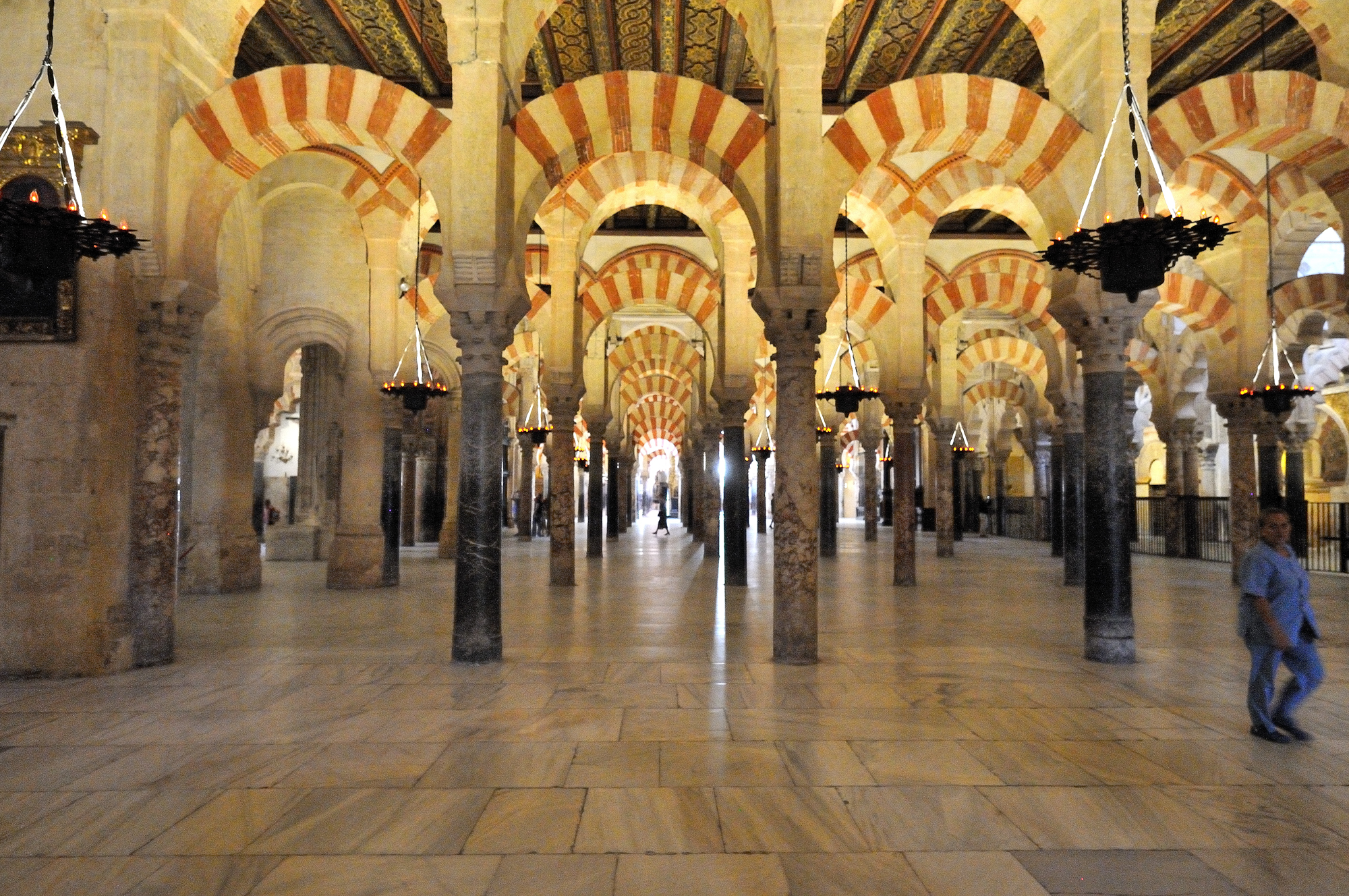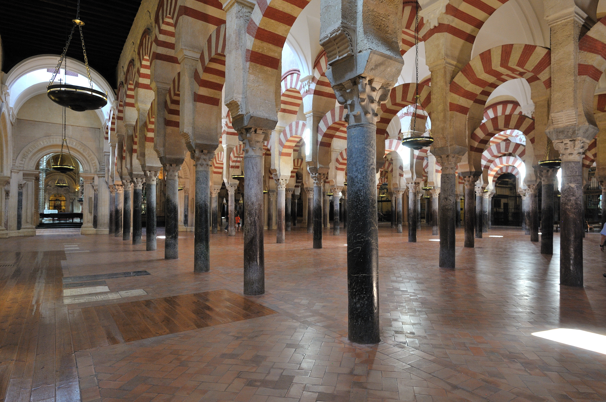 | 円柱の森 [Arco de los Bosque] (16:15) メスキータの建築構造の特徴は、円柱、付け柱、二重アーチの繁用である。二重アーチの上部のがっしりした半円形のアーチは事実上建物を支えており、下部の馬蹄形のアーチは支柱、あるいは心張り棒の役目を果たして、天井を高くするための解決法に寄与している。 メリダにある古代ローマの水道橋を参考にしたとされるこの2重アーチは、赤いレンガと白の石灰岩を交互に楔状に配した構成となっている。建築は786年9月頃に始まり、古い時代にあった建造物の柱を利用しながら工事が進められていった。様々な由来を持つ台石、柱幹、柱頭が再利用されたのはアブド・アッラフマーン1世の希望に沿ったものだと言われている。柱はそれぞれ独立した建築構造であるため、高さが揃うように、柱が短いものは高い柱頭を乗せたり、またその逆も試みたりした。同様に台石部分も長さが釣り合うように工夫された。 「東方向」図 A |